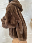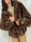 Eco pelliccia con cappuccio a pelo corto. Modello leggermente morbido a spalla scesa. Tasche laterali. Dettaglio fiore gioiello sulle maniche. Chiusura con ganci.