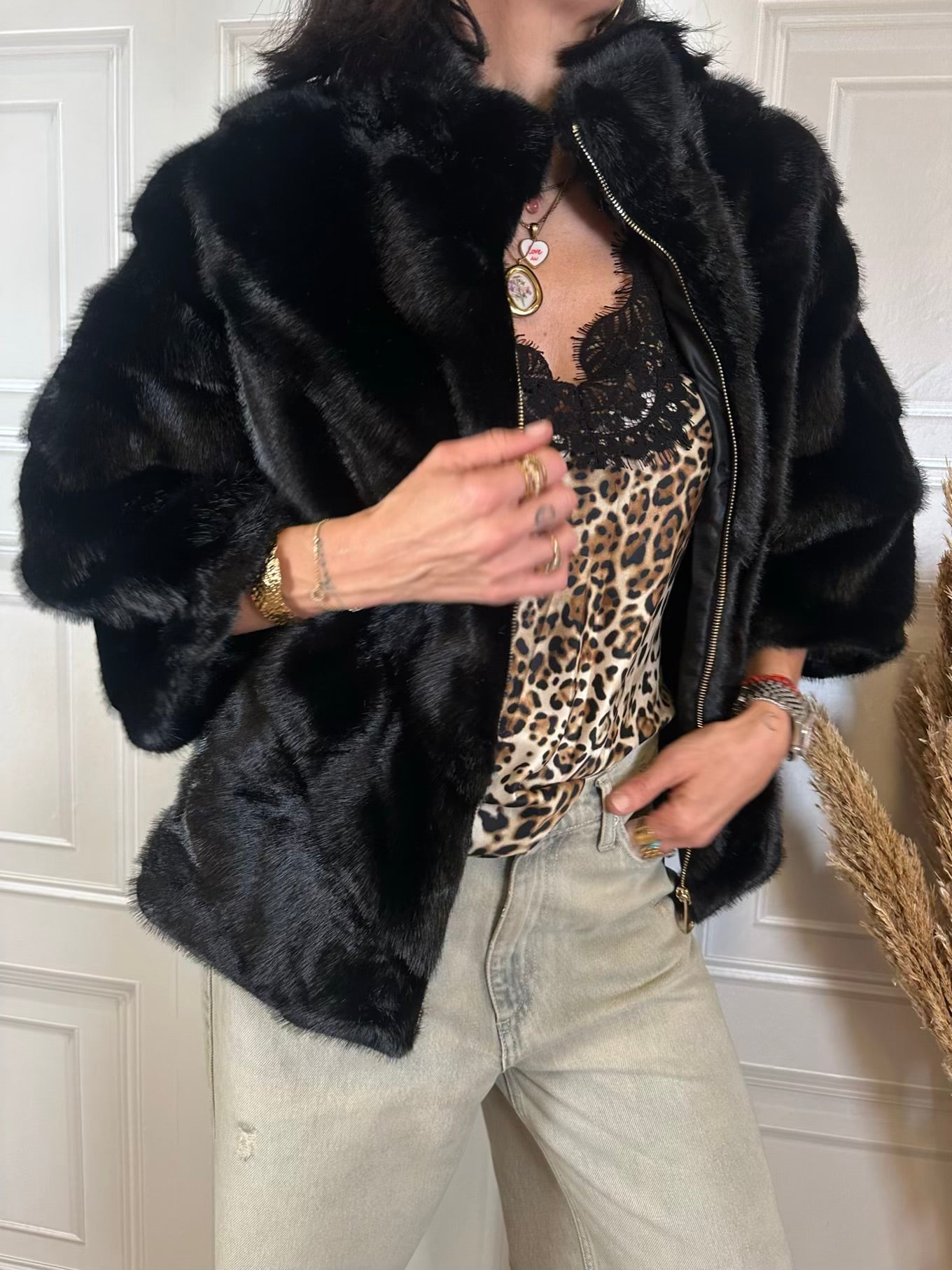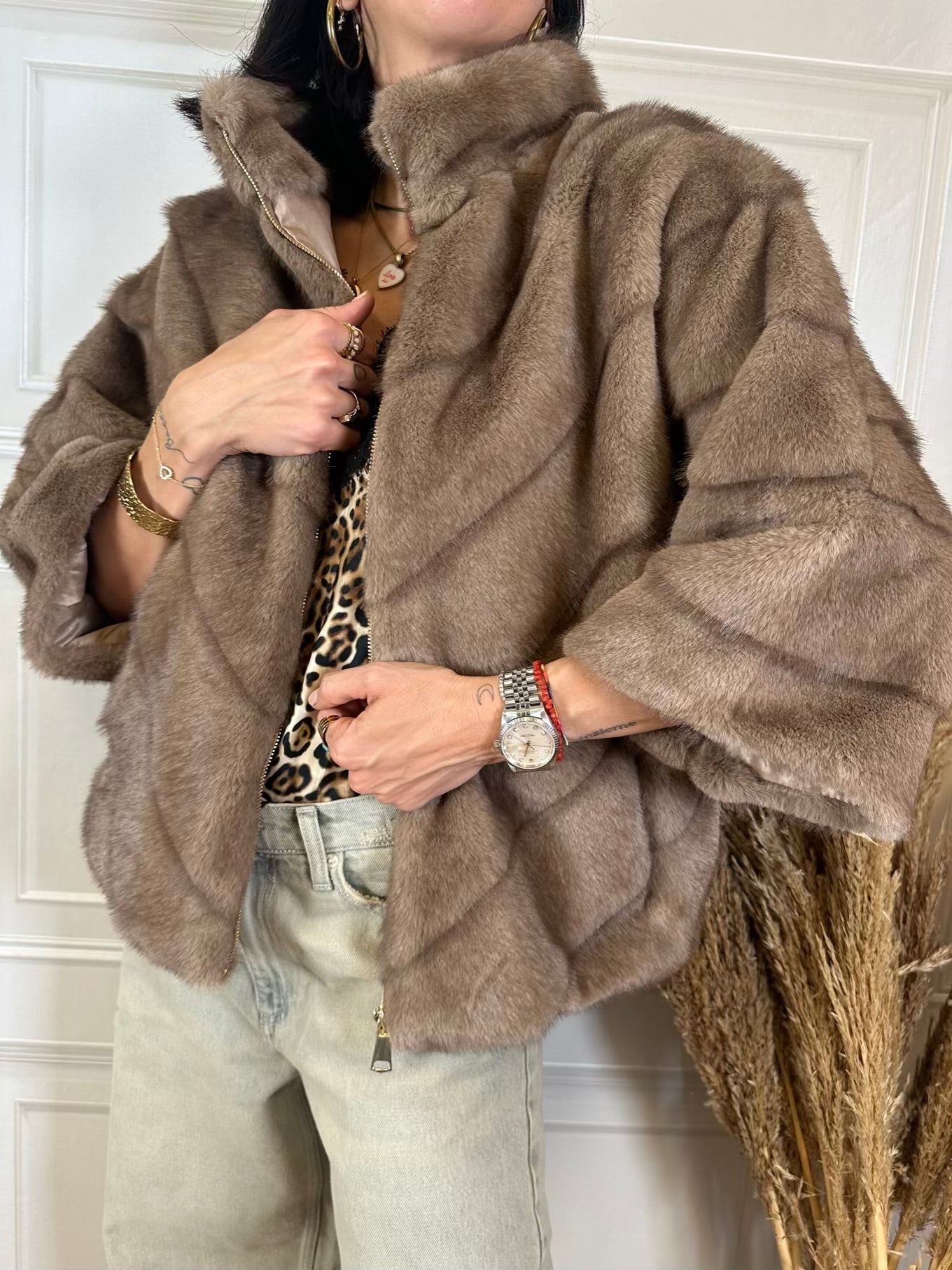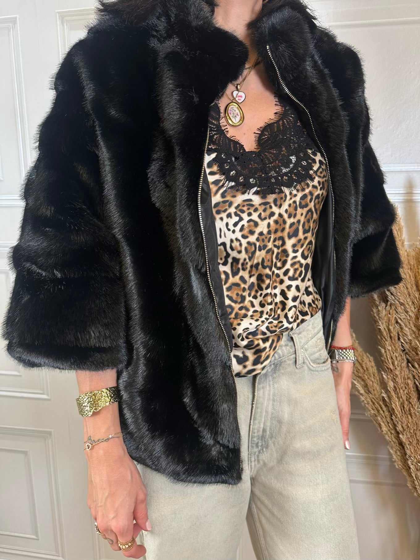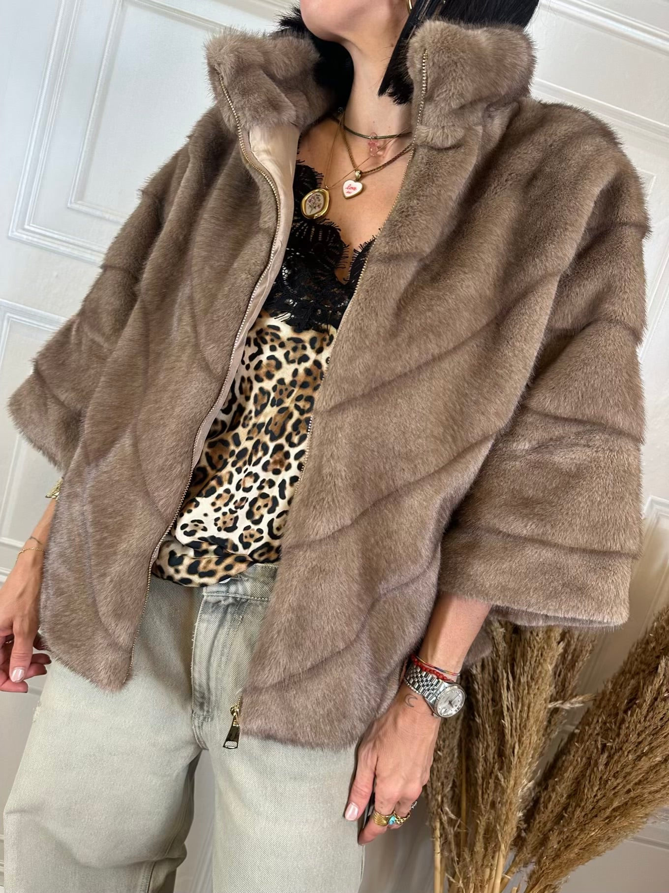 Eco pelliccia a pelo corto. Modello morbido, lunghezza regolare. Maniche a tre quarti. Chiusura con zip. Taglia unica.