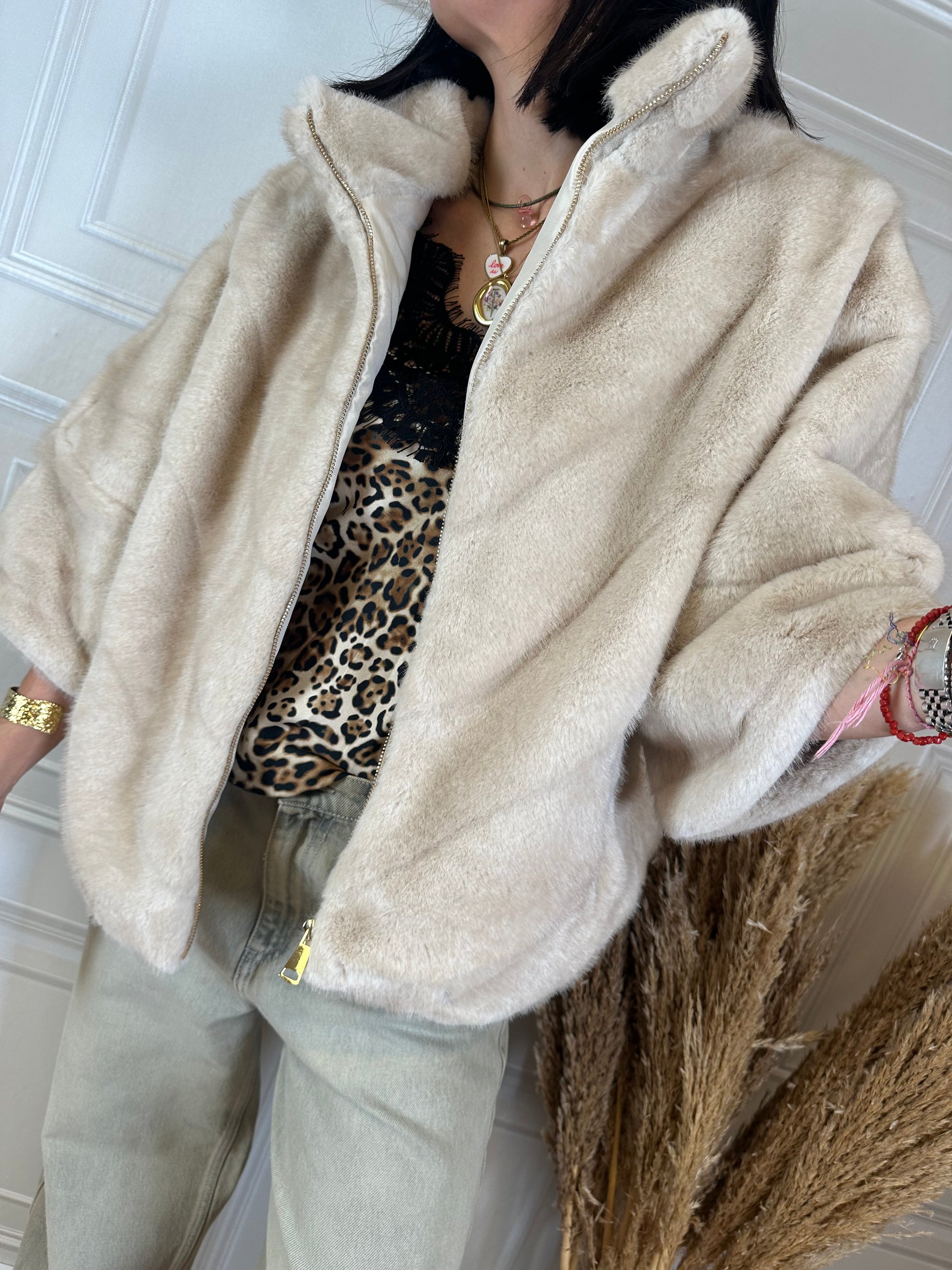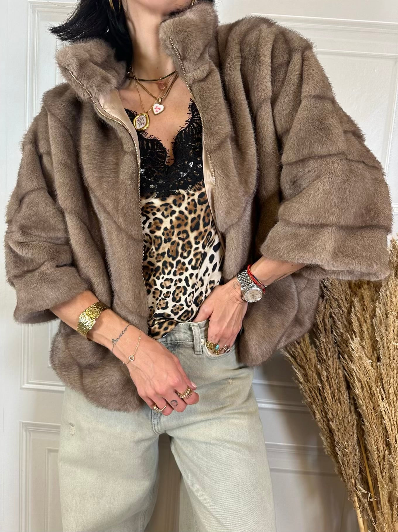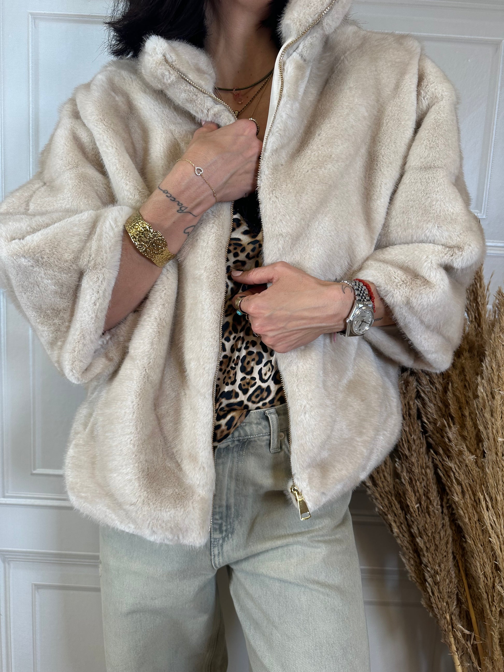 Eco pelliccia a pelo corto. Modello morbido, lunghezza regolare. Maniche a tre quarti. Chiusura con zip. Taglia unica.