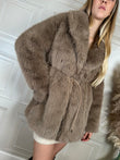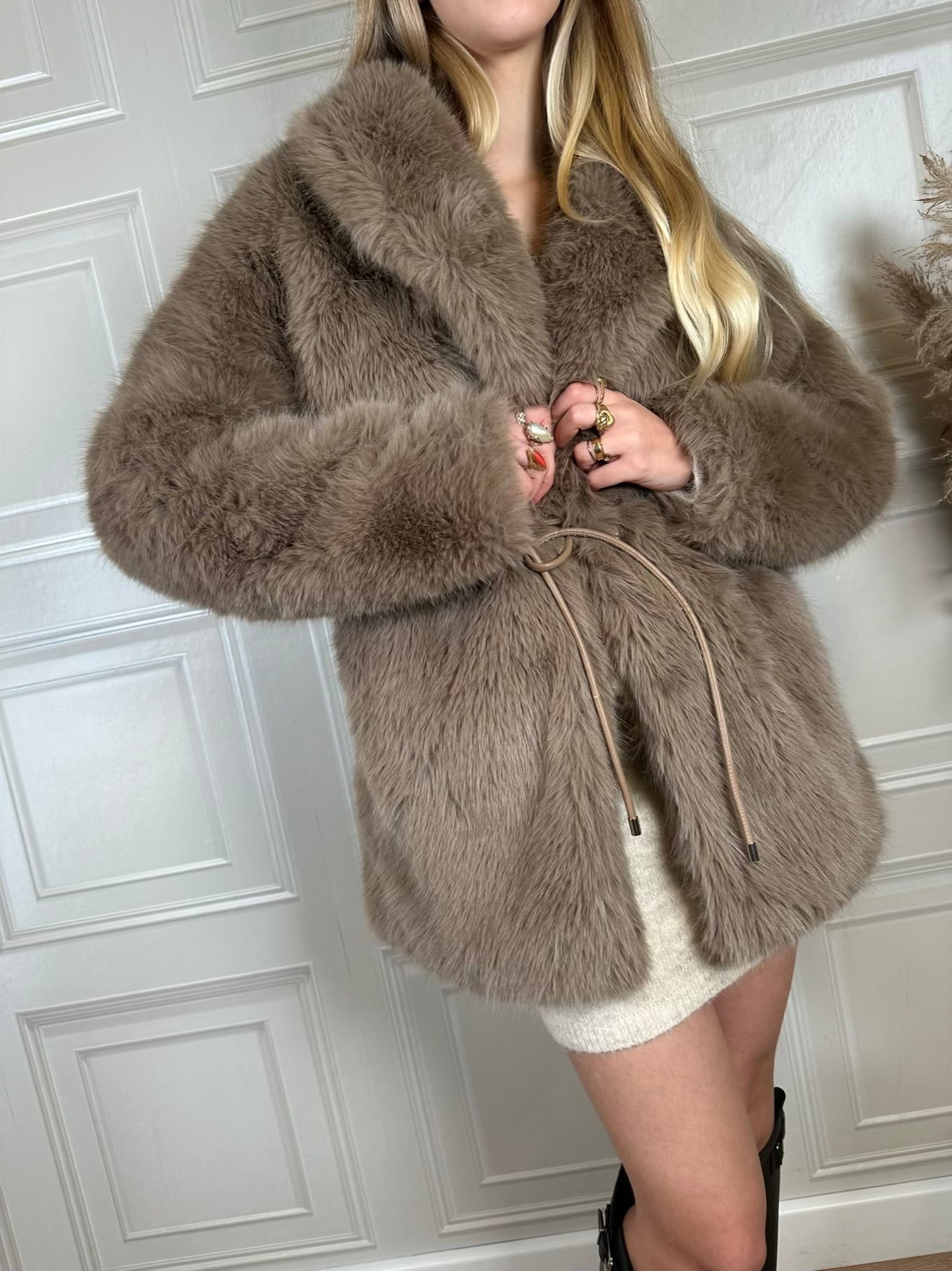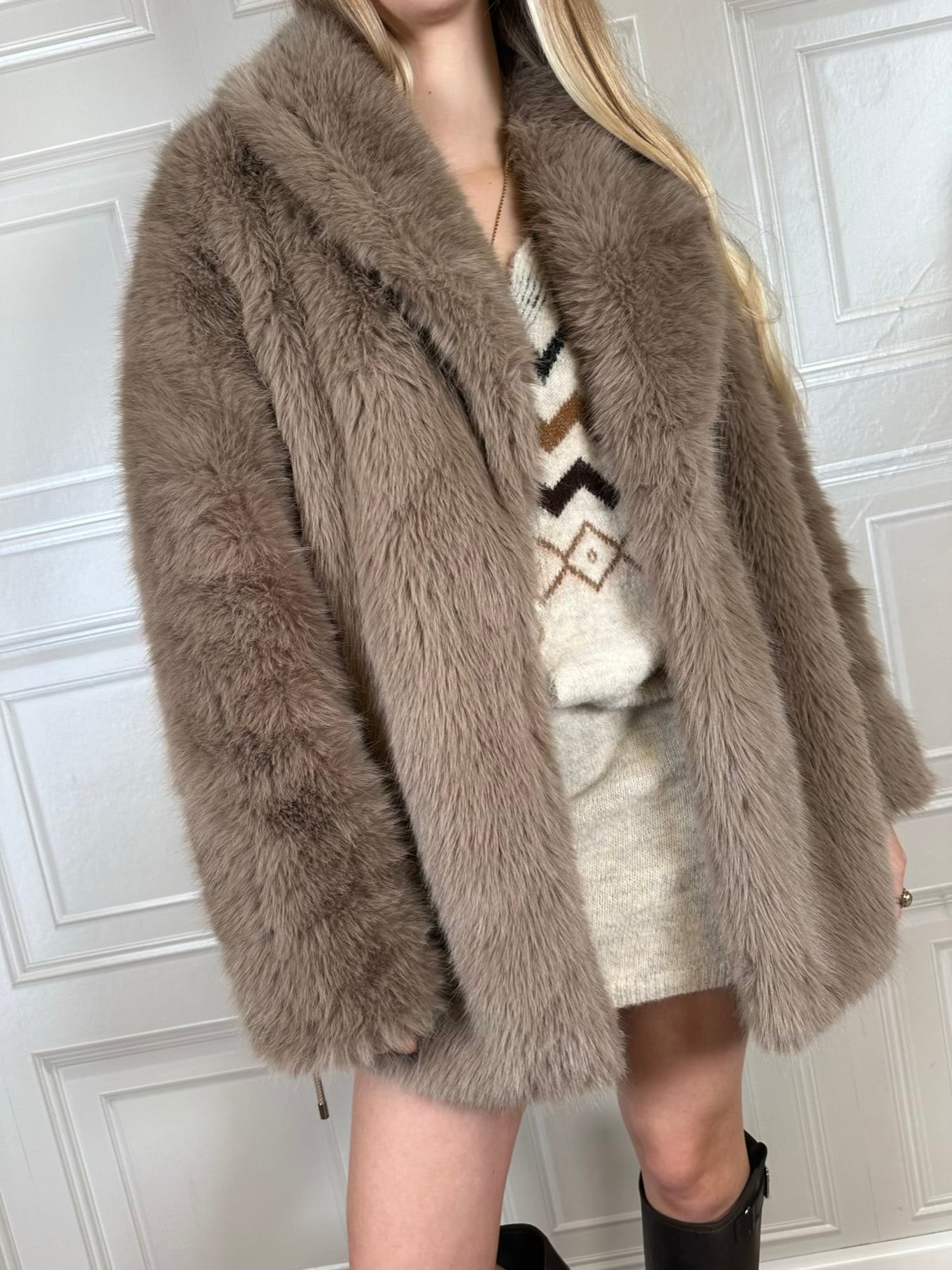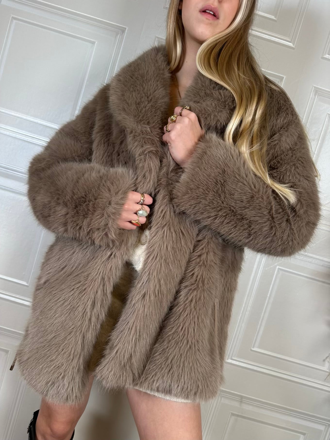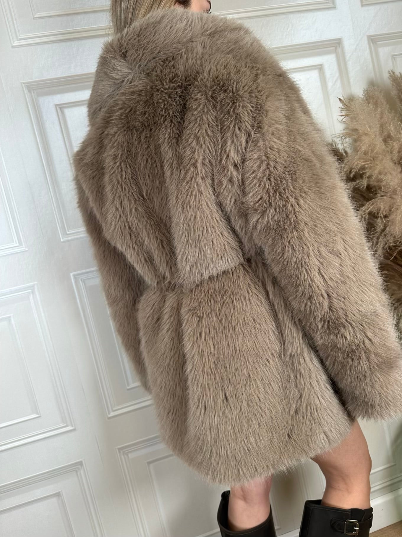 Eco pelliccia con pelo medio lungo. Modello a lunghezza media con collo a reverse. Tasche laterali. Chiusura con automatici interni. In foto taglia unica. Interno foderato.