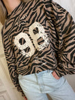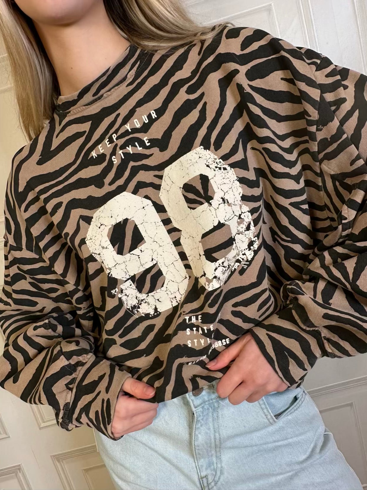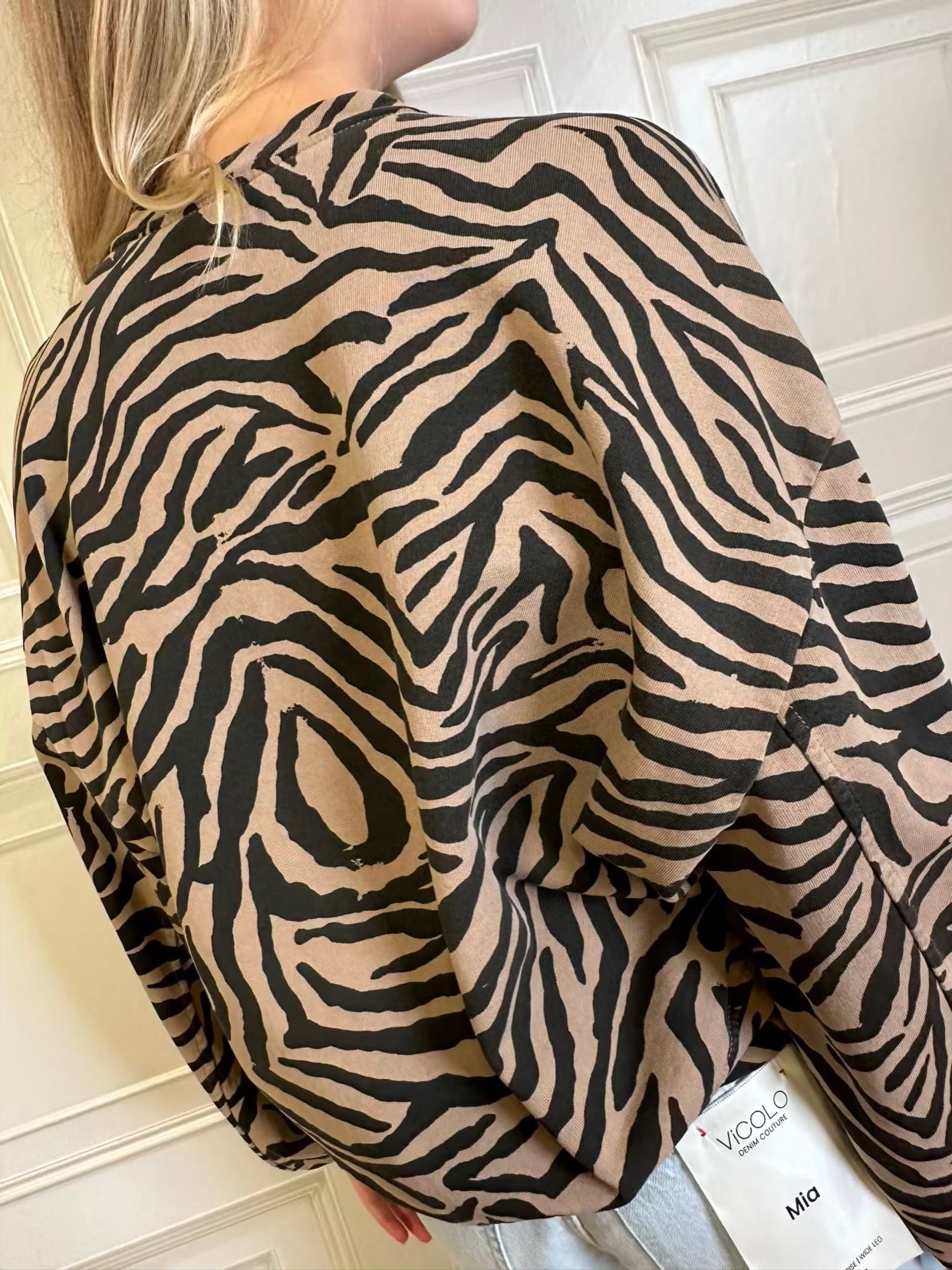 Felpa garzata modello girocollo. Zebrature sui toni del nero e del nocciola. Leggermente più lunga sul retro.