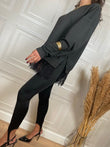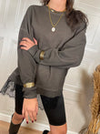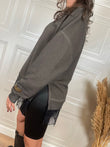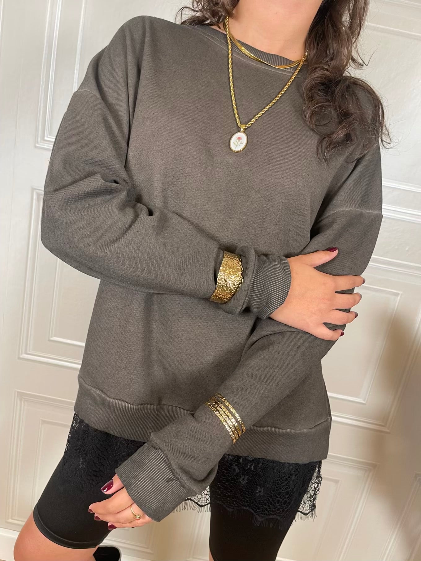 Felpa delavè garzata, con fondo in pizzo. Modello girocollo con spalla scesa.