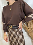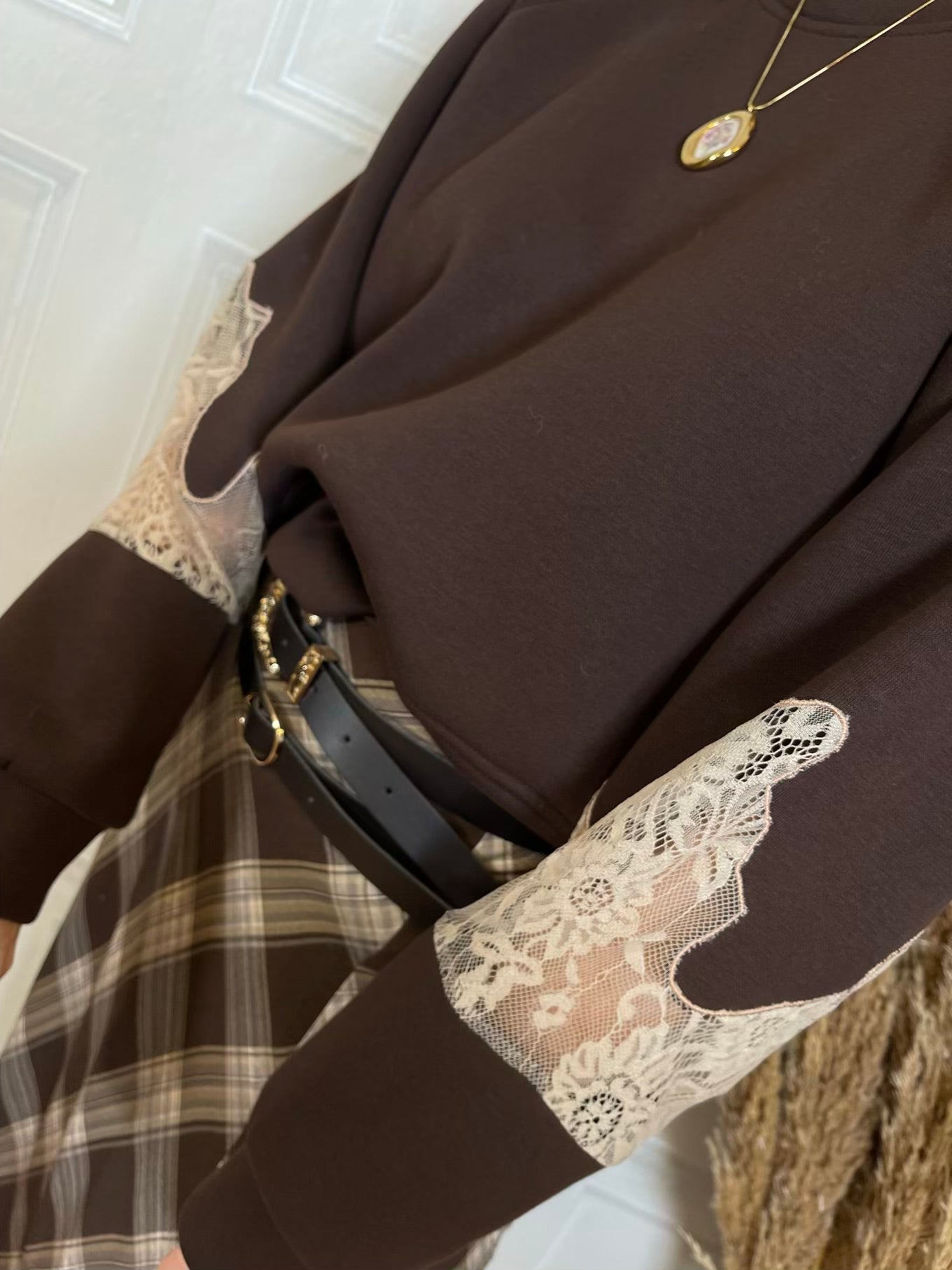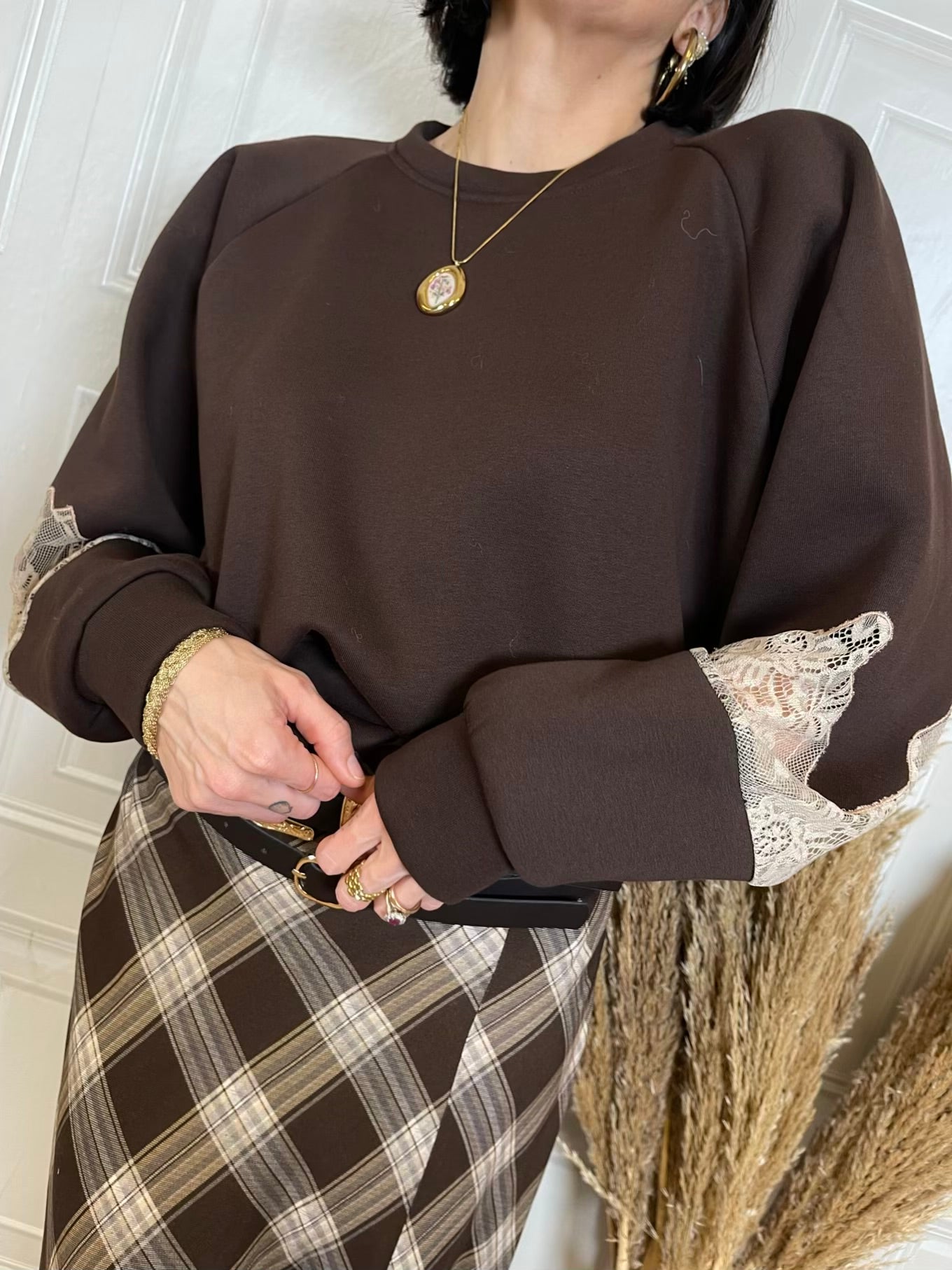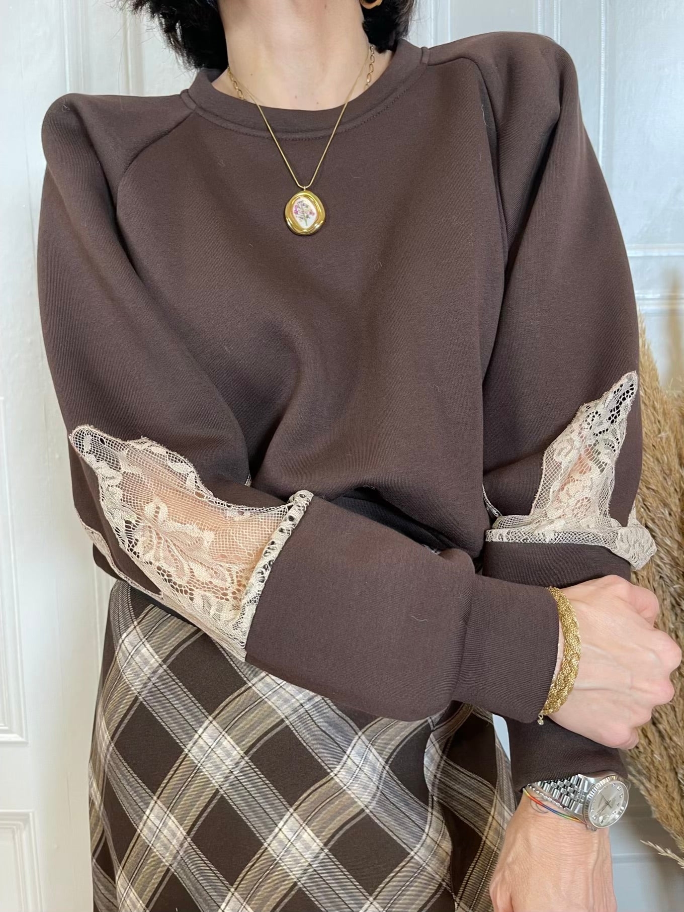 Felpa tinta unita. Modello felpato e a girocollo, manica lunga baloon con polsino e spalla scesa. Dettaglio di inserto con pizzo sulle maniche.