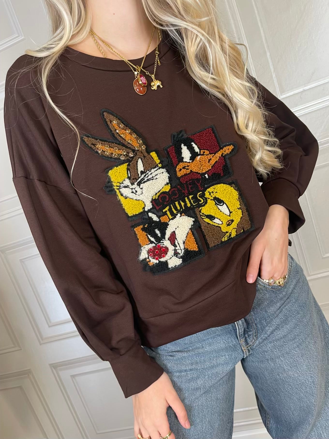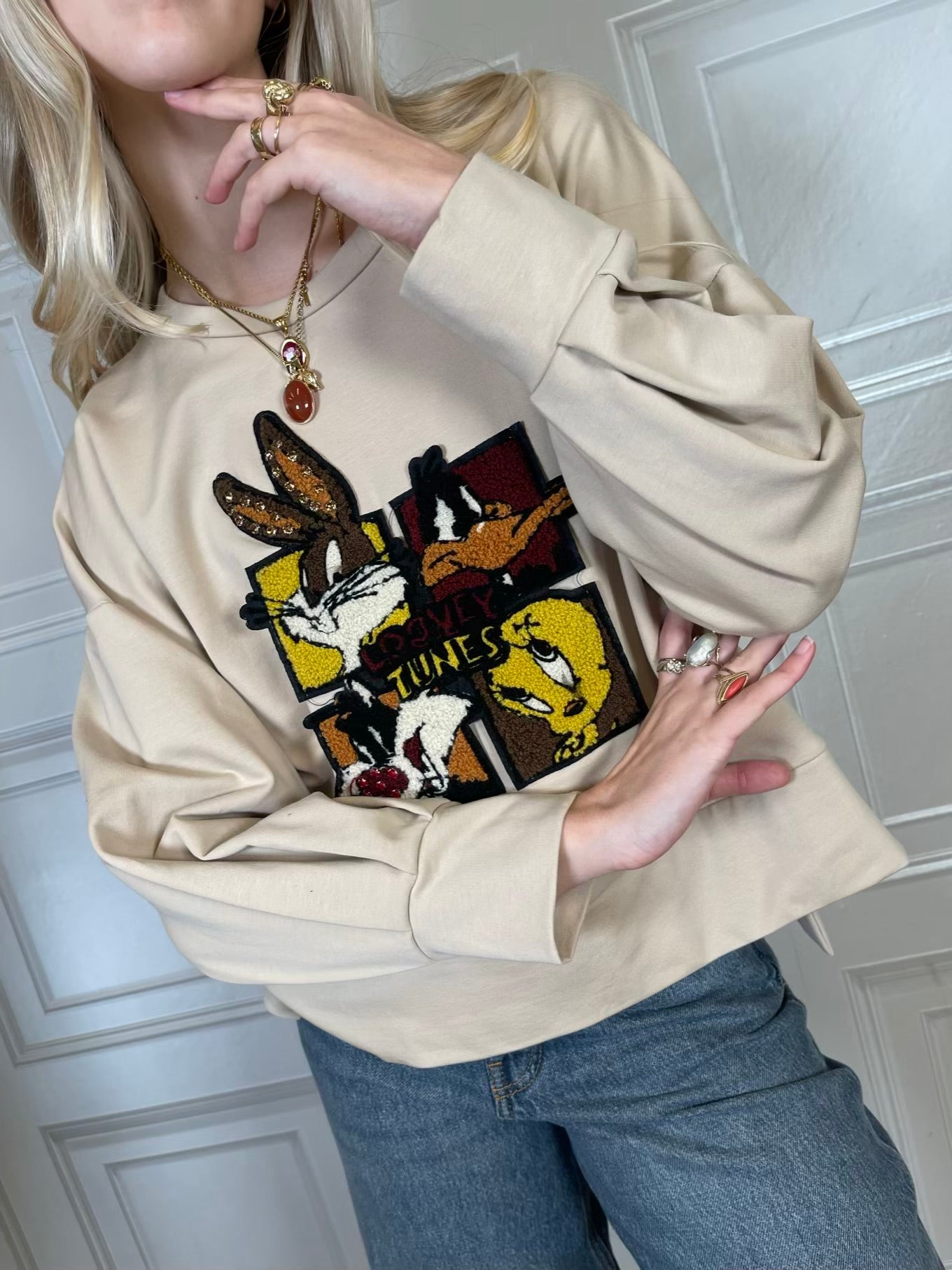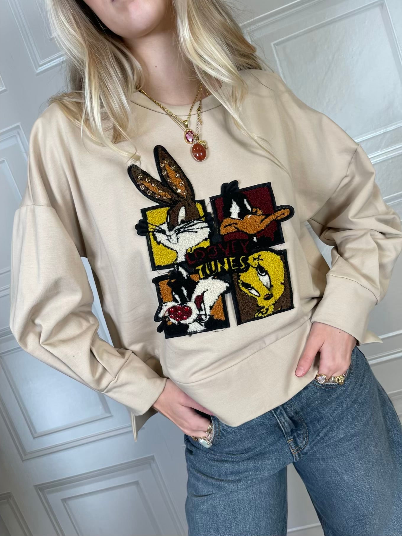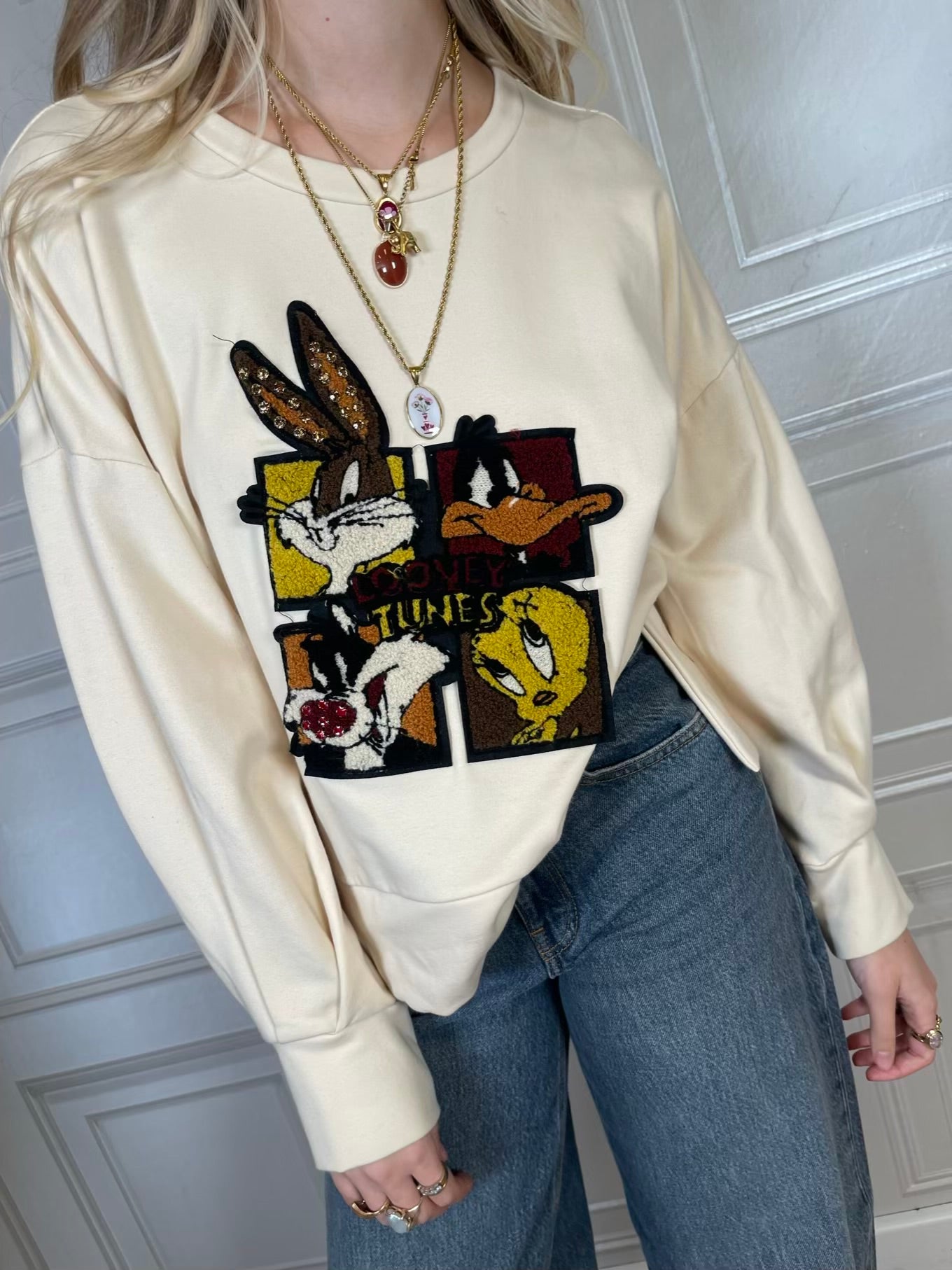 Felpa modello girocollo color con parch Looney tunes. Interno felpato.