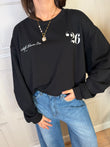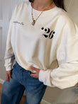 Felpa a girocollo, con stampe sul fronte. Manica lunga con arricciatura e spalla scesa. Leggermente più lunga sul retro.