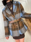 Giacca in pannetto monopetto sui toni del marrone e celeste. Chiusura a due bottoni. Dettaglio di cintura marrone in vita, con fibbia dorata. Fodera interna. In foto taglia S, vestibilità regolare. Lunghezza da spalla: 71 cm circa.