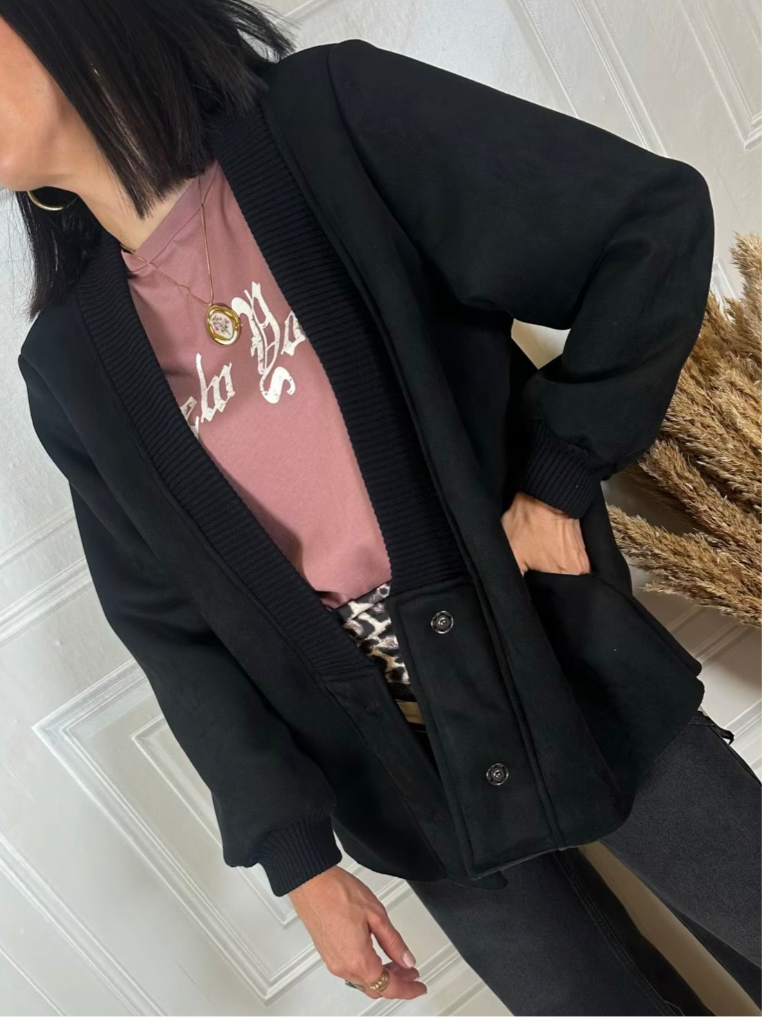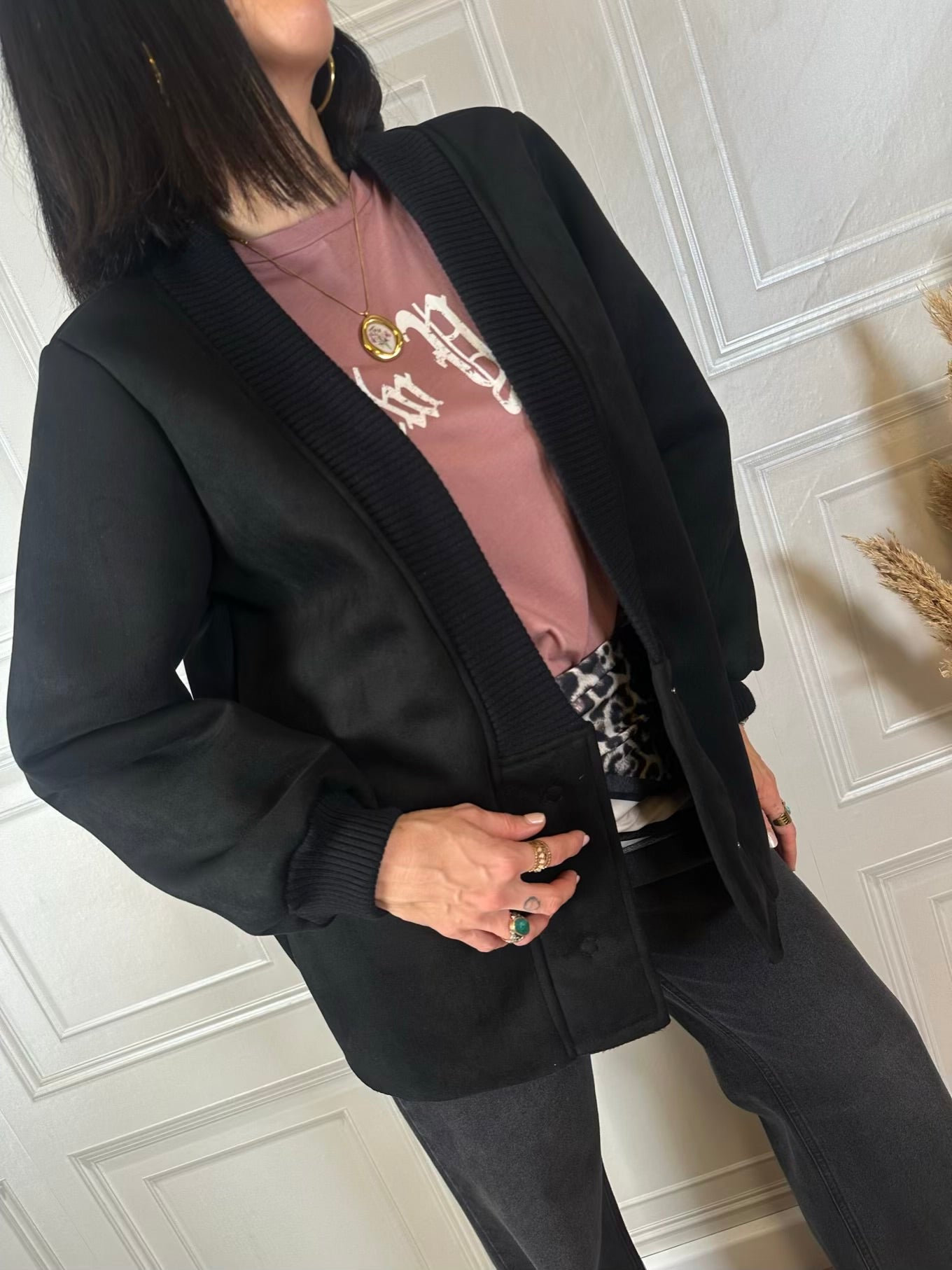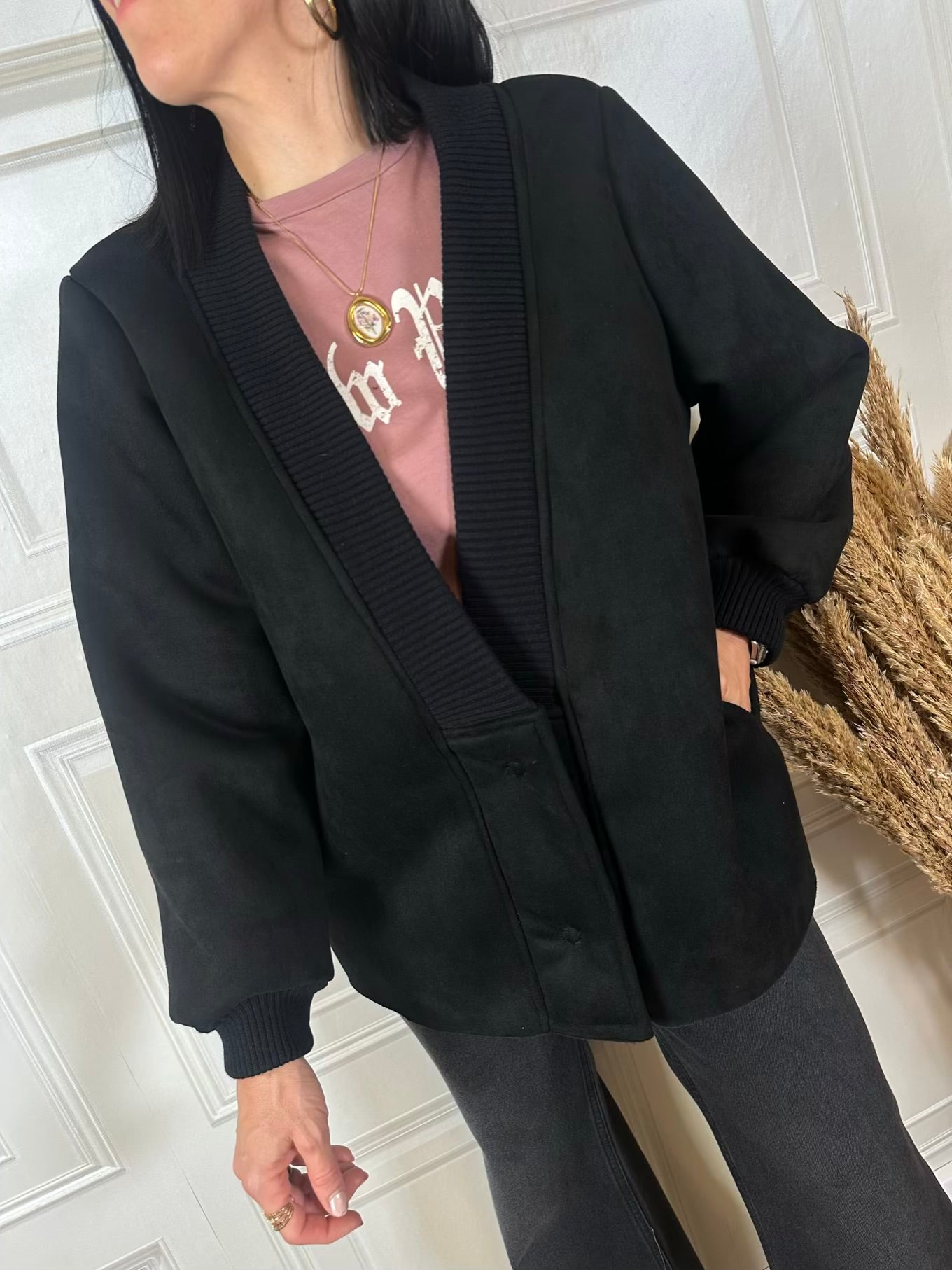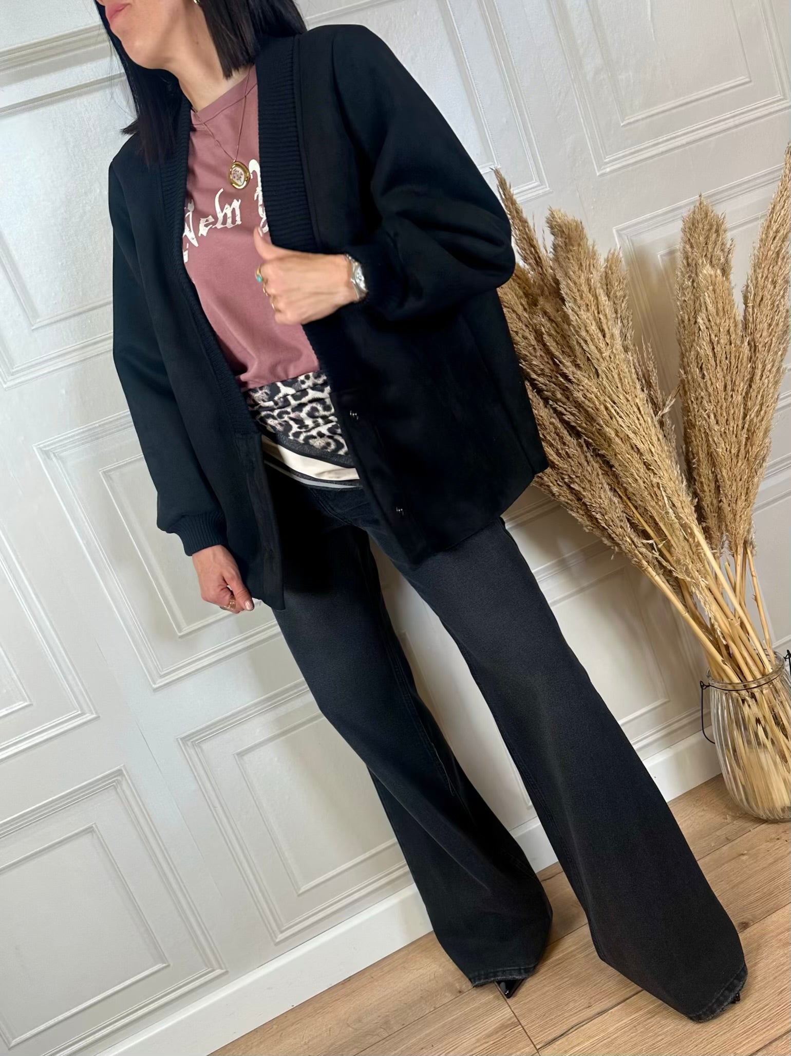 Eco montone taglio caridgan. Modello scollo a V con costine. Chiusura con due bottoncini sul fondo. Elastico sui polsini. Due tasche laterali. Vestibilità morbida. Interno in eco pelliccia.