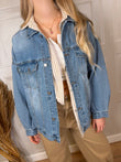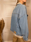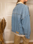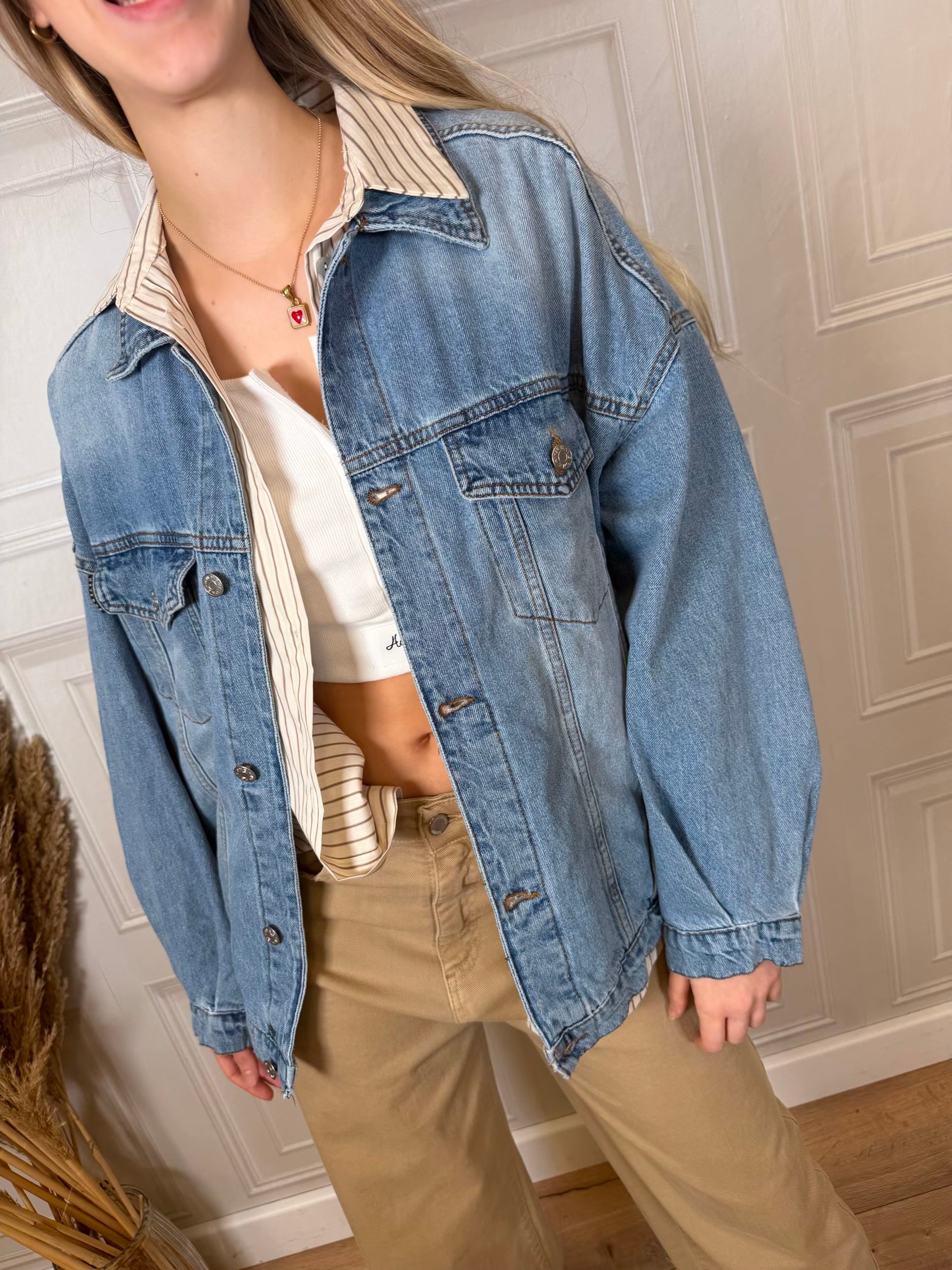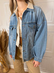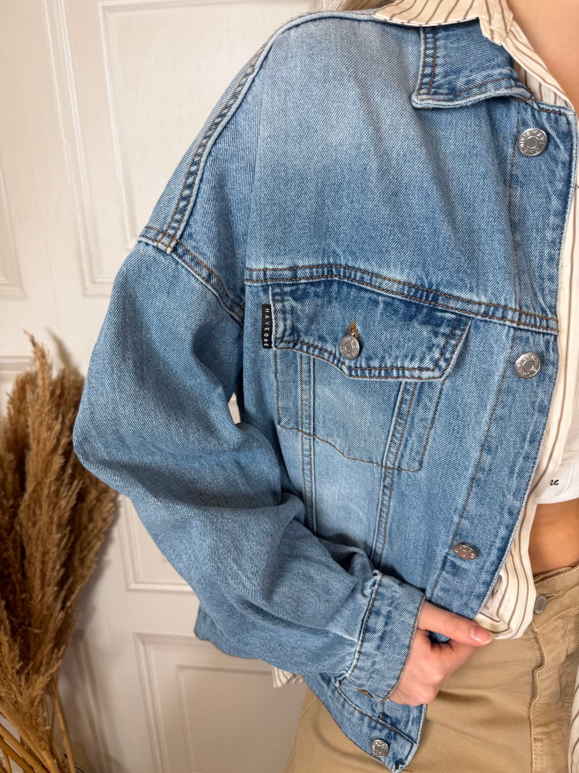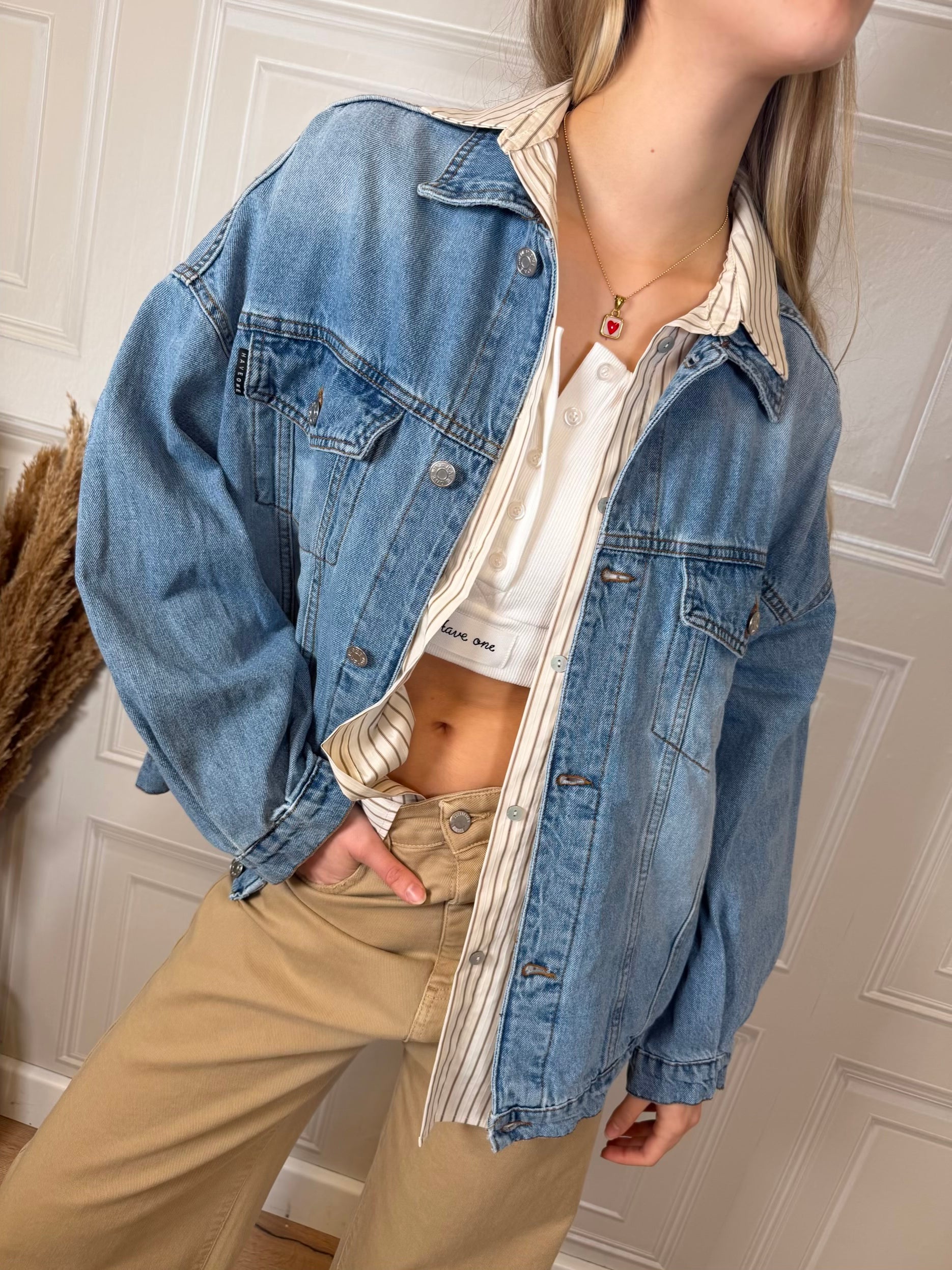 Giacca in denim lavaggio blu chiaro. Modello over. Chiusura frontale con bottoncini. Tasche anteriori. Dettaglio di taschine laterali a filetto. In foto taglia S.