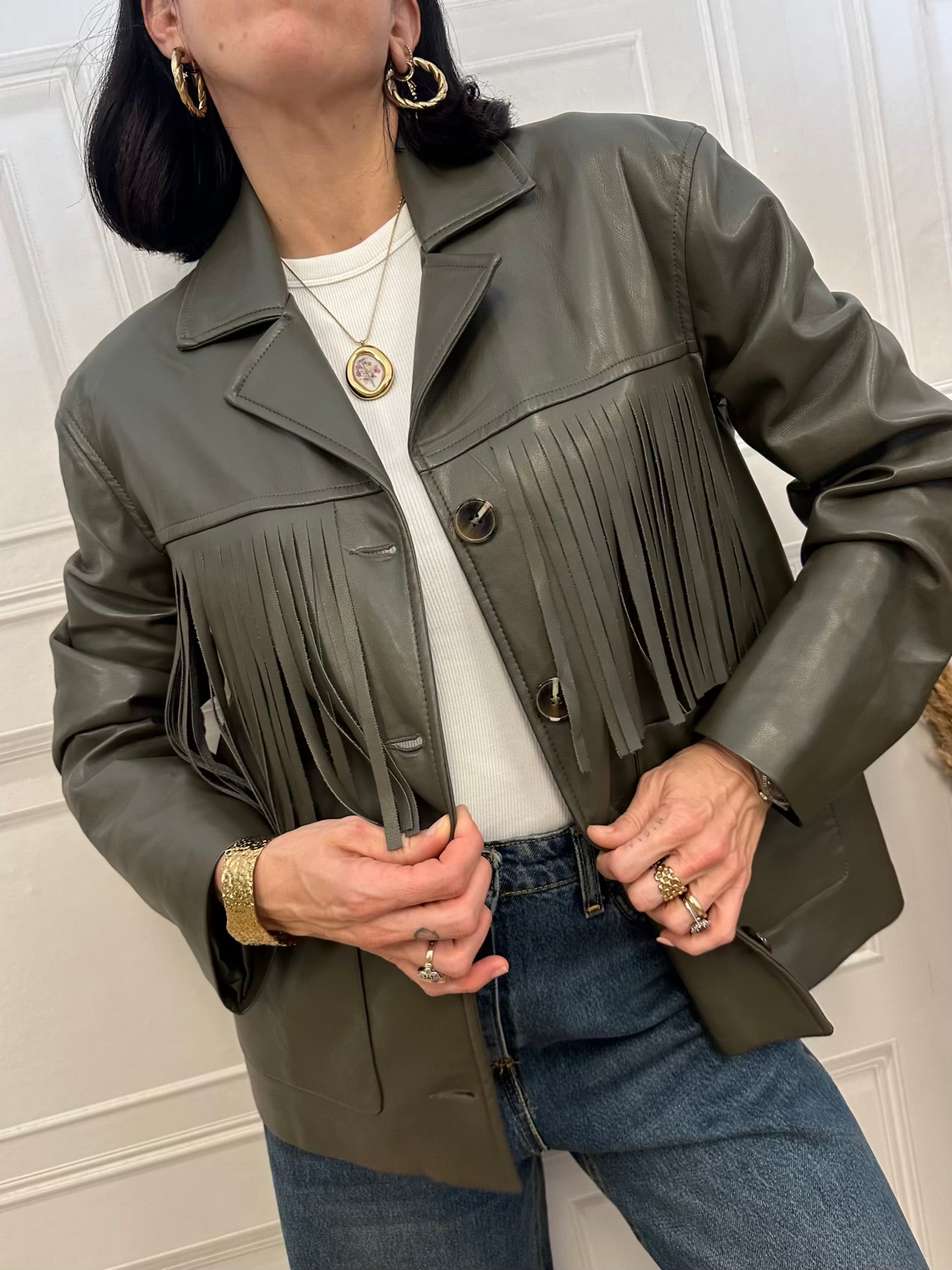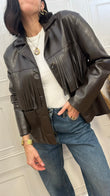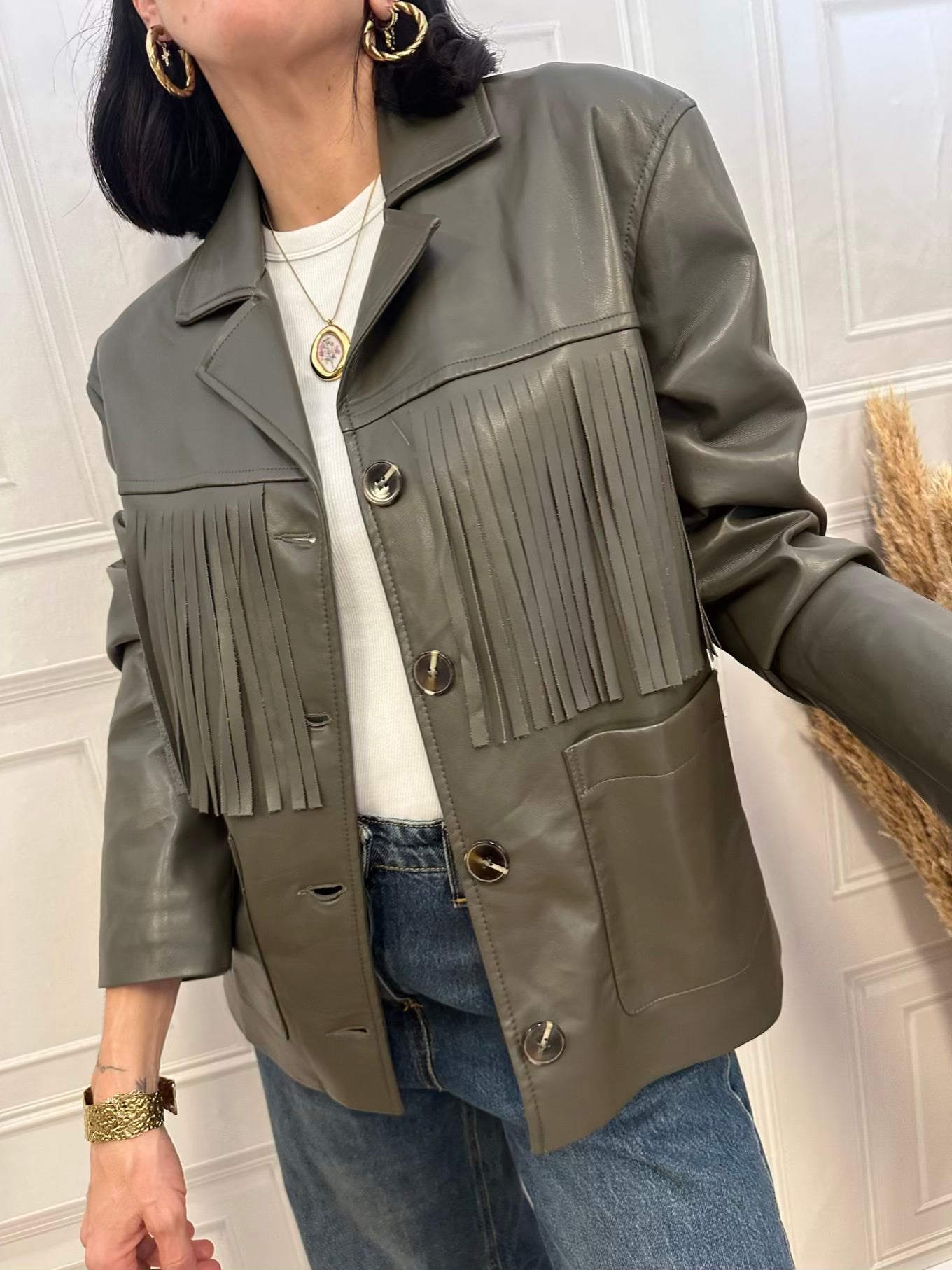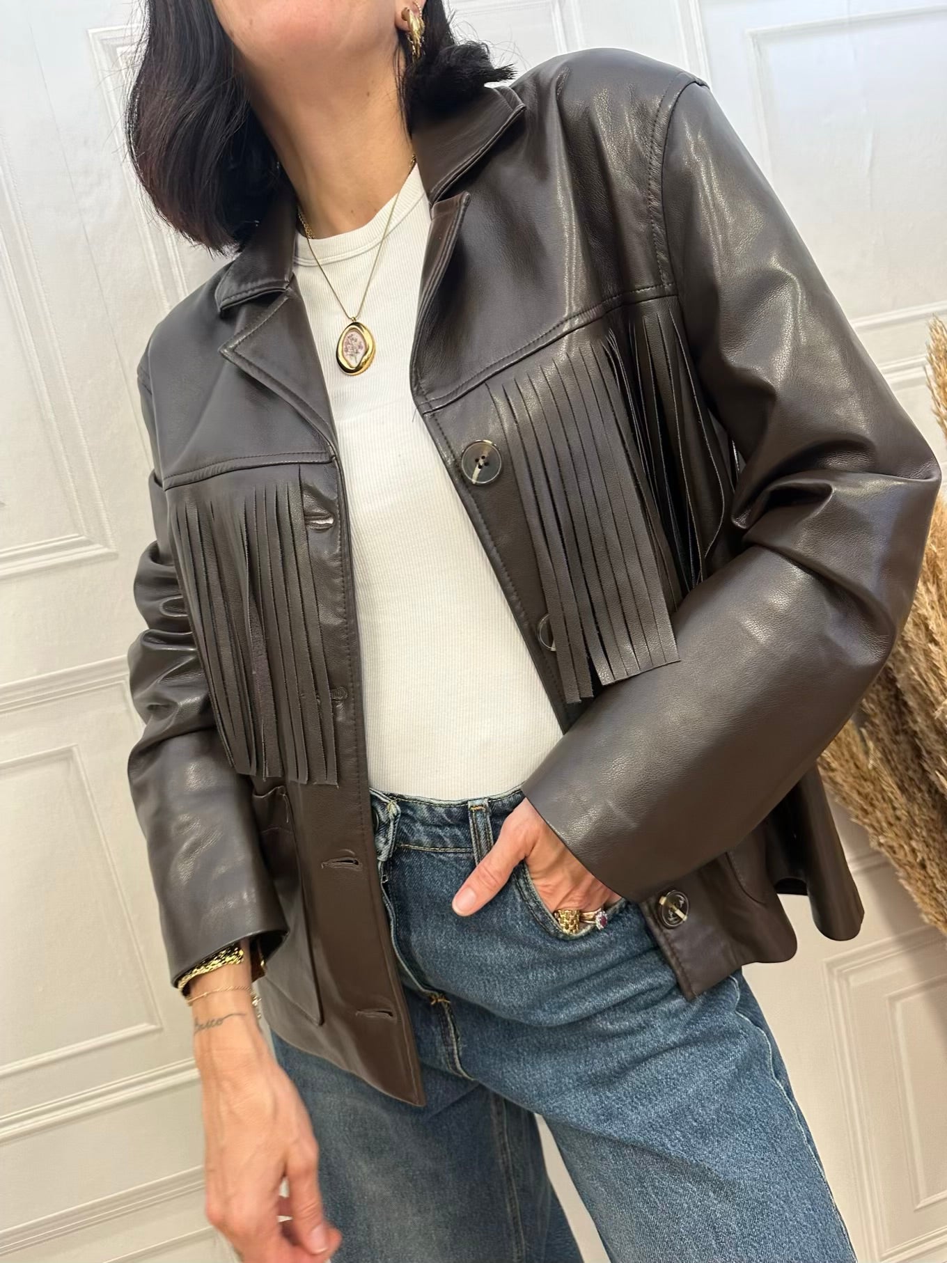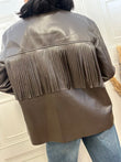 Giacca in ecopelle modello over con scollo a V. Frange anteriori e posteriori.