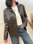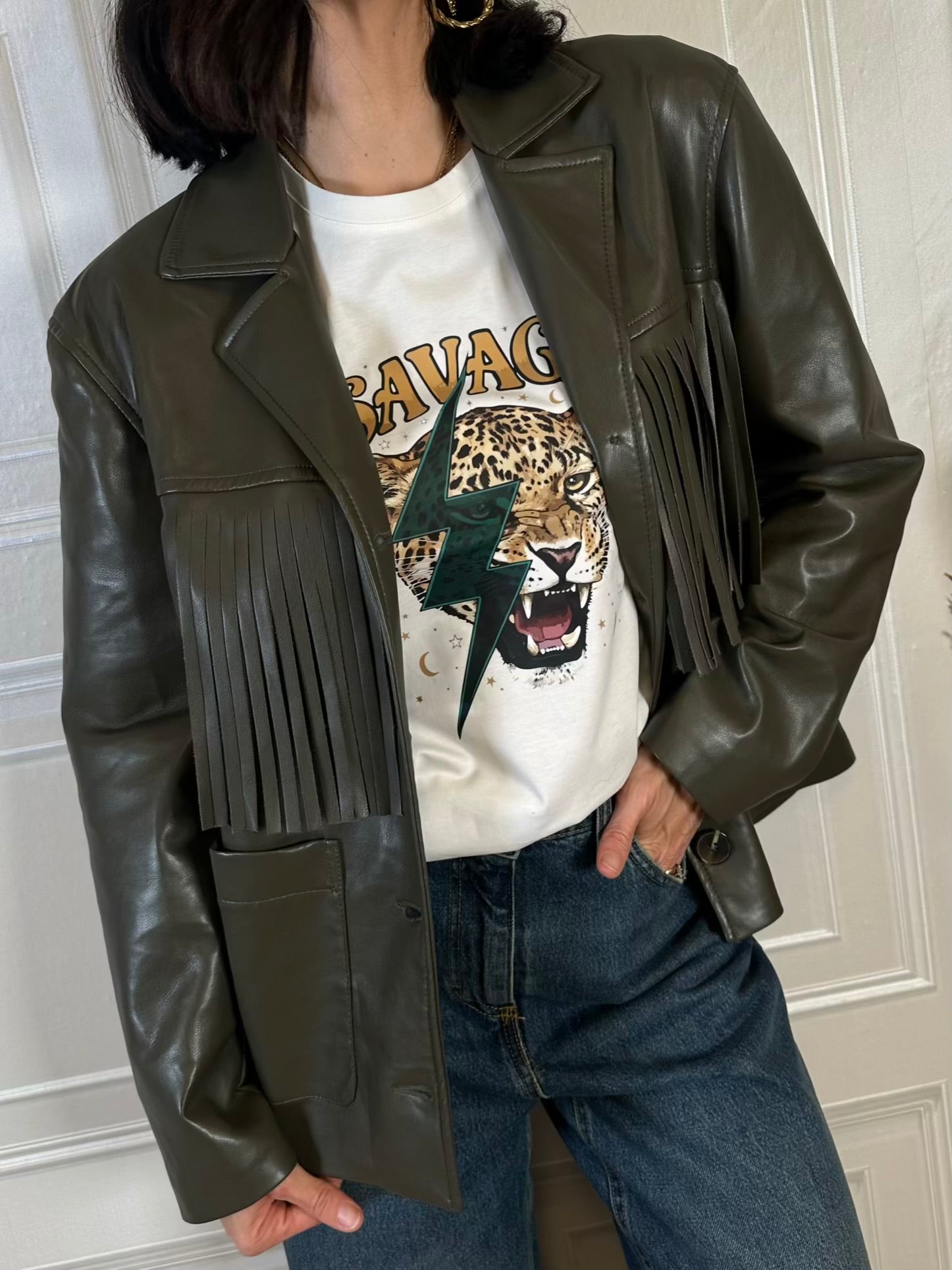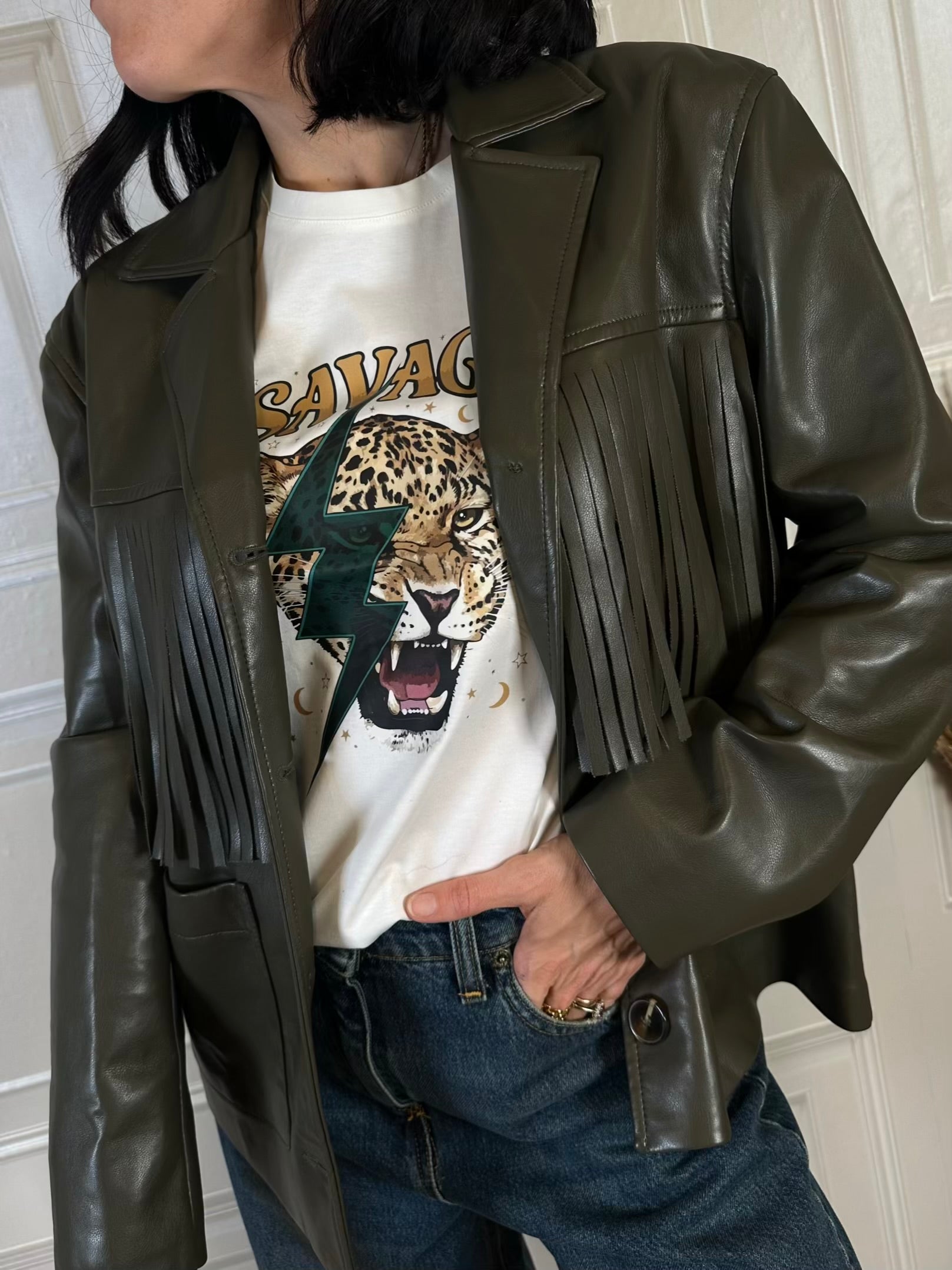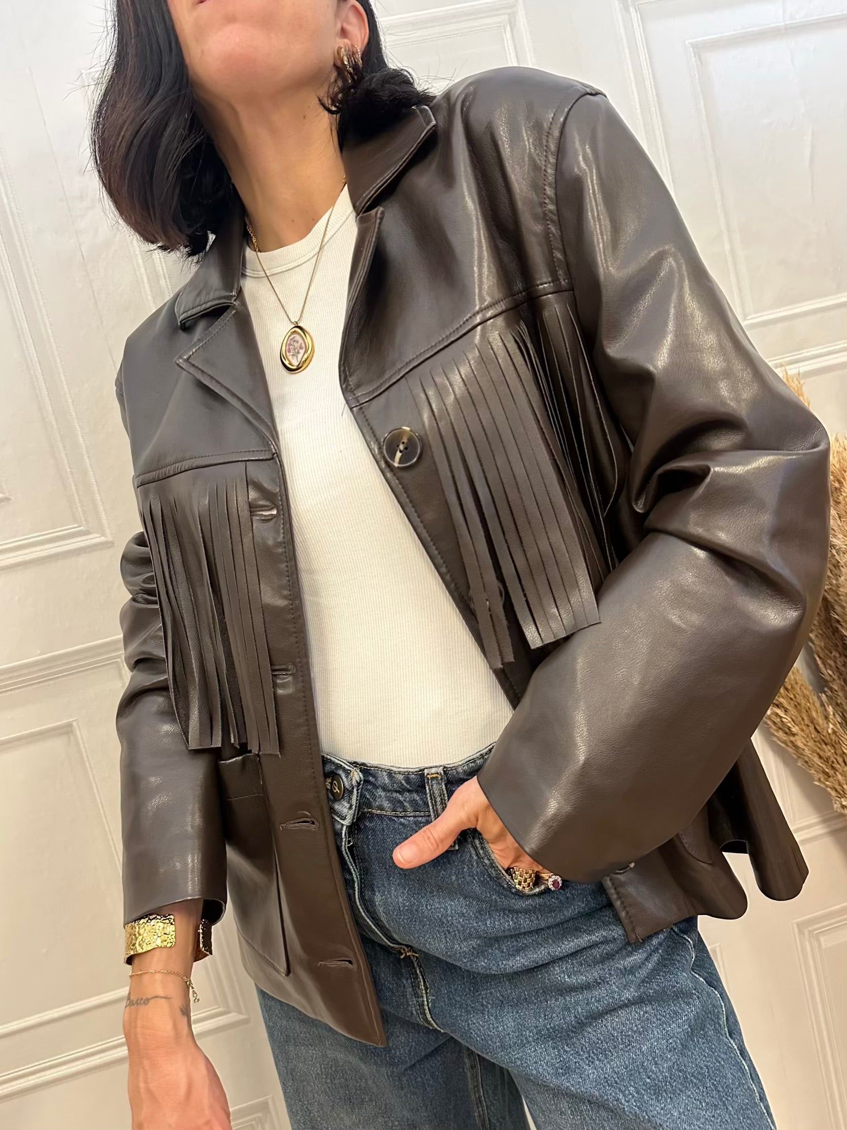 Giacca in ecopelle modello over con scollo a V. Frange anteriori e posteriori.