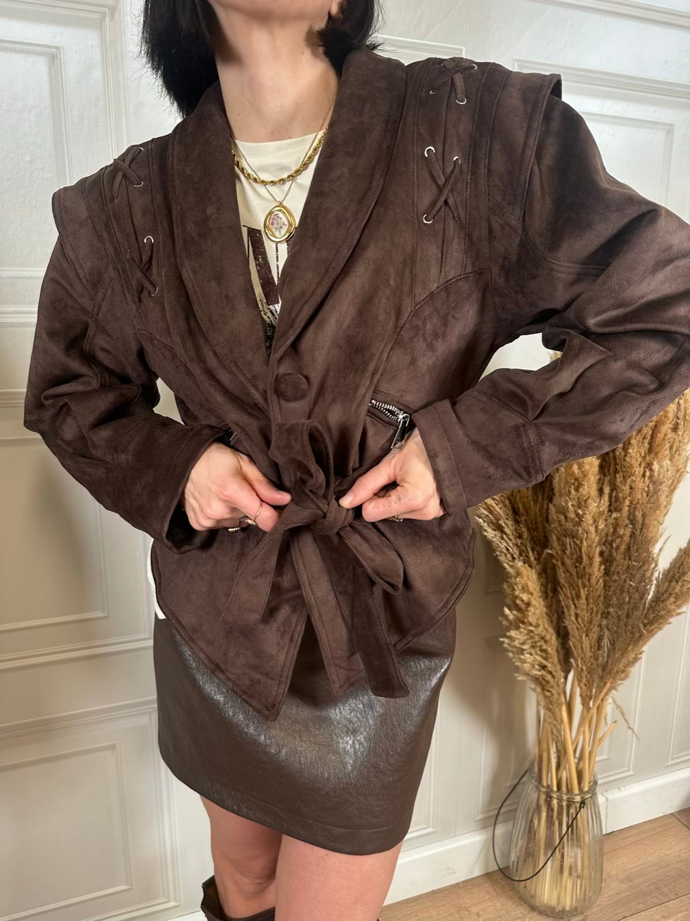 Giacca scamosciata con cintura moro. Modello con due tasche laterali, chiusura con un bottone e cinturino. Intrecci su spalla. Foderato internamente. In foto taglia M/L. vestibilita’ regolare