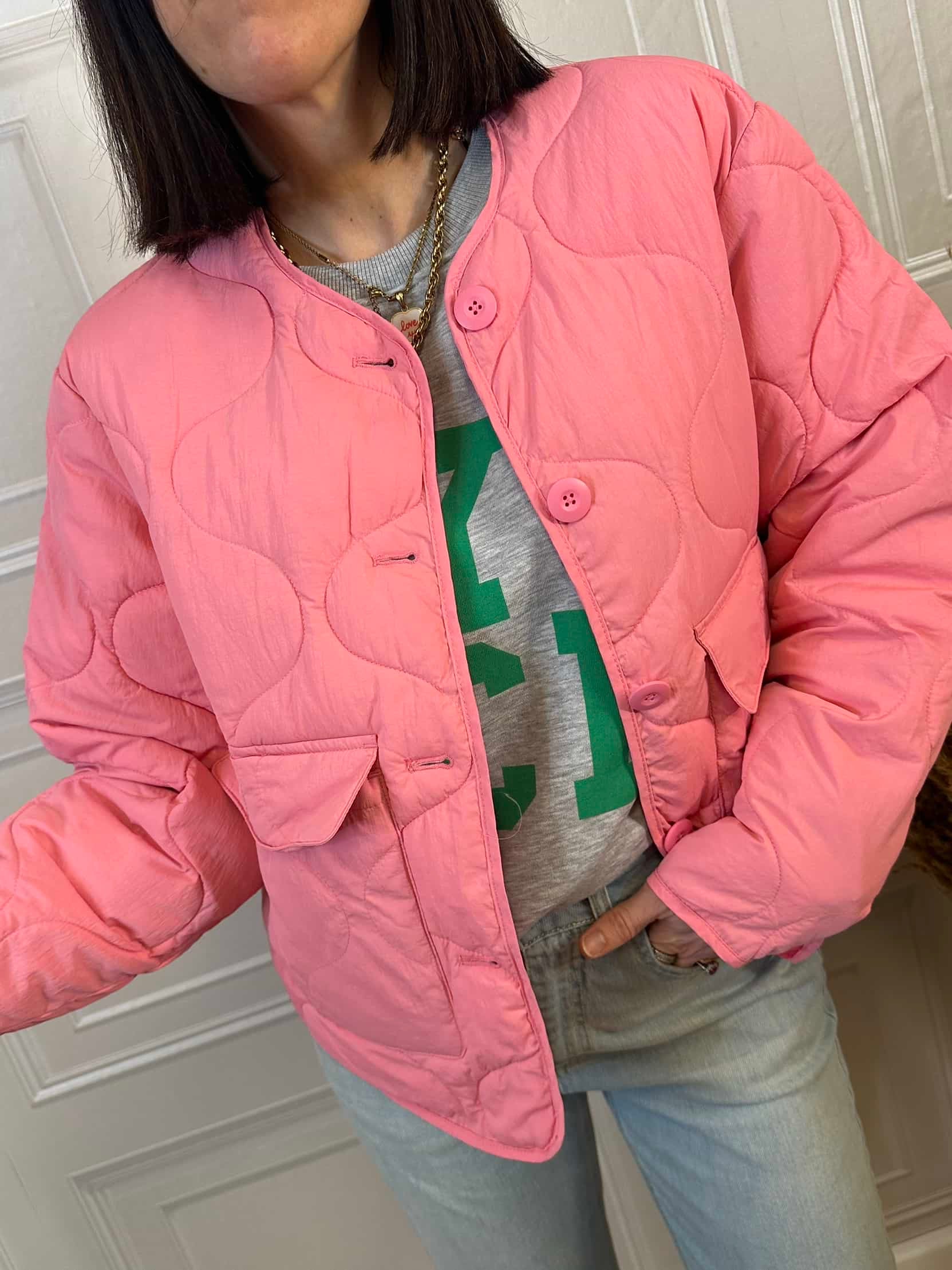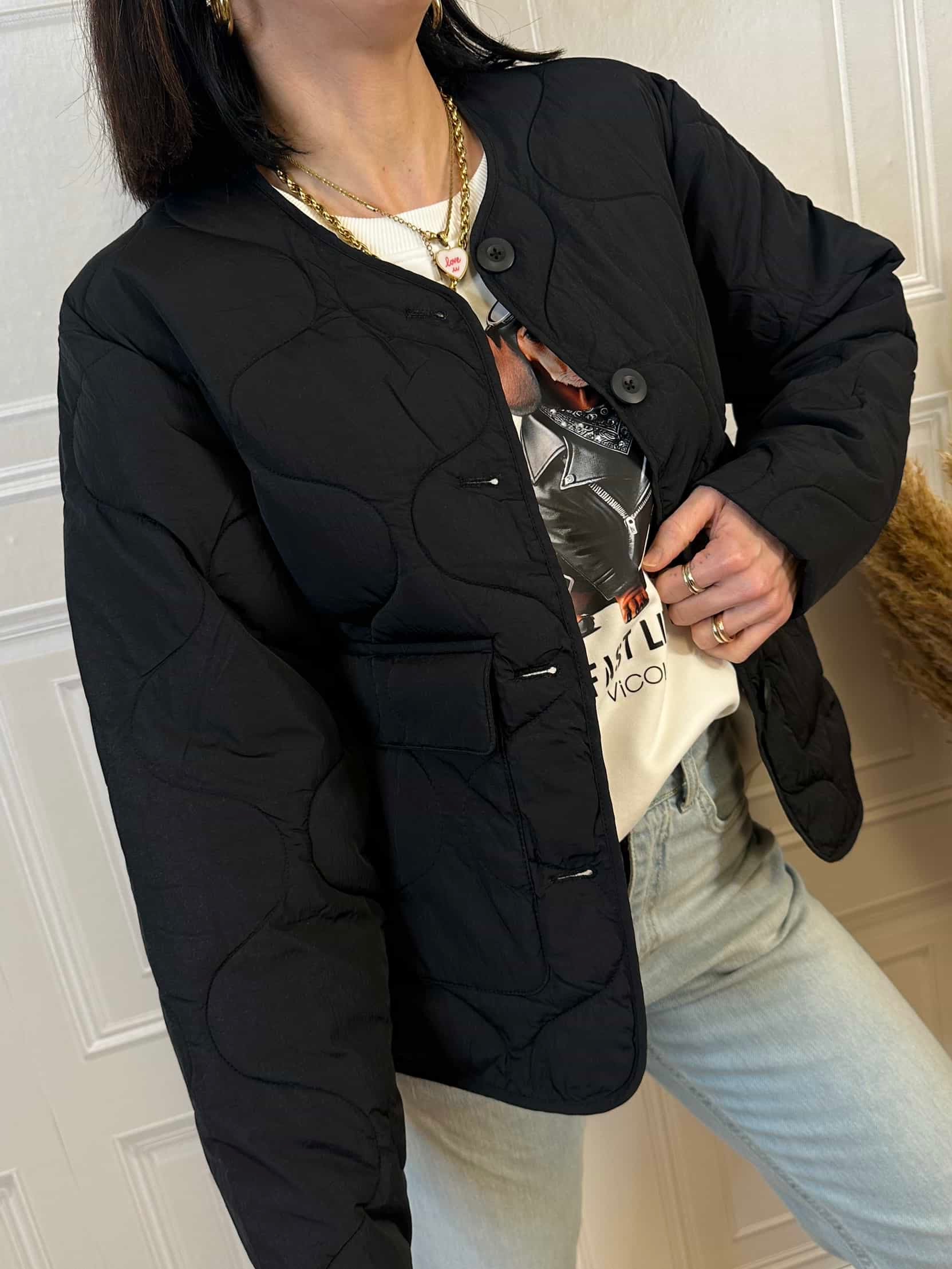 Giacca trapuntata mezza stagione. Chiusura con bottoni e tasche frontali. Vestibilità regolare.