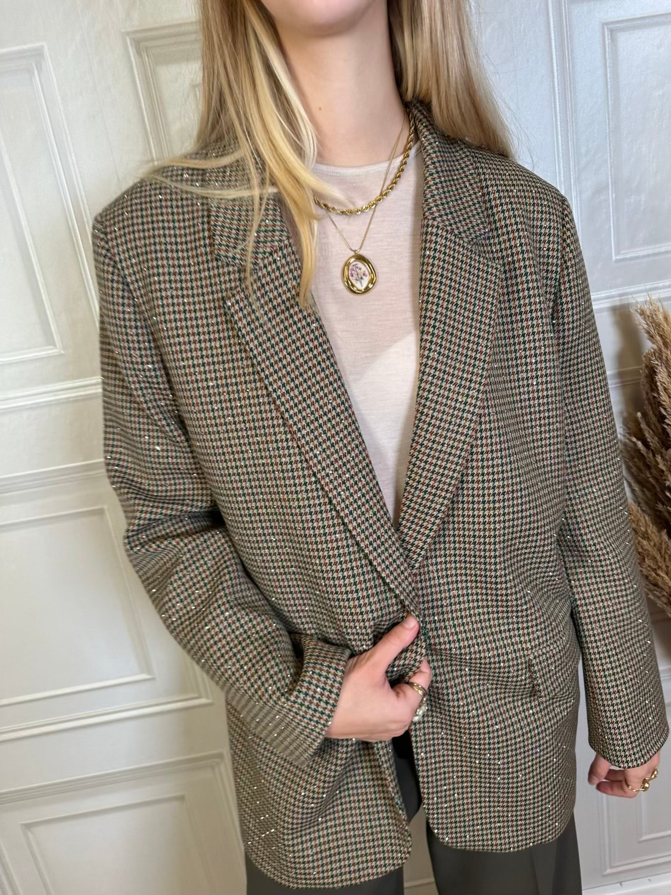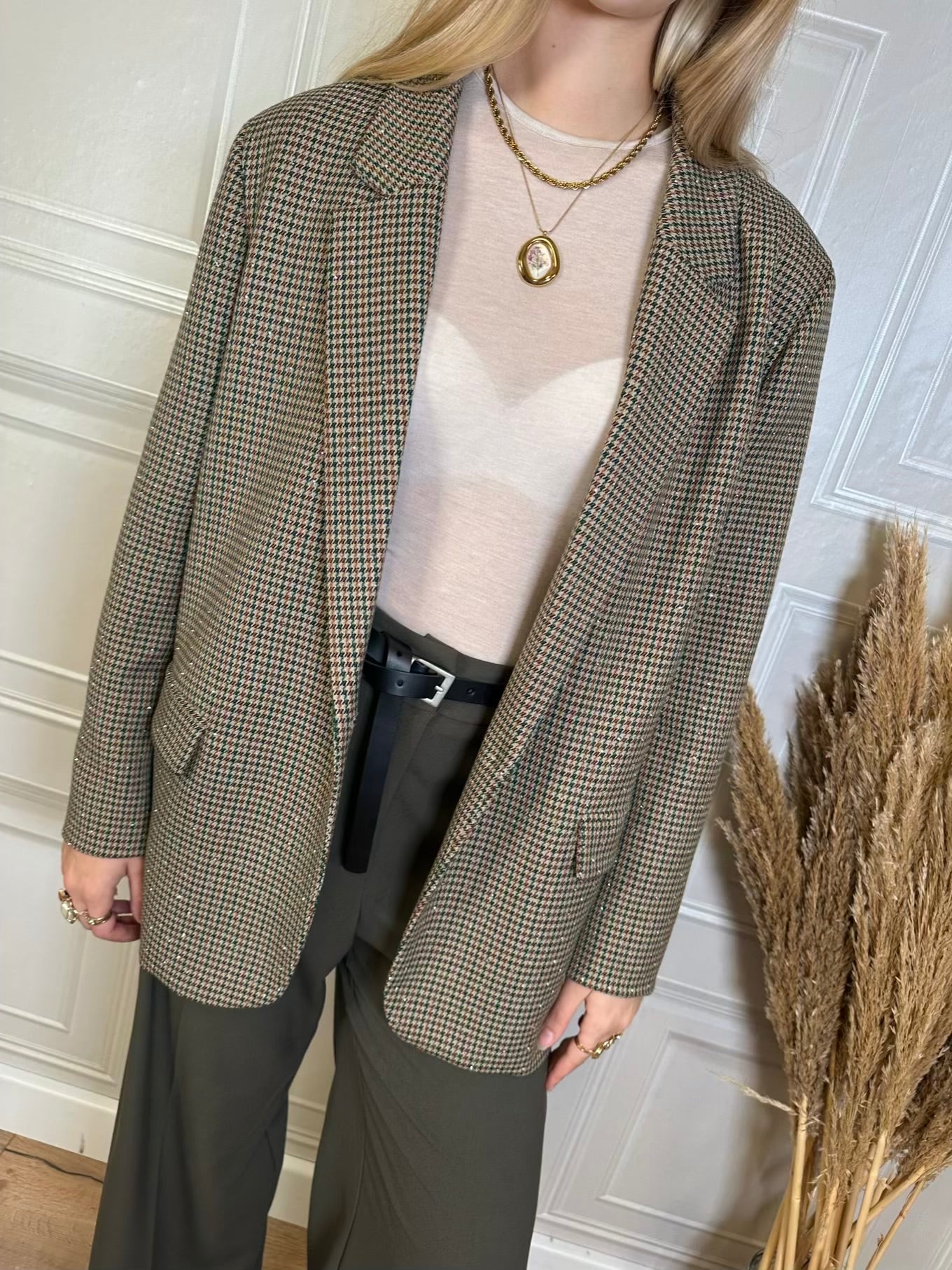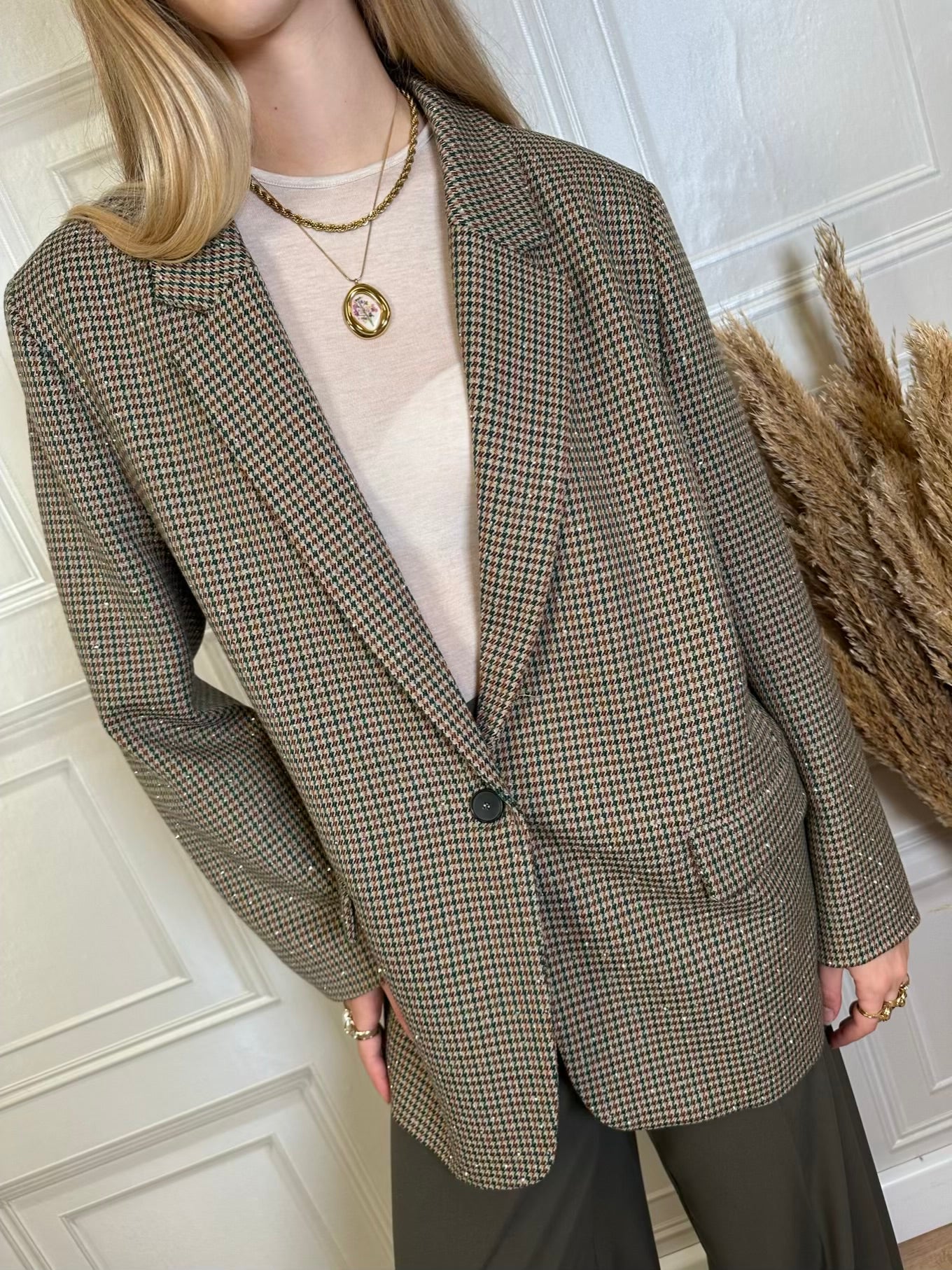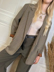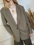 Blazer taglio dritto leggermente oversize con fantasia pied de poule sui toni del marrone verde bottiglia e beige. Spalline leggermente imbottite. Spacchetto posteriore. Tasche frontali.