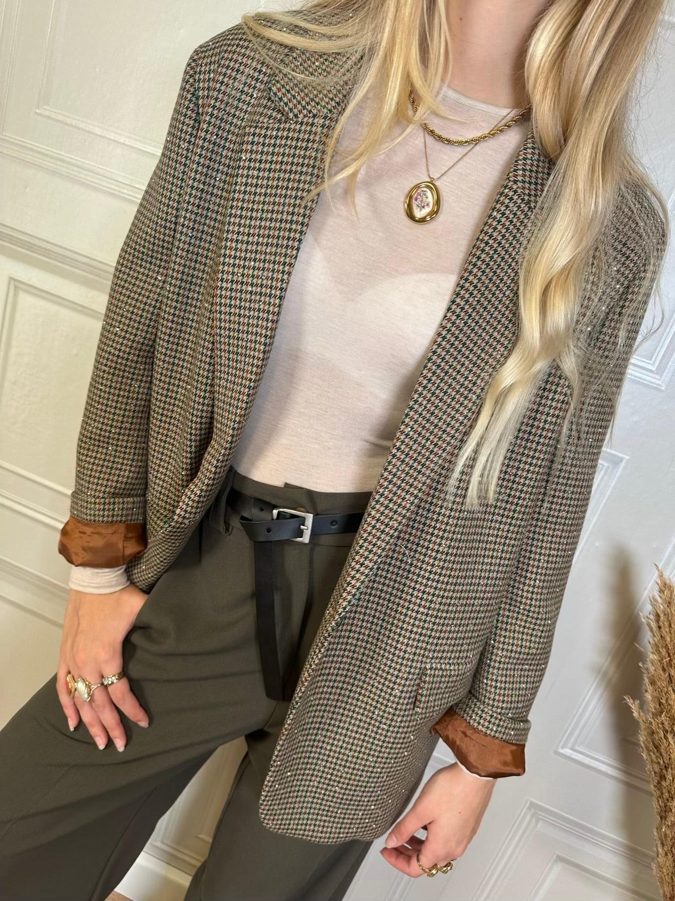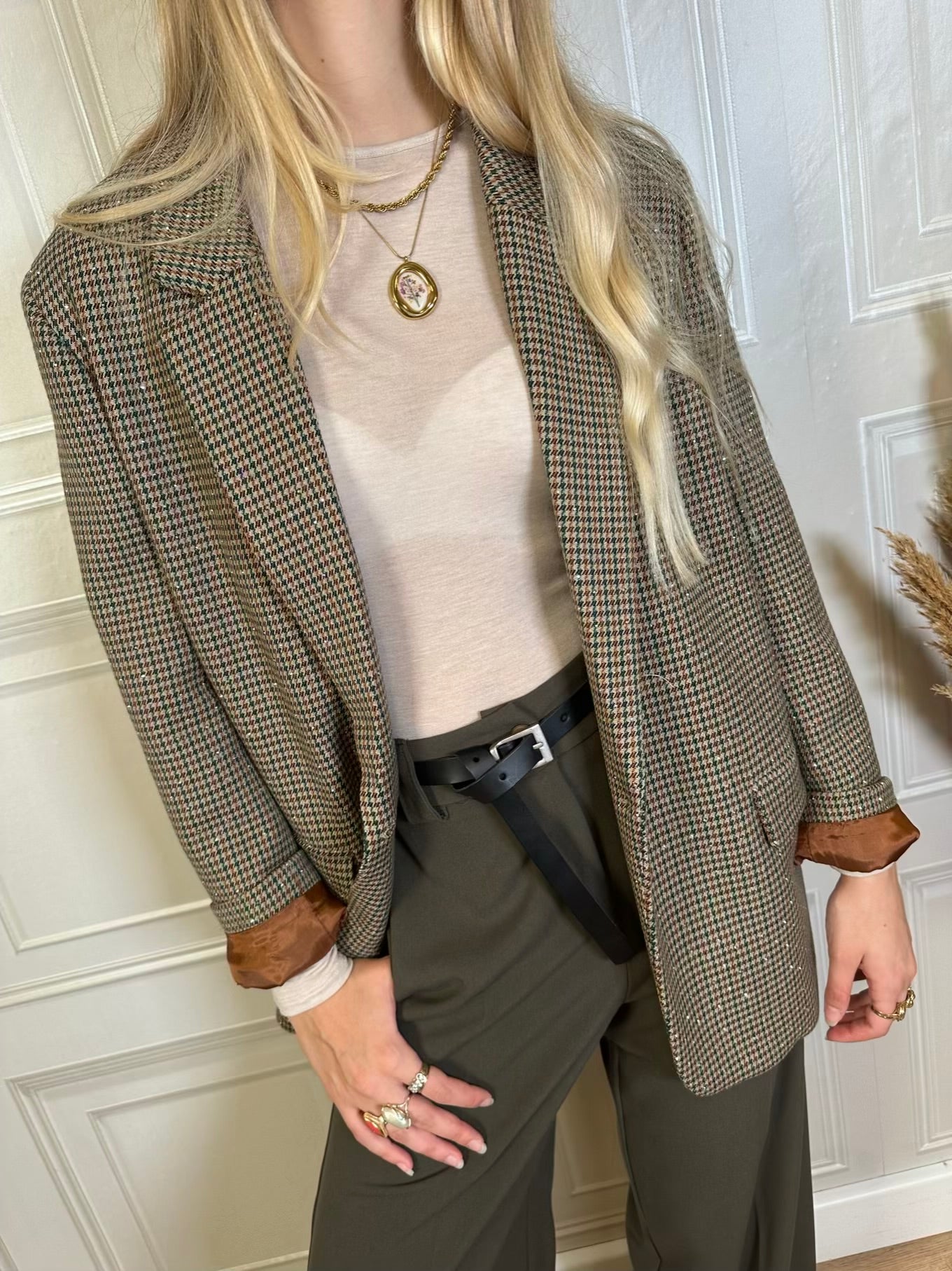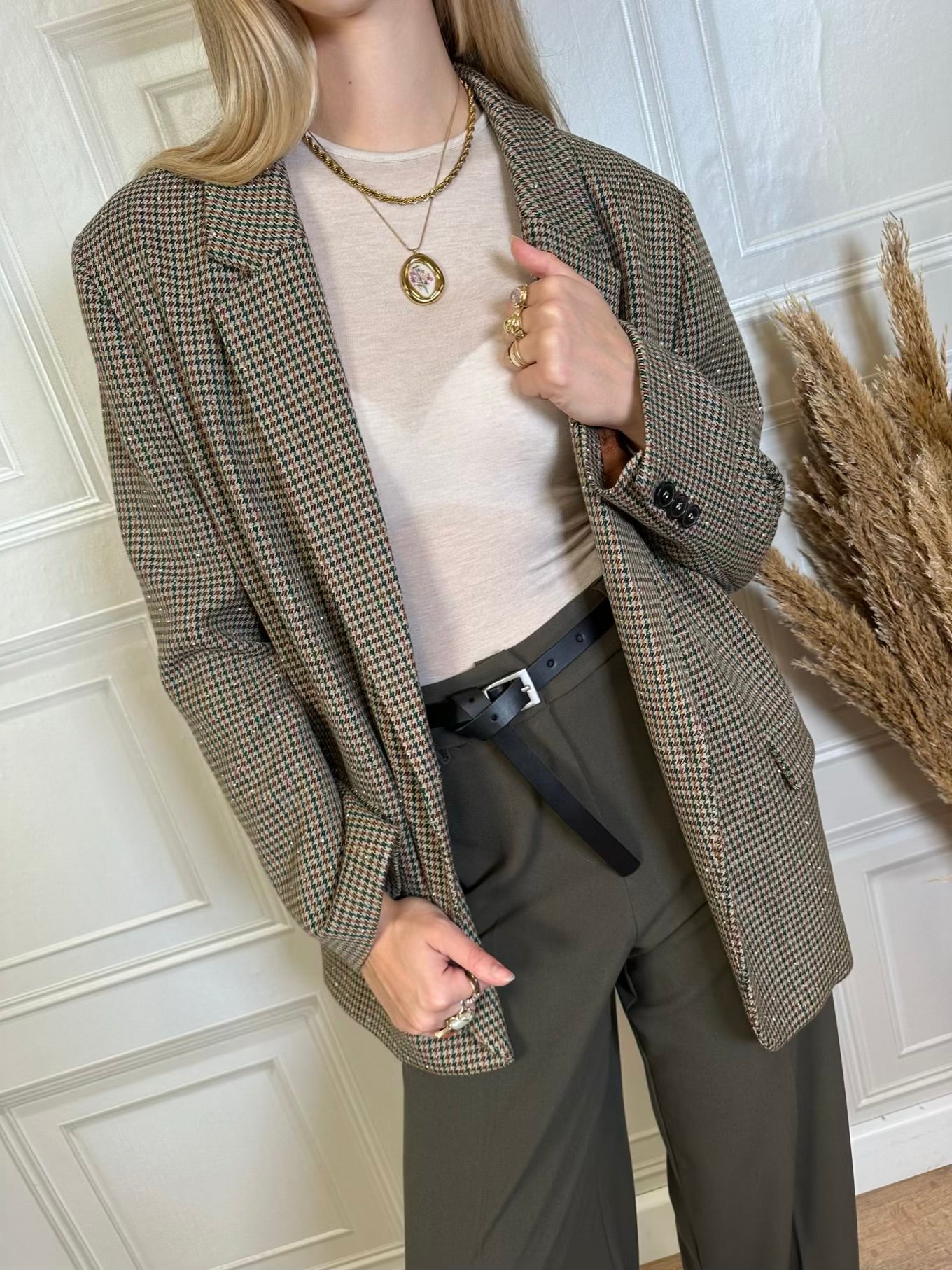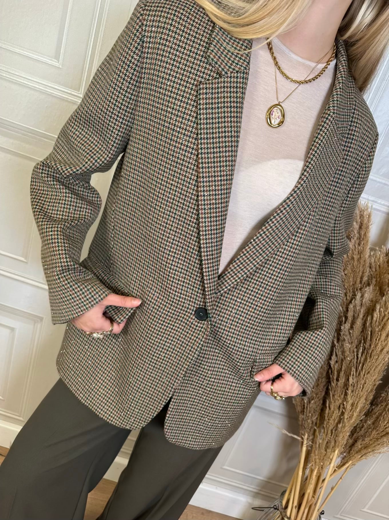 Blazer taglio dritto leggermente oversize con fantasia pied de poule sui toni del marrone verde bottiglia e beige. Spalline leggermente imbottite. Spacchetto posteriore. Tasche frontali.