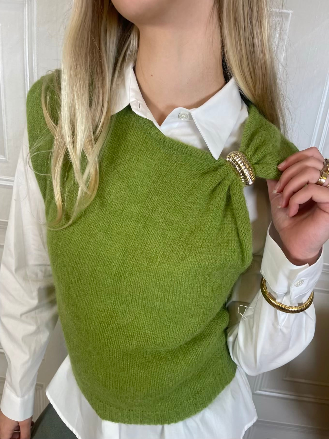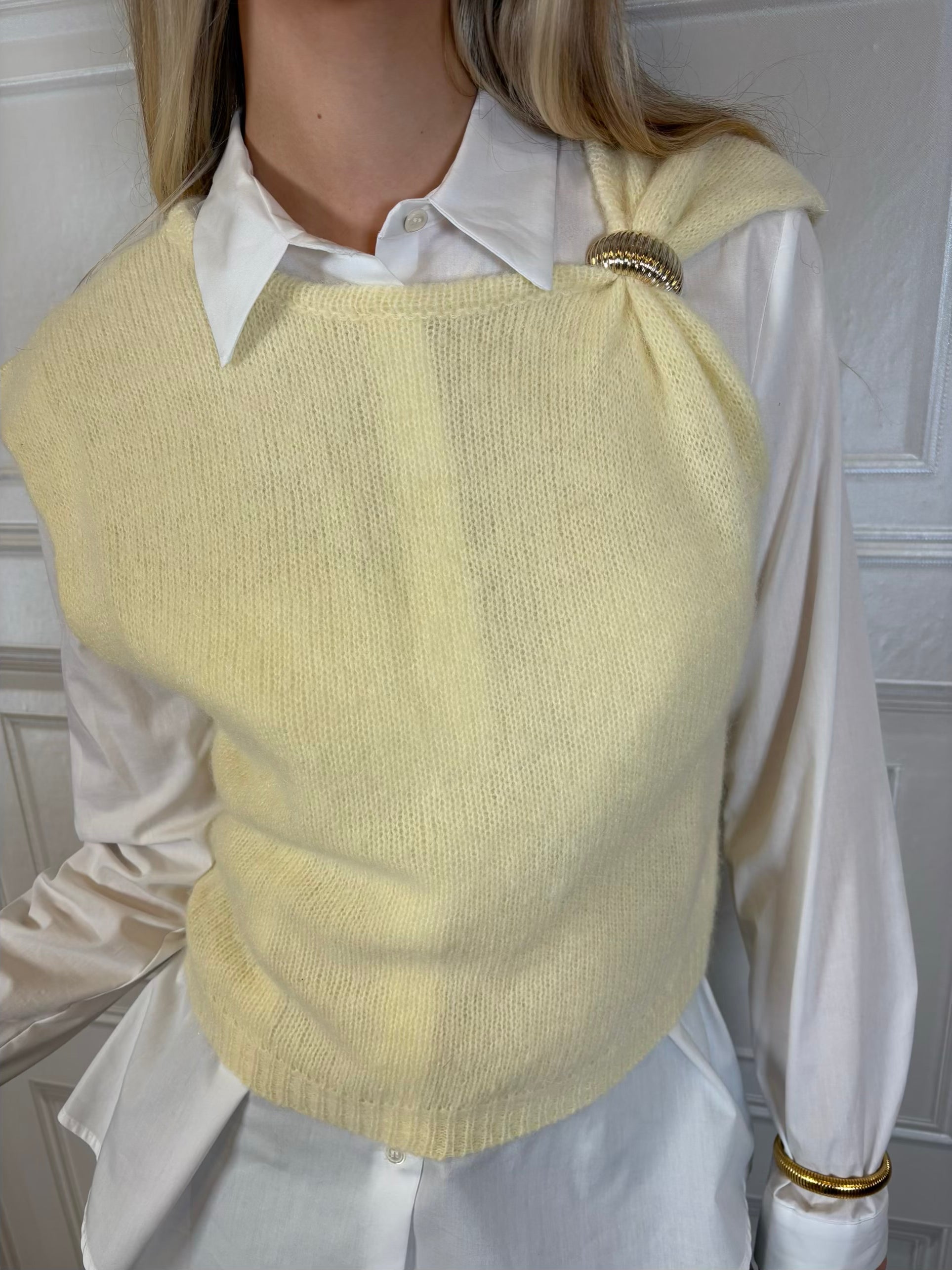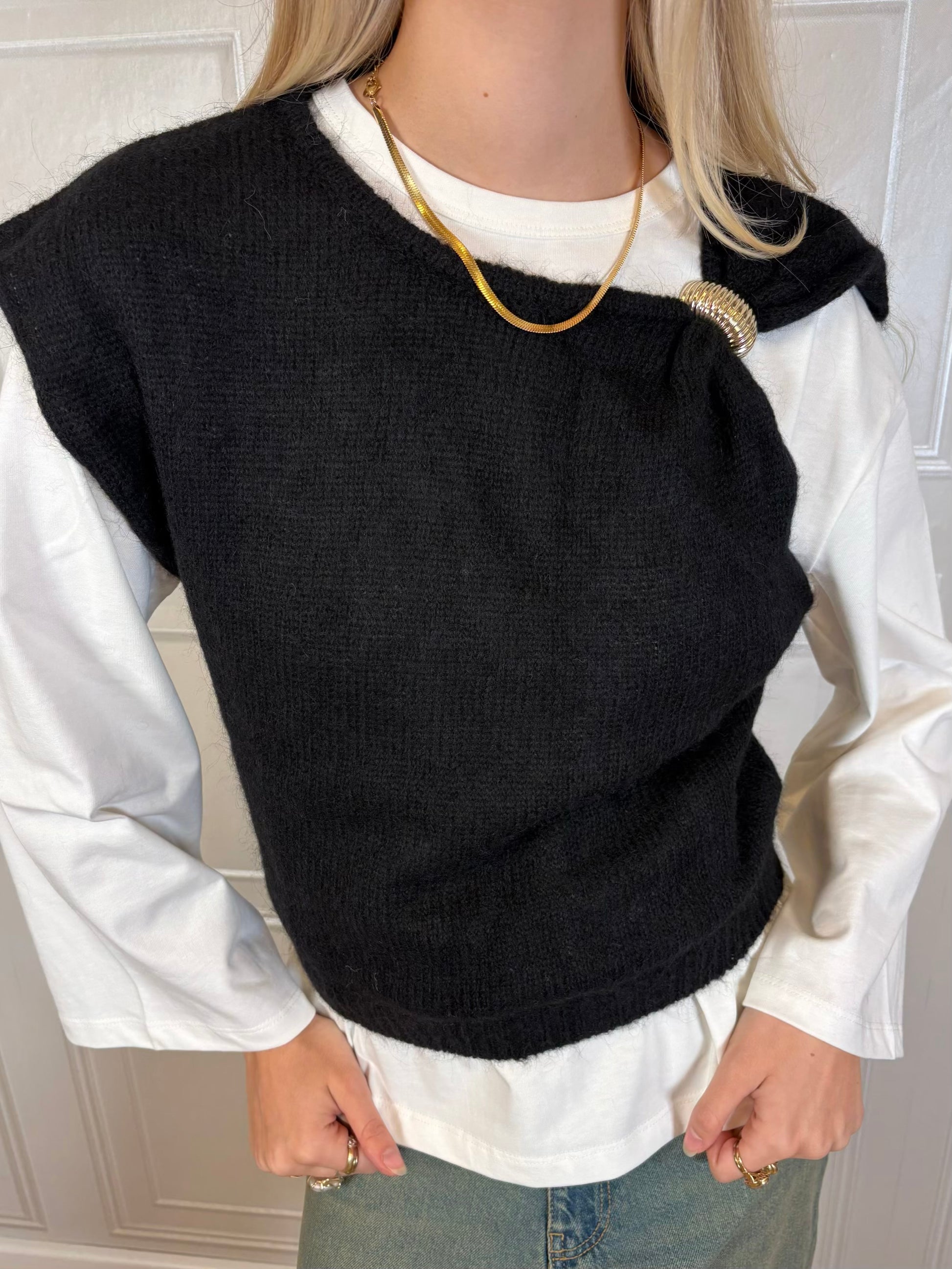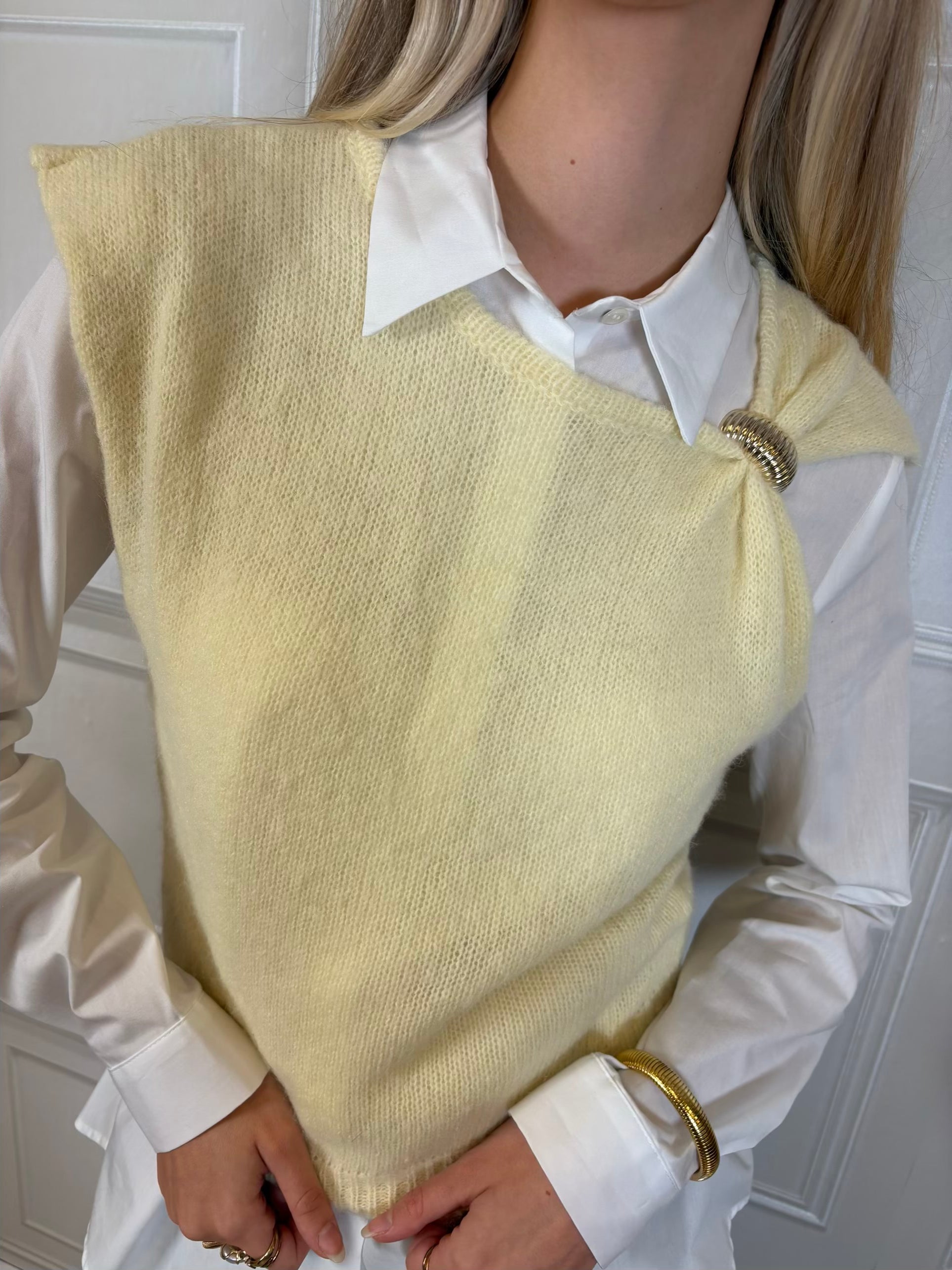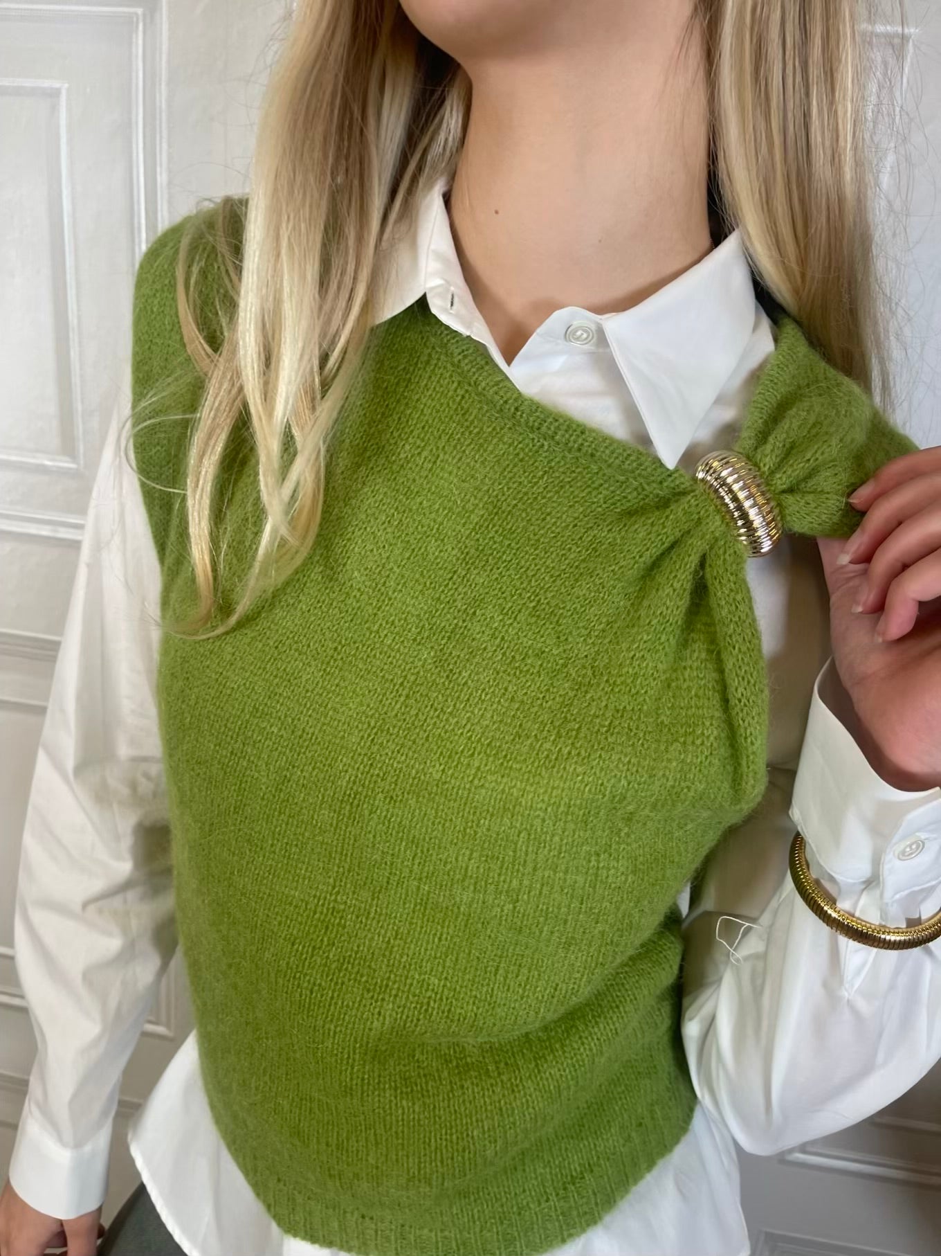 Gilet in maglia con dettaglio a fermaglio su spalla di gioiello oro. Taglia unica, vestibilità regolare. Lunghezza da spalla: 50 cm circa.