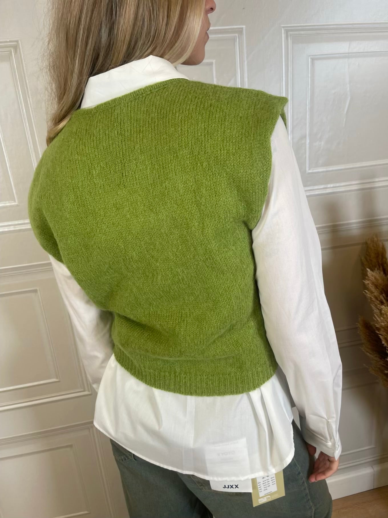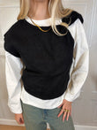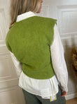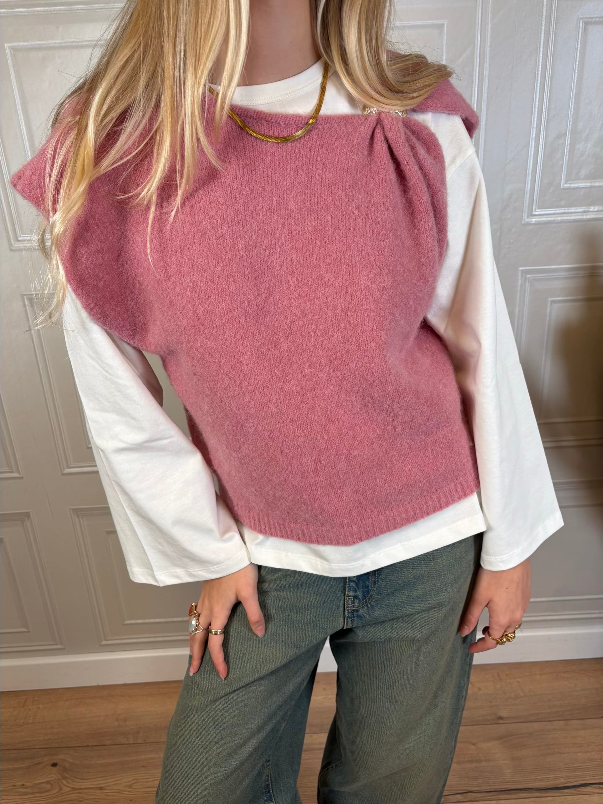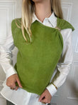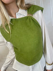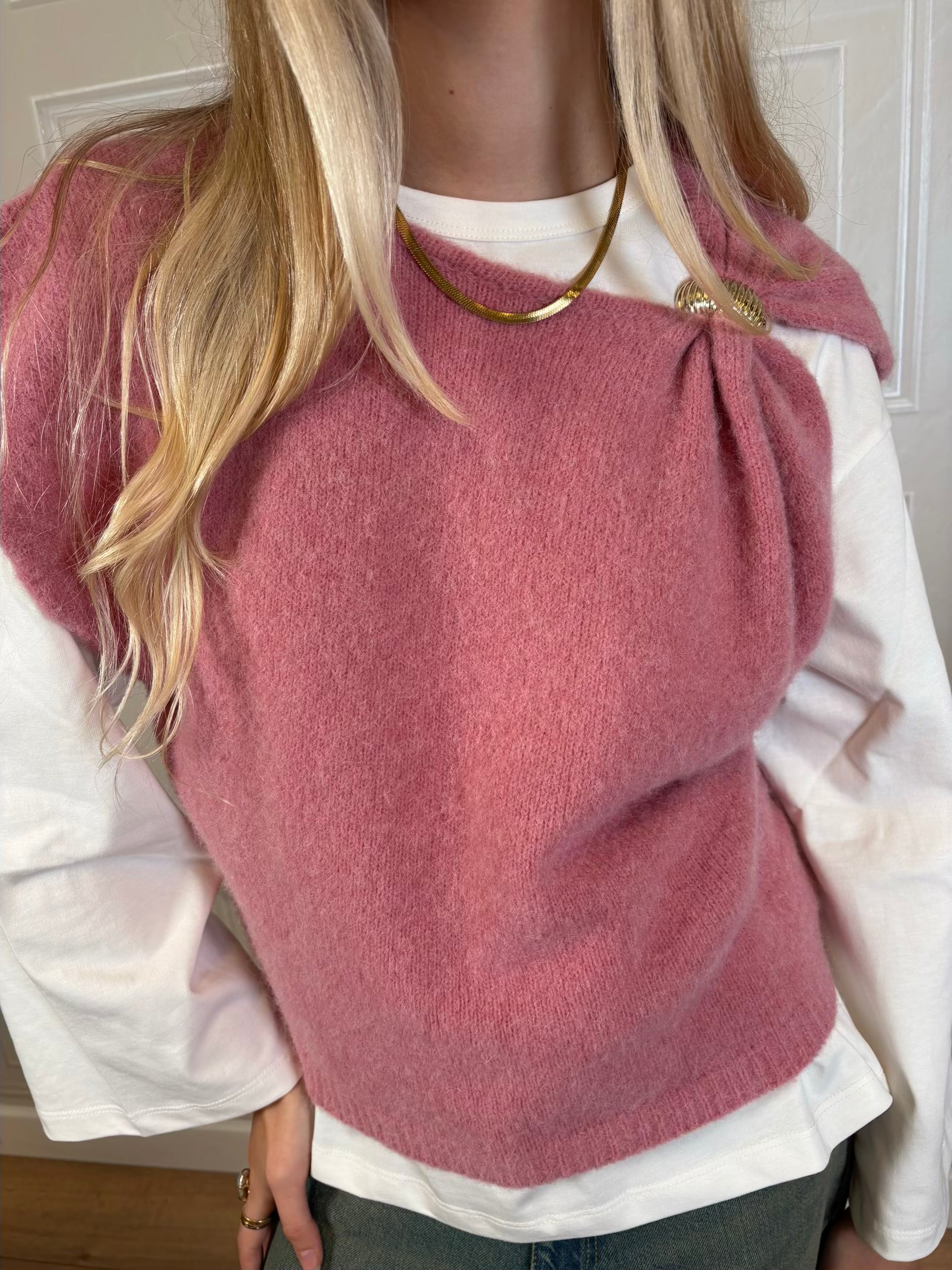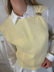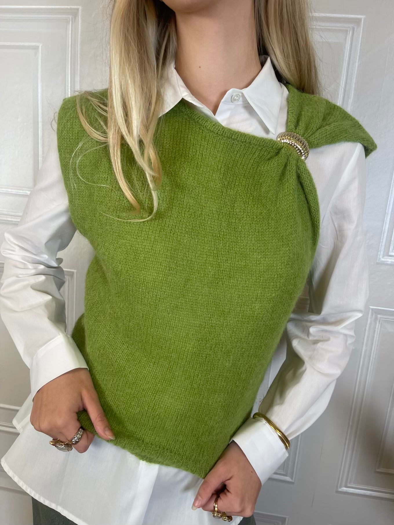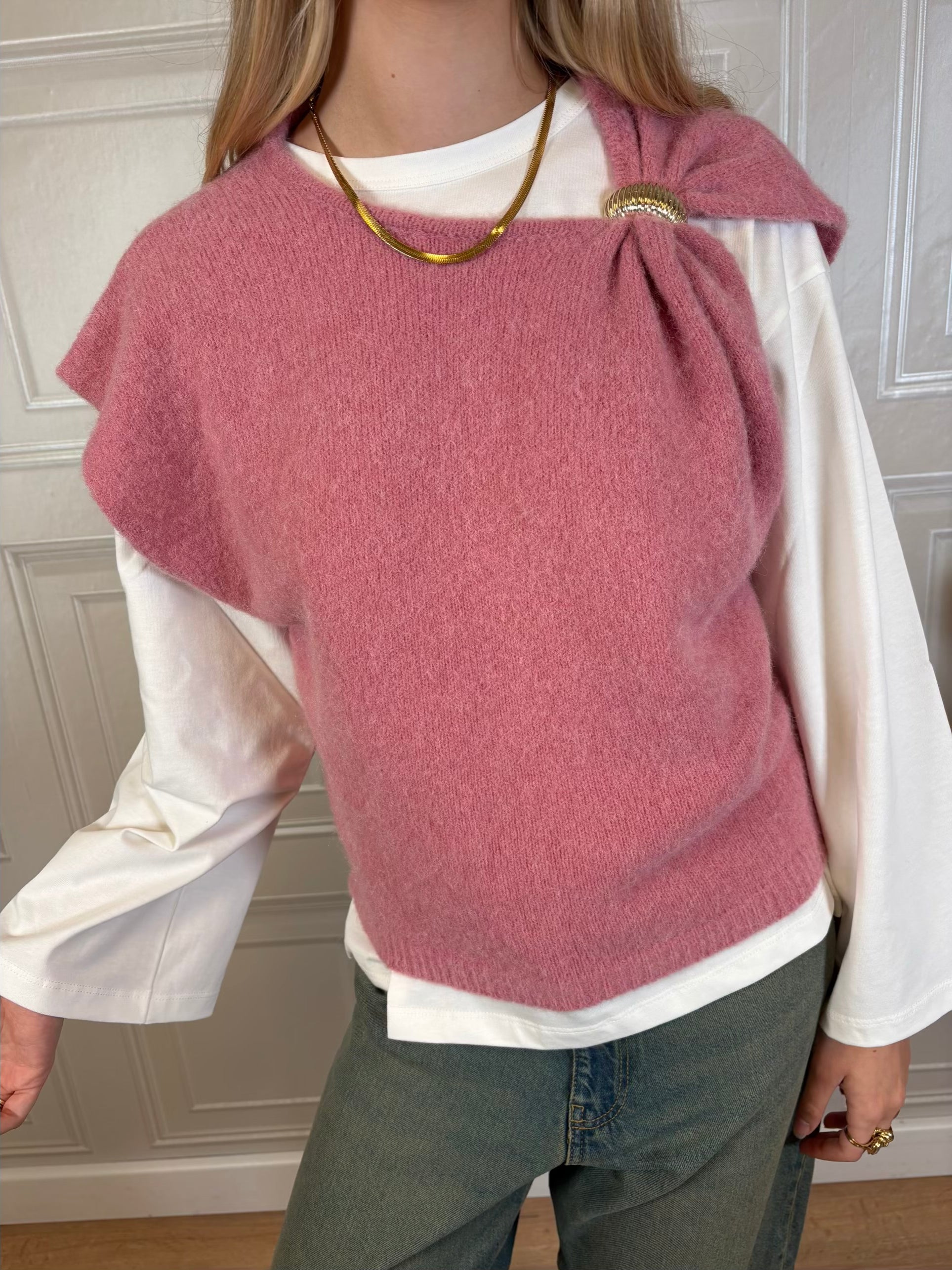 Gilet in maglia con dettaglio a fermaglio su spalla di gioiello oro. Taglia unica, vestibilità regolare. Lunghezza da spalla: 50 cm circa.
