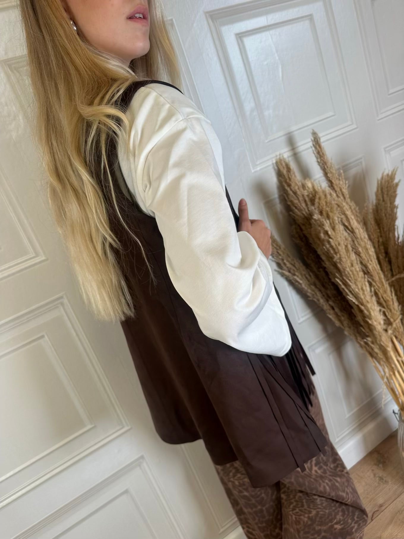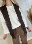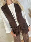Gilet frange moro. Modello con scollo a V .Chiusura anteriore con bottone. Dettaglio di frange anteriori.