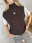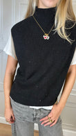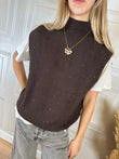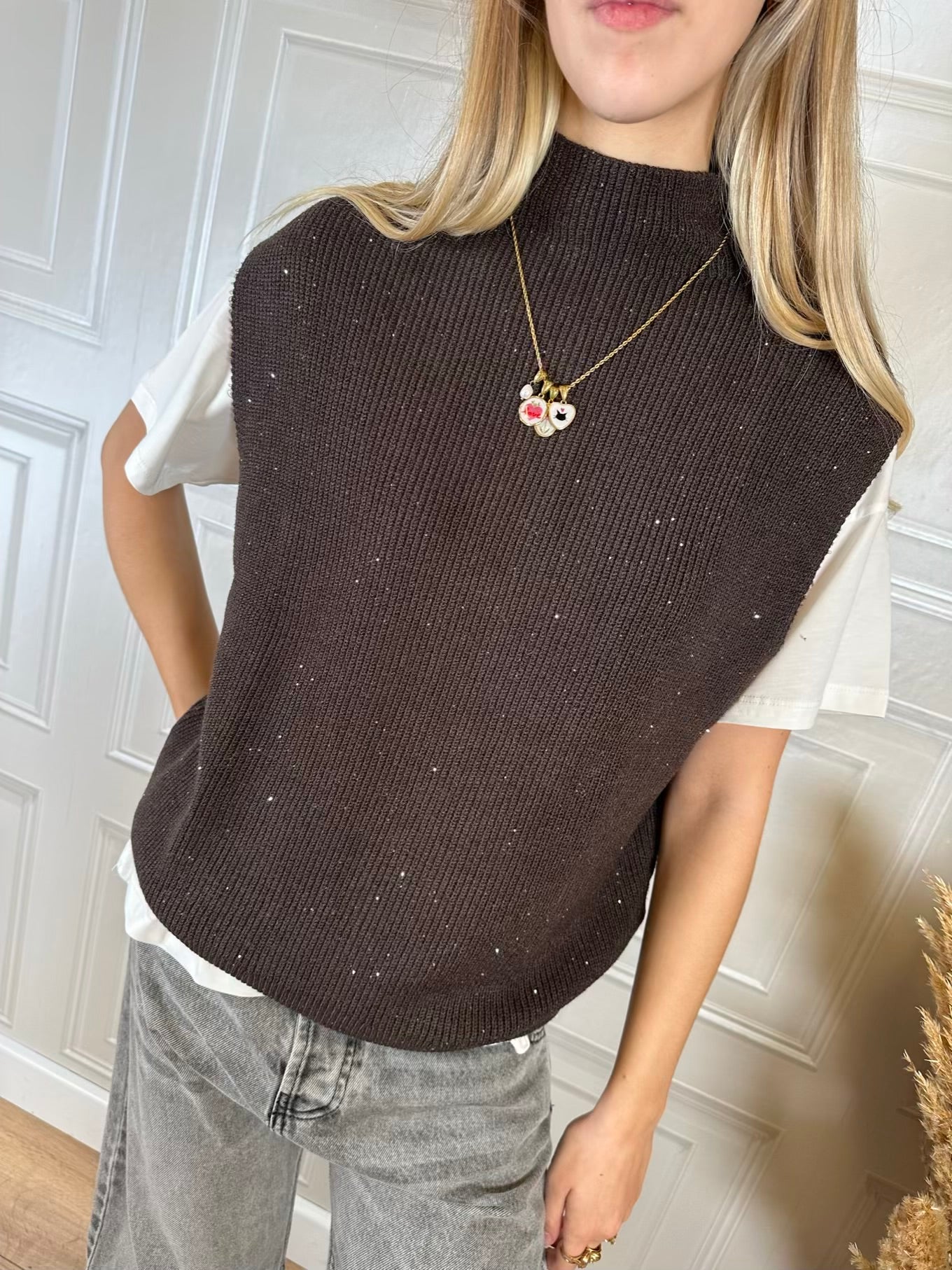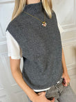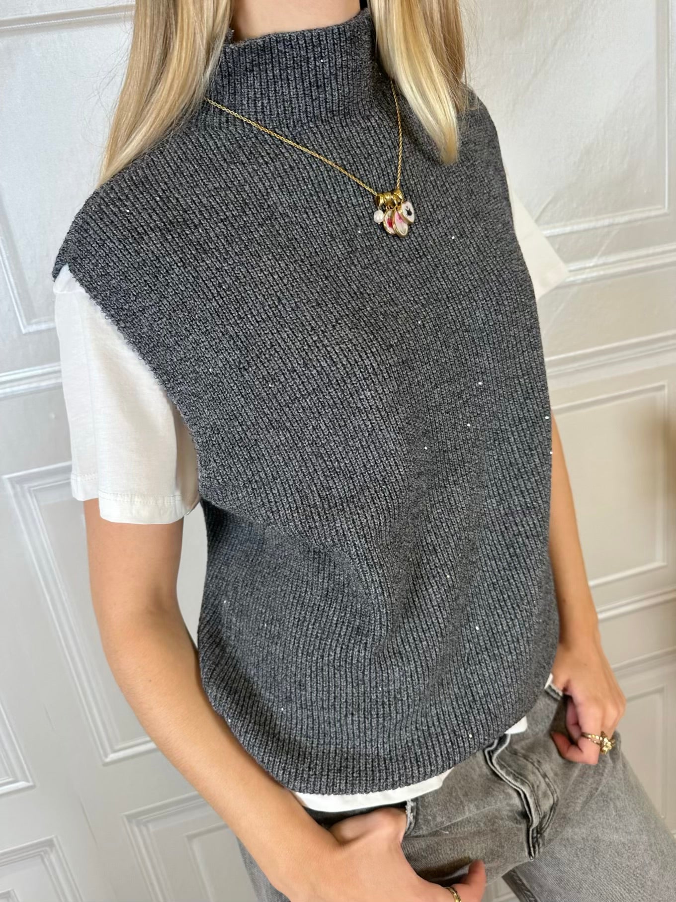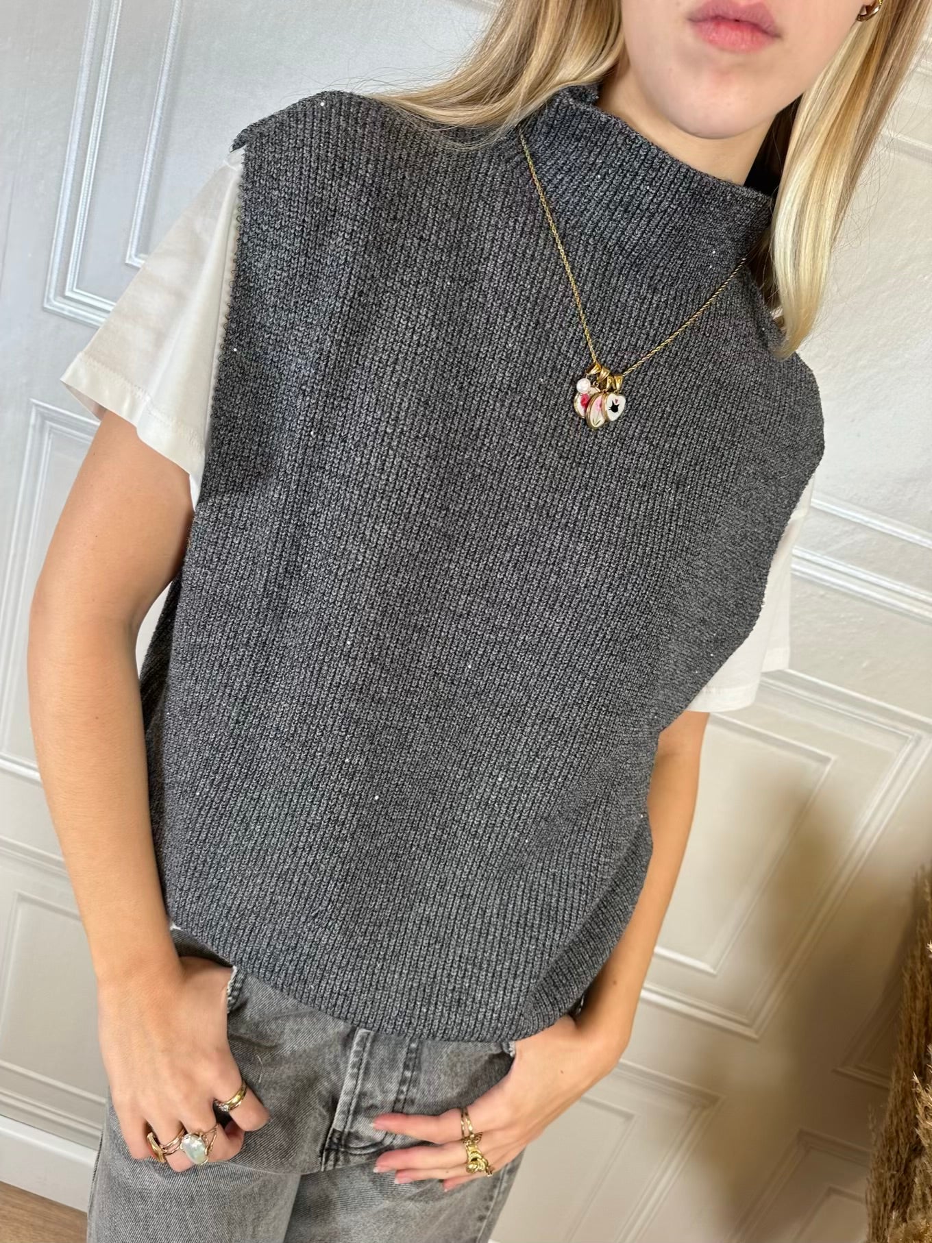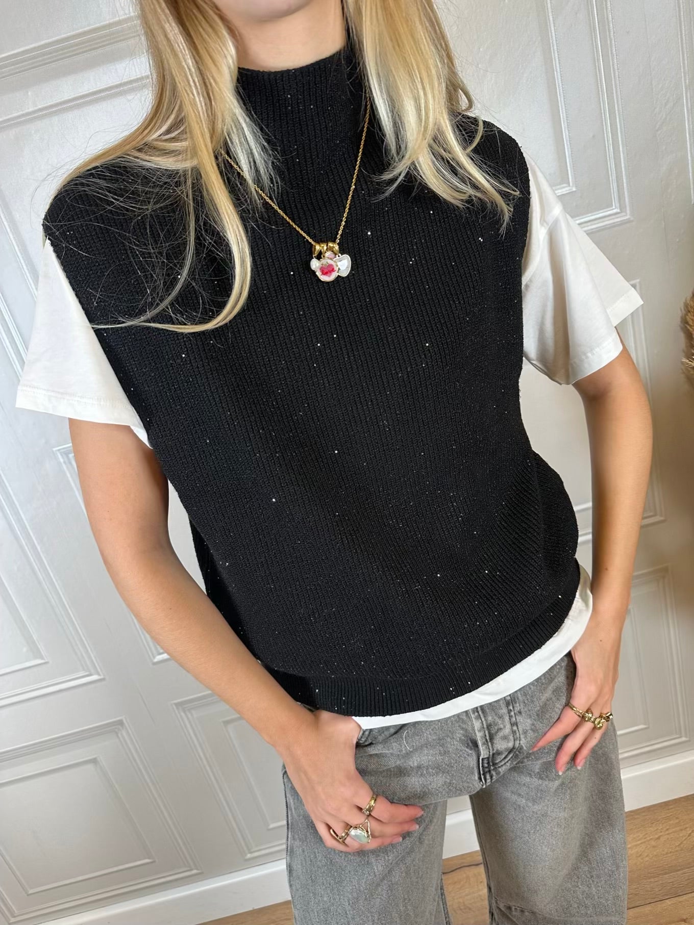 Gilet a costa inglese in viscosa con micro paillettes. Modello smanicato con collo a lupetto. Taglia unica, vestibilità over.