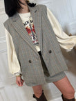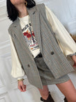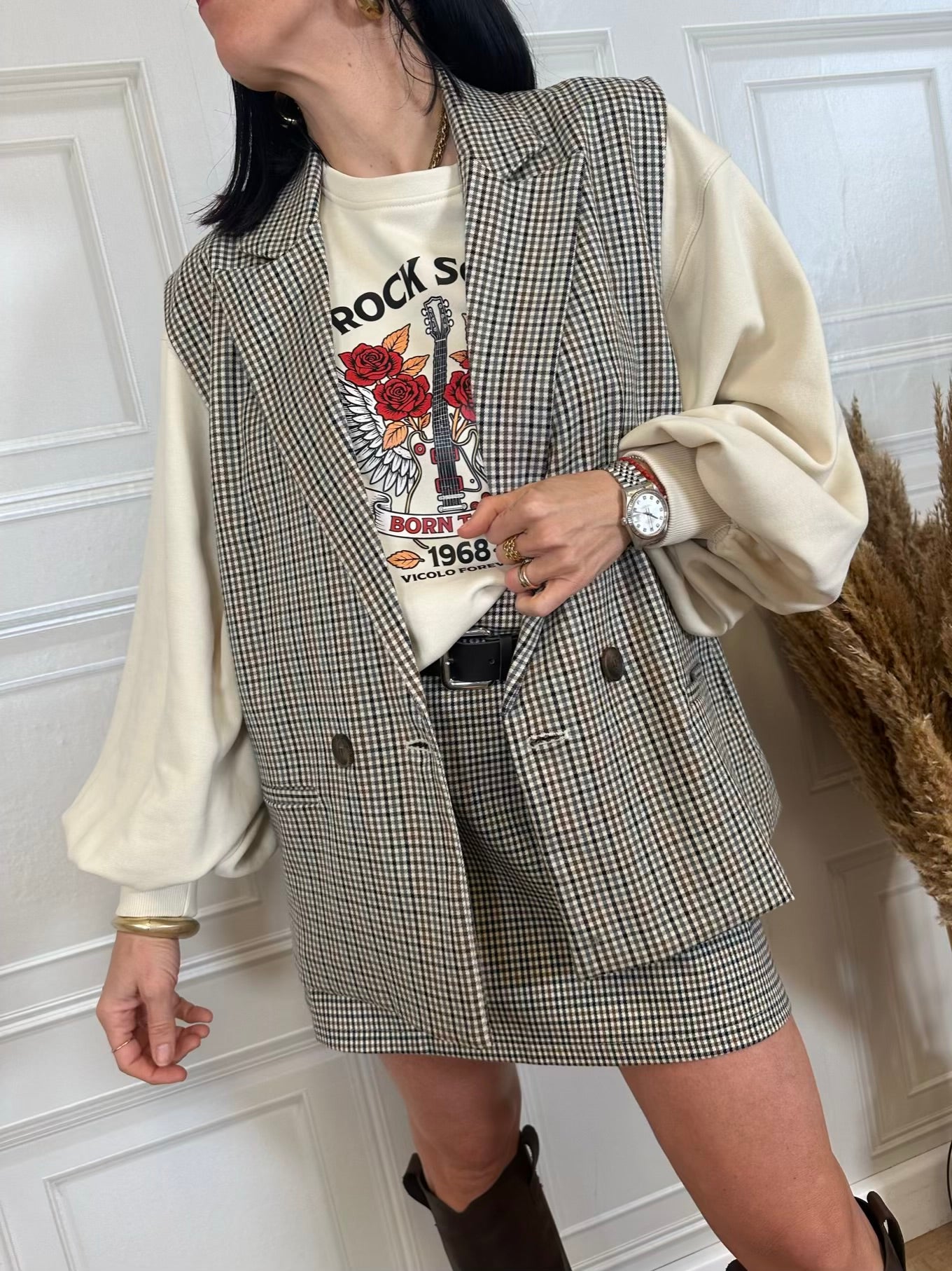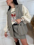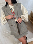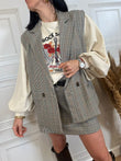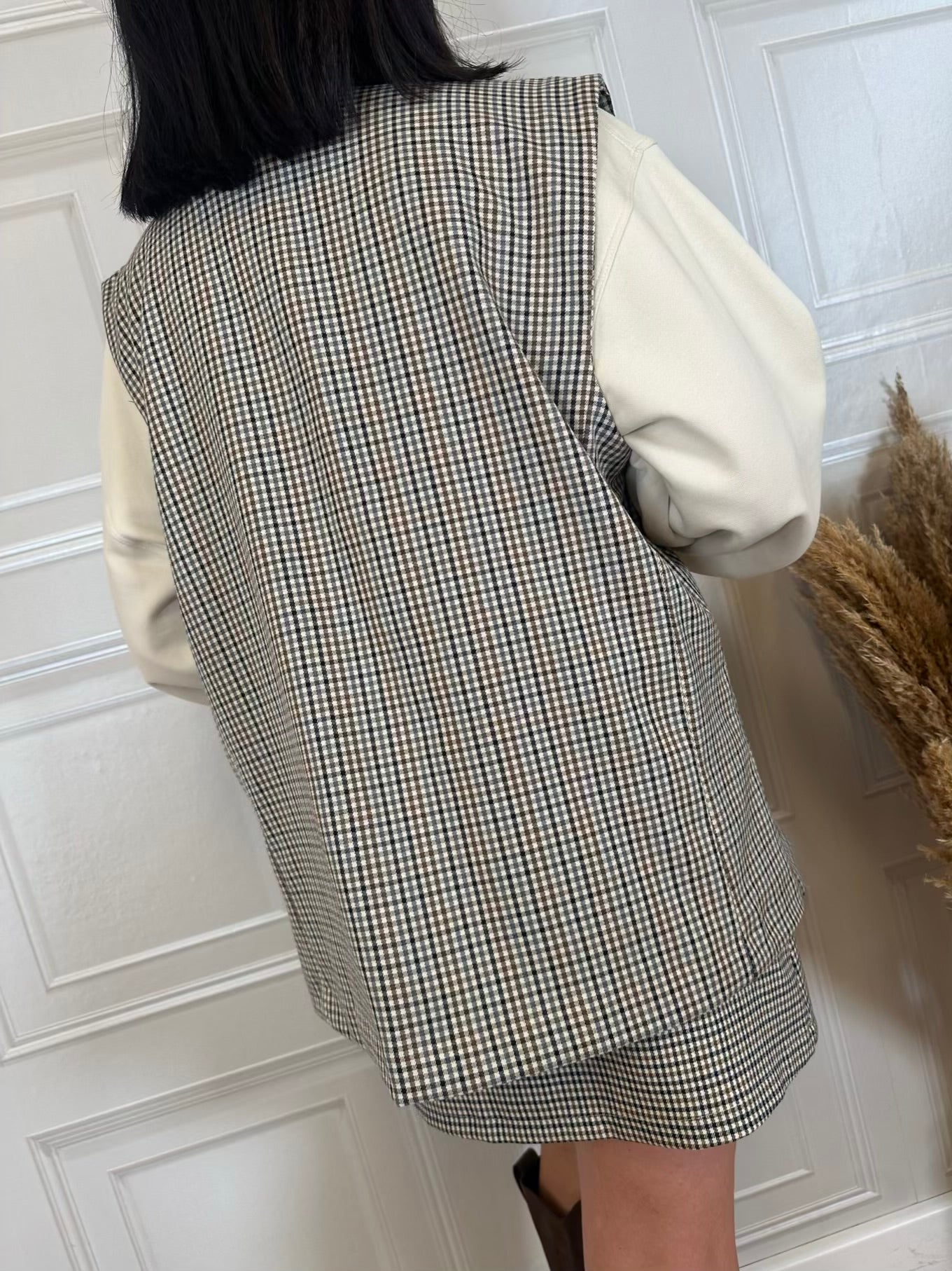 Gilet a quadretti con scollo a V. Chiusura con doppio bottone e taschine finte a filetto sul fronte. Vestibilità over, taglia unica. Sui toni del nero, cammello e carta da zucchero.