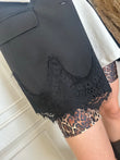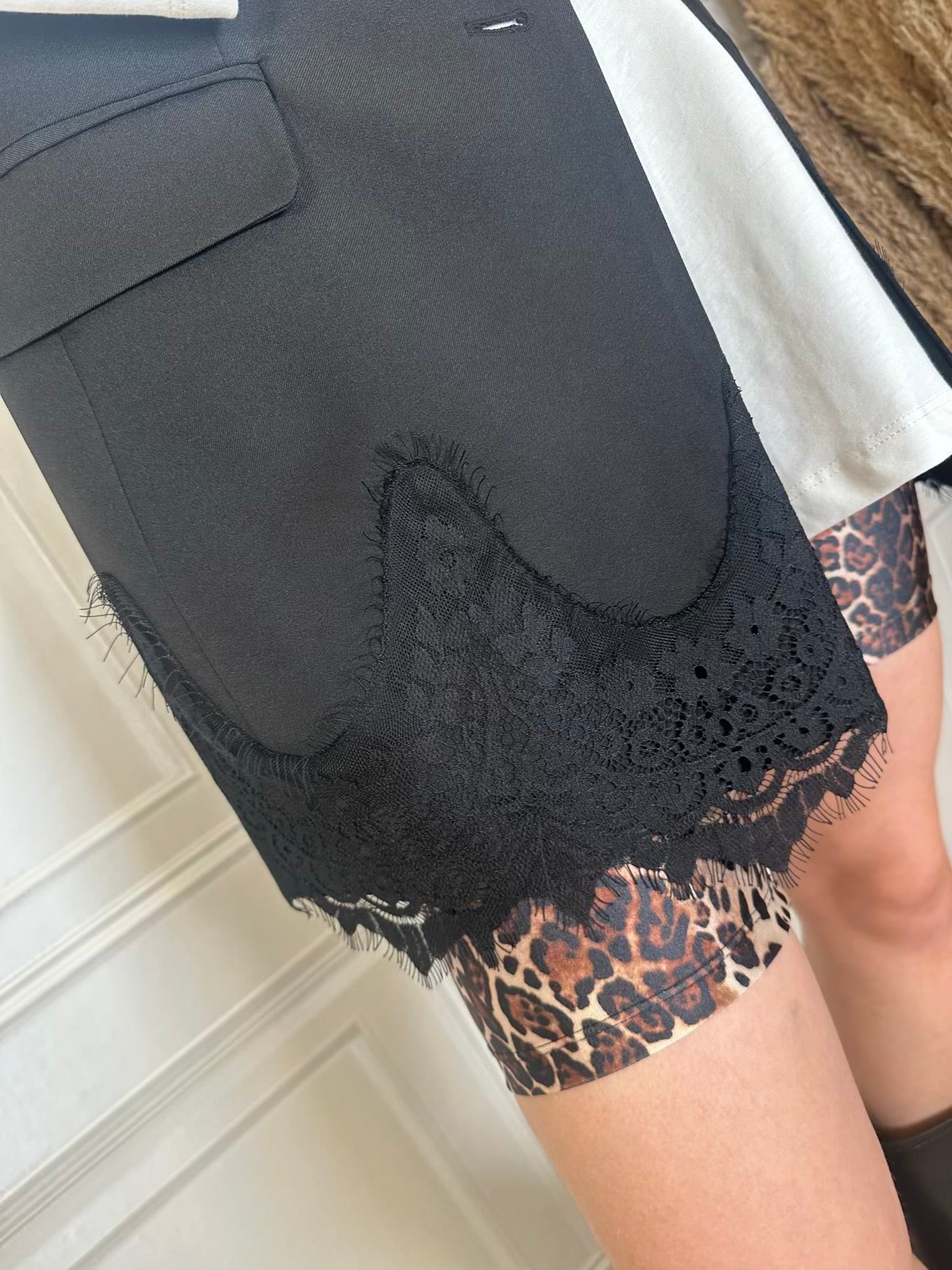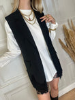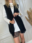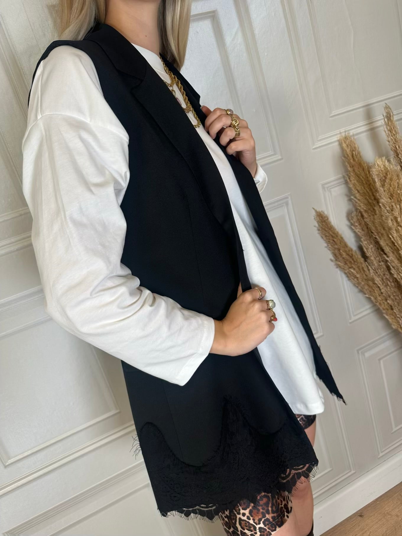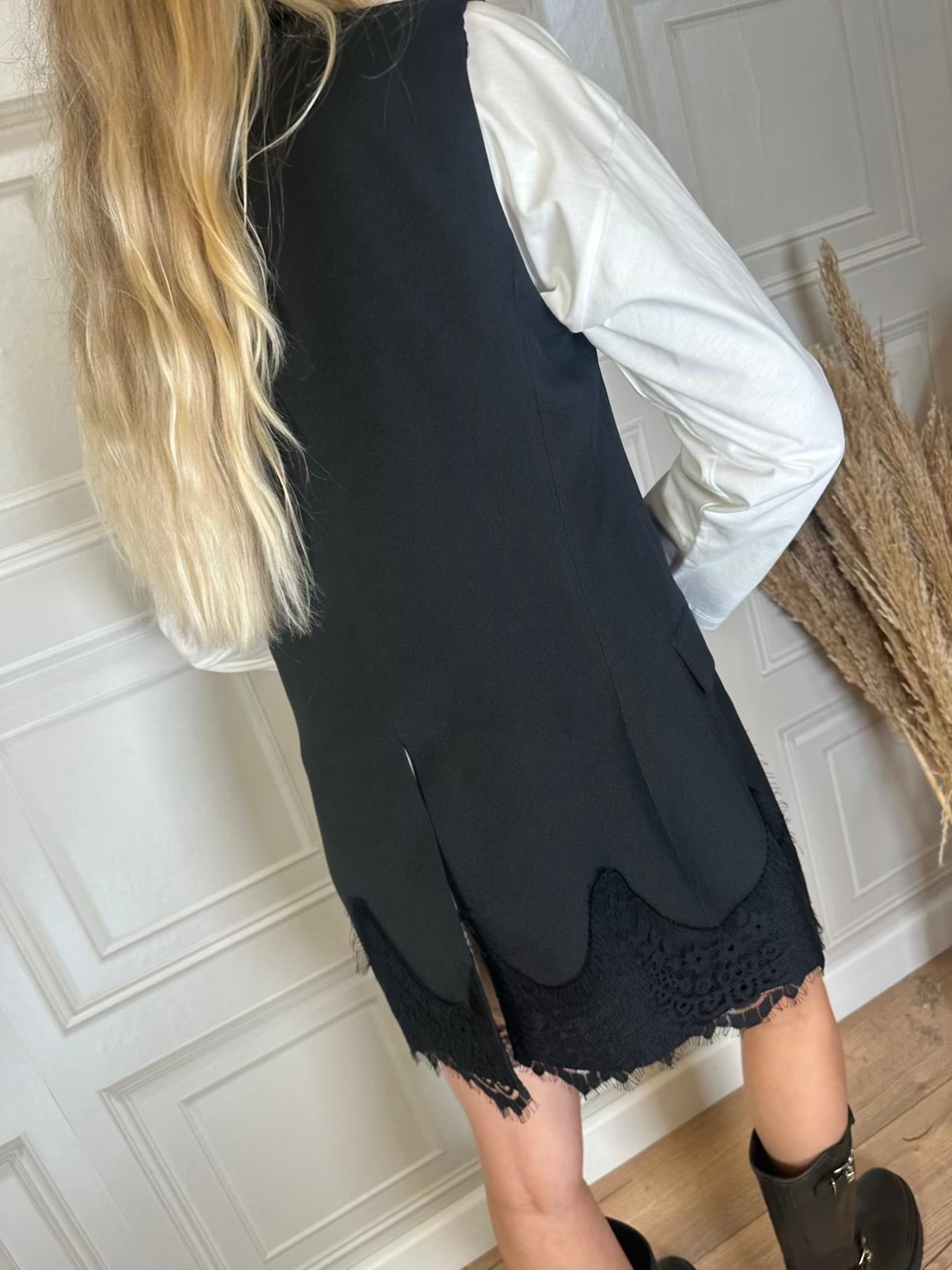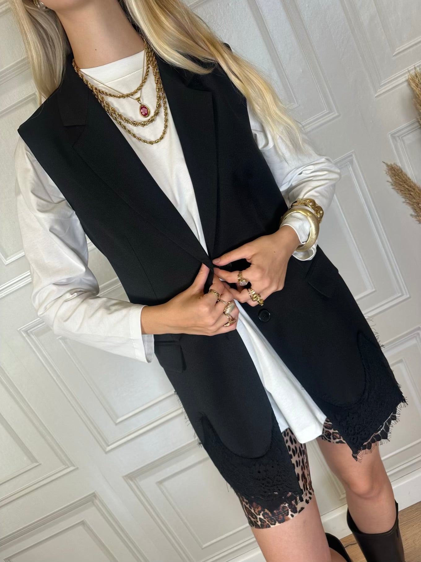 Gilet nero scollo a V. Chiusura con doppio bottone. Tasche frontali con patta. Pizzo sul fondo