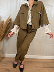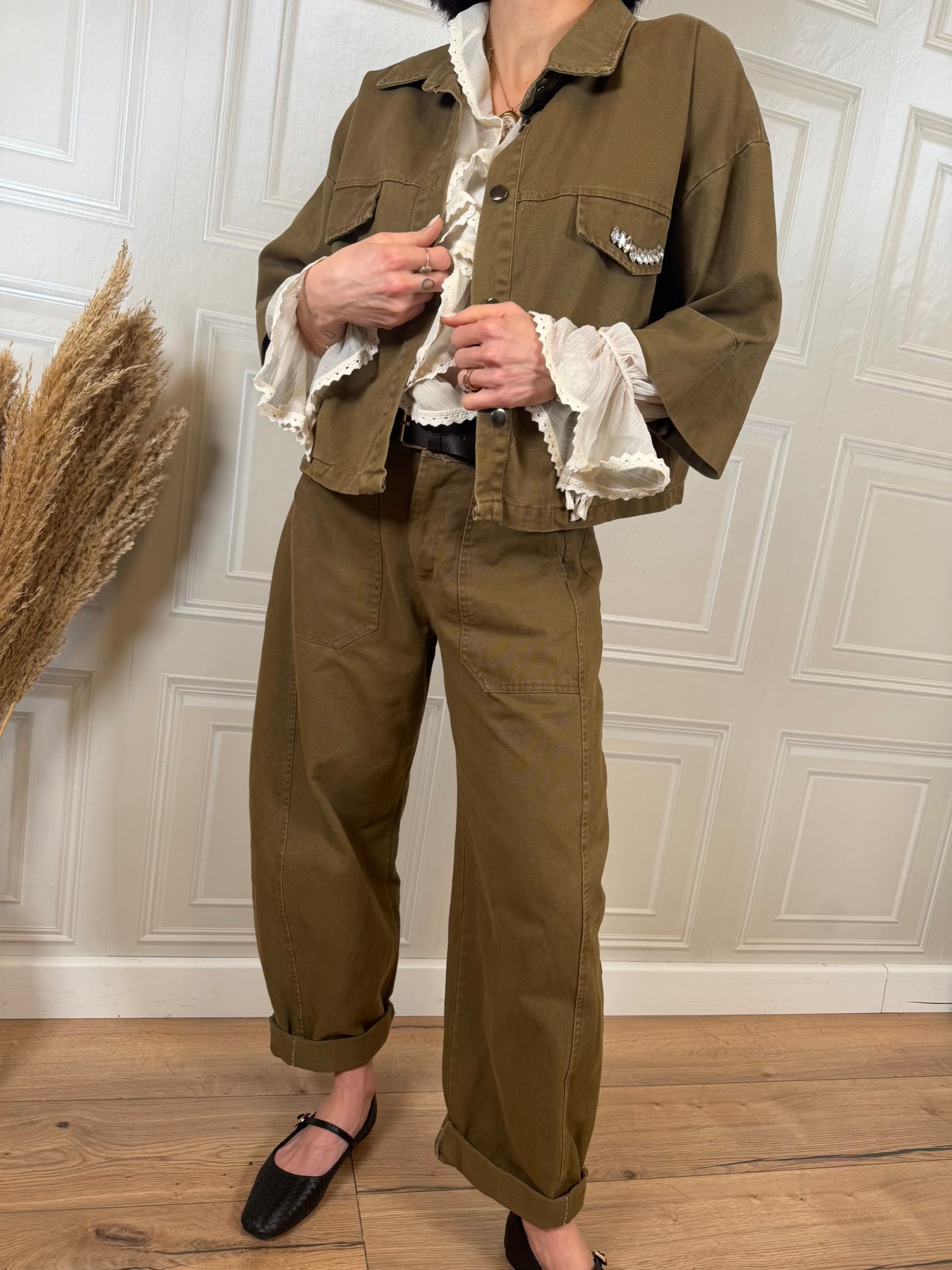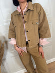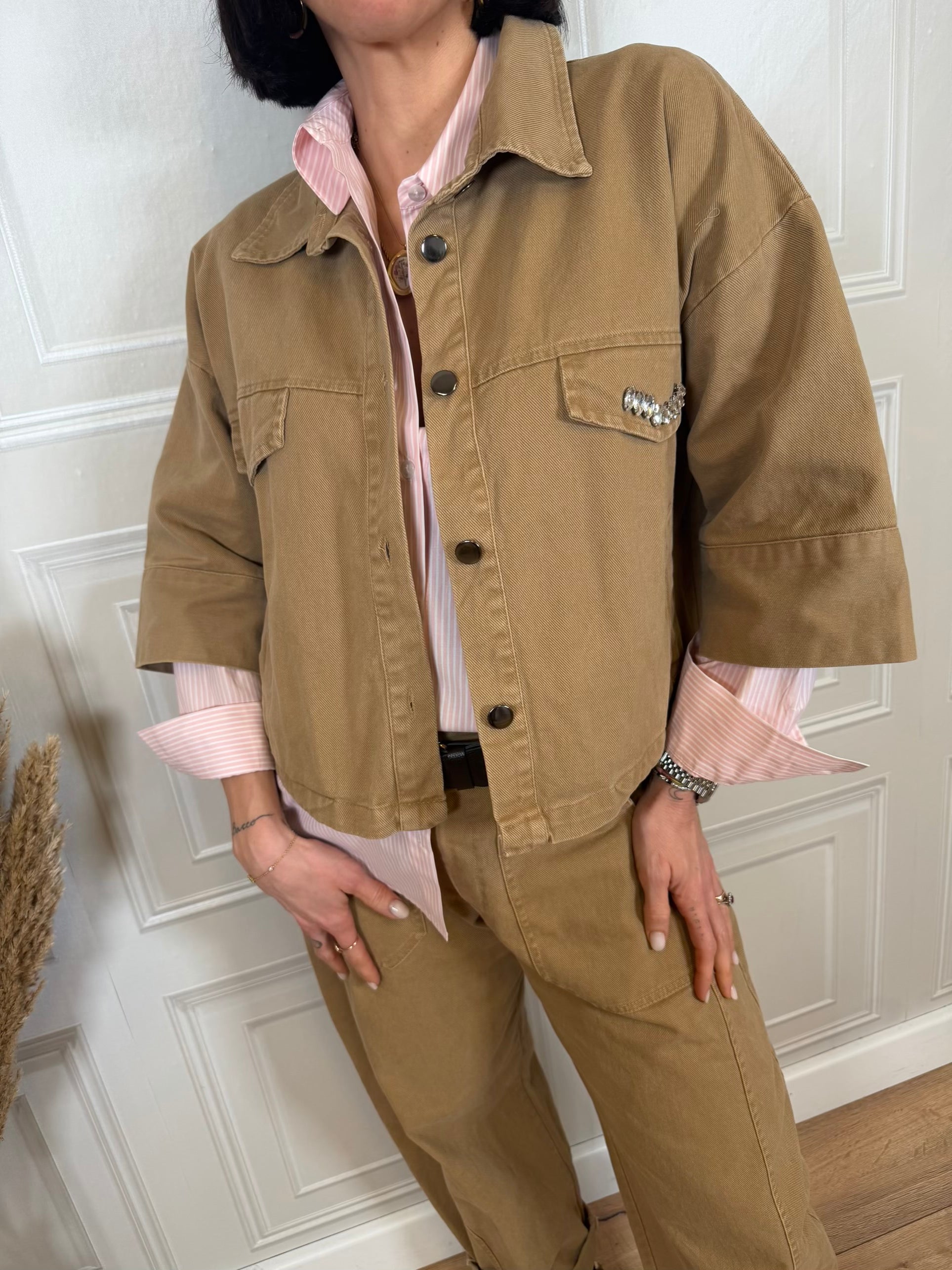 Giubbino in jeans tinto capo. Modello a manica a tre quarti con spalla scesa. Due tasche a filetto e due con patta finte sul fronte. Dettaglio di cabochon sul taschino. Chiusura con bottoncini. Taglia unica, vestibilità regolare.