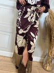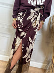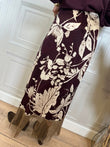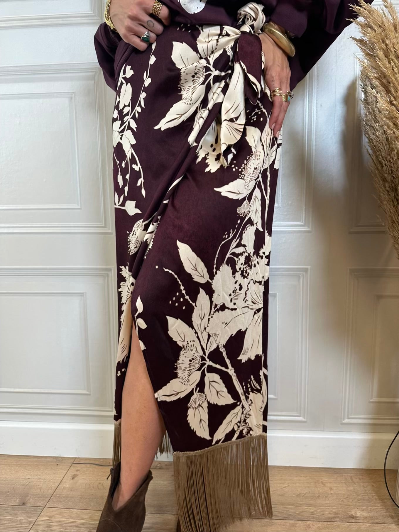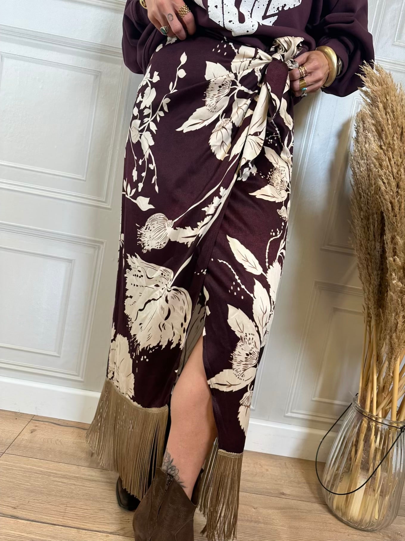 Gonna pareo floreale con frange sul fondo color vino. Chiusura con nodo laterale e zip sul retro. In foto taglia S, vestibilità regolare.