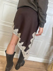 Gonna asimmetrica gessata con pizzo sul fondo. Spacco laterale. Lunghezza parte corta 33cm, lunghezza parte lunga 74cm. Elastico in vita.