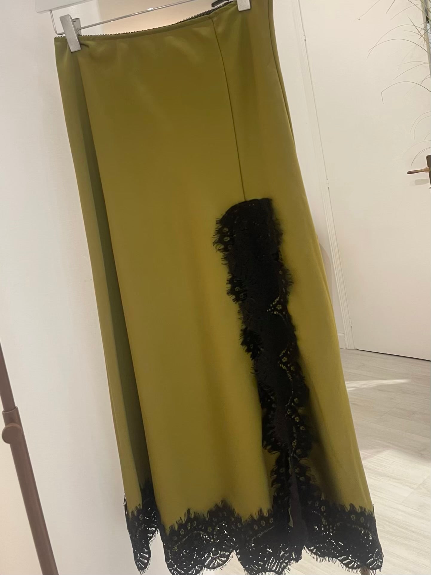 Gonna lingerie. Modello con pizzo sul fondo e sullo spacco laterale. Elastico in vita. Vestibilità regolare.