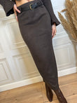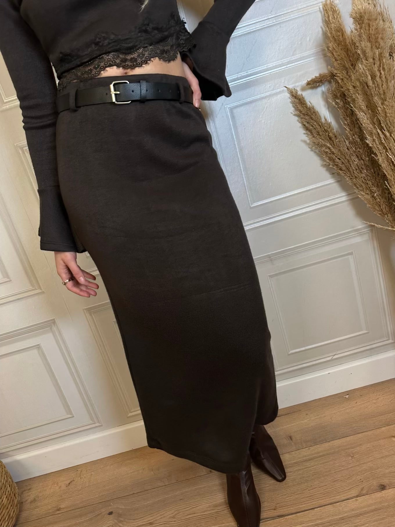 Gonna in calda maglia di viscosa. Modello lungo a matita con elastico in vita. Cintura in ecopelle compresa. Elastico in vita. Spacco sul retro. In foto taglia S, Vestibilità regolare.