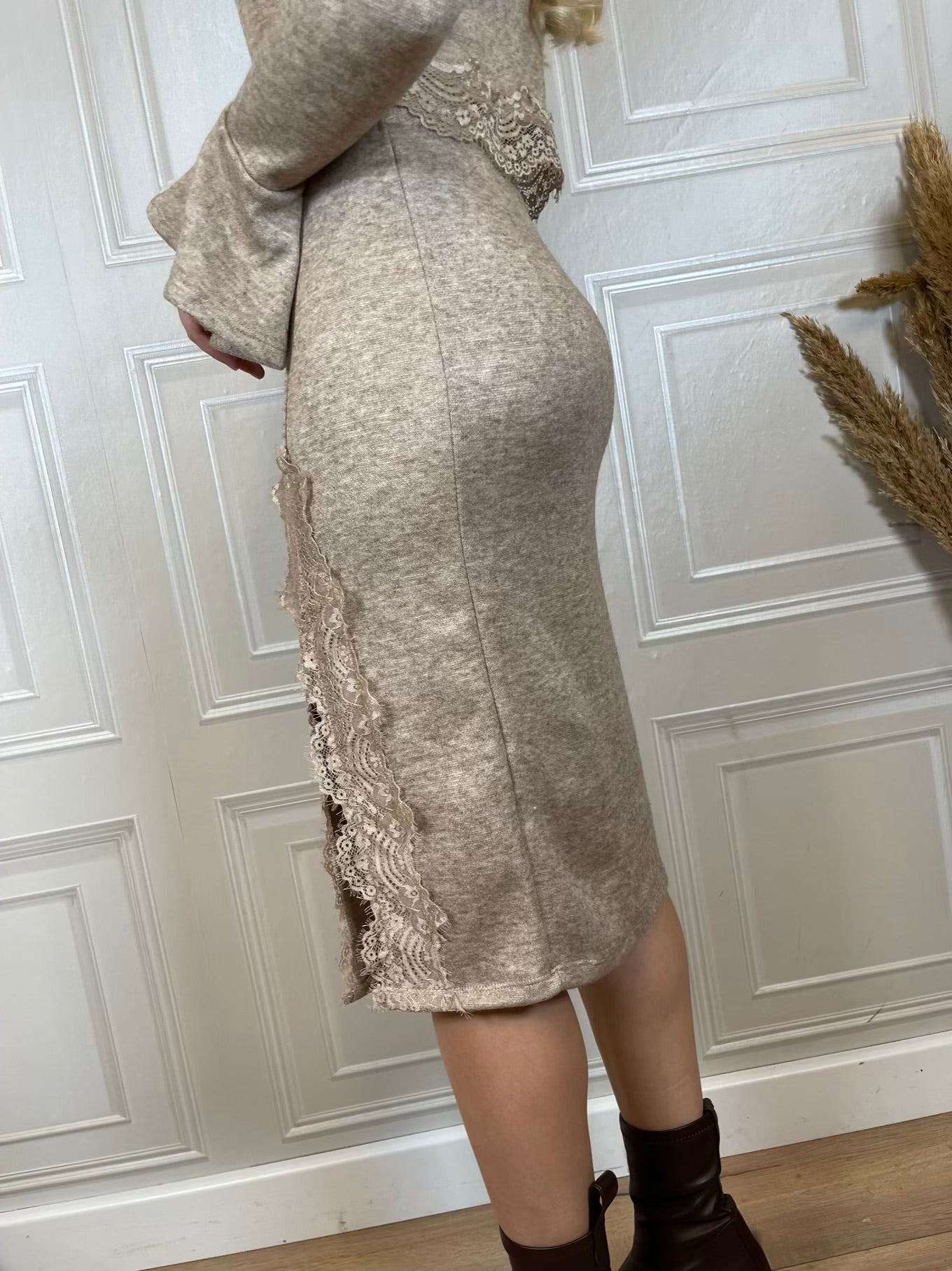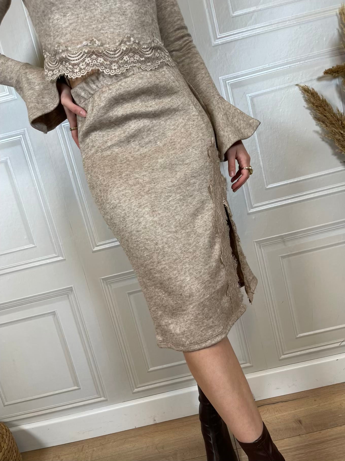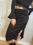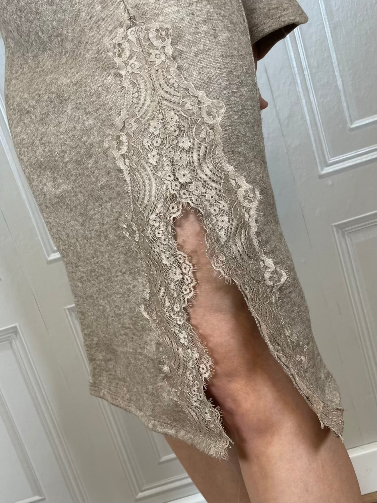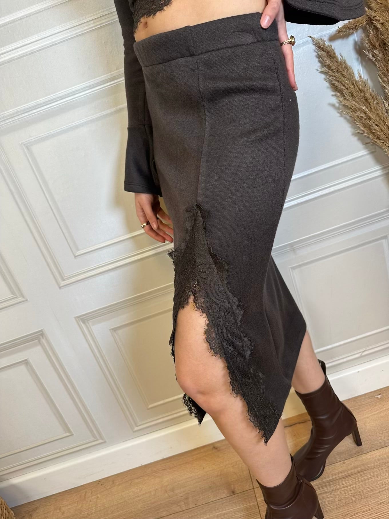Gonna midi con spacco laterale con inserto in pizzo. Elastico in vita. In foto taglia S, Vestibilità regolare. Lunghezza: 66 cm circa.