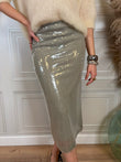 Gonna di paillettes color ghiaccio. Modello midi con elastico in vita e spacco sul retro. Sottogonna incorporato.