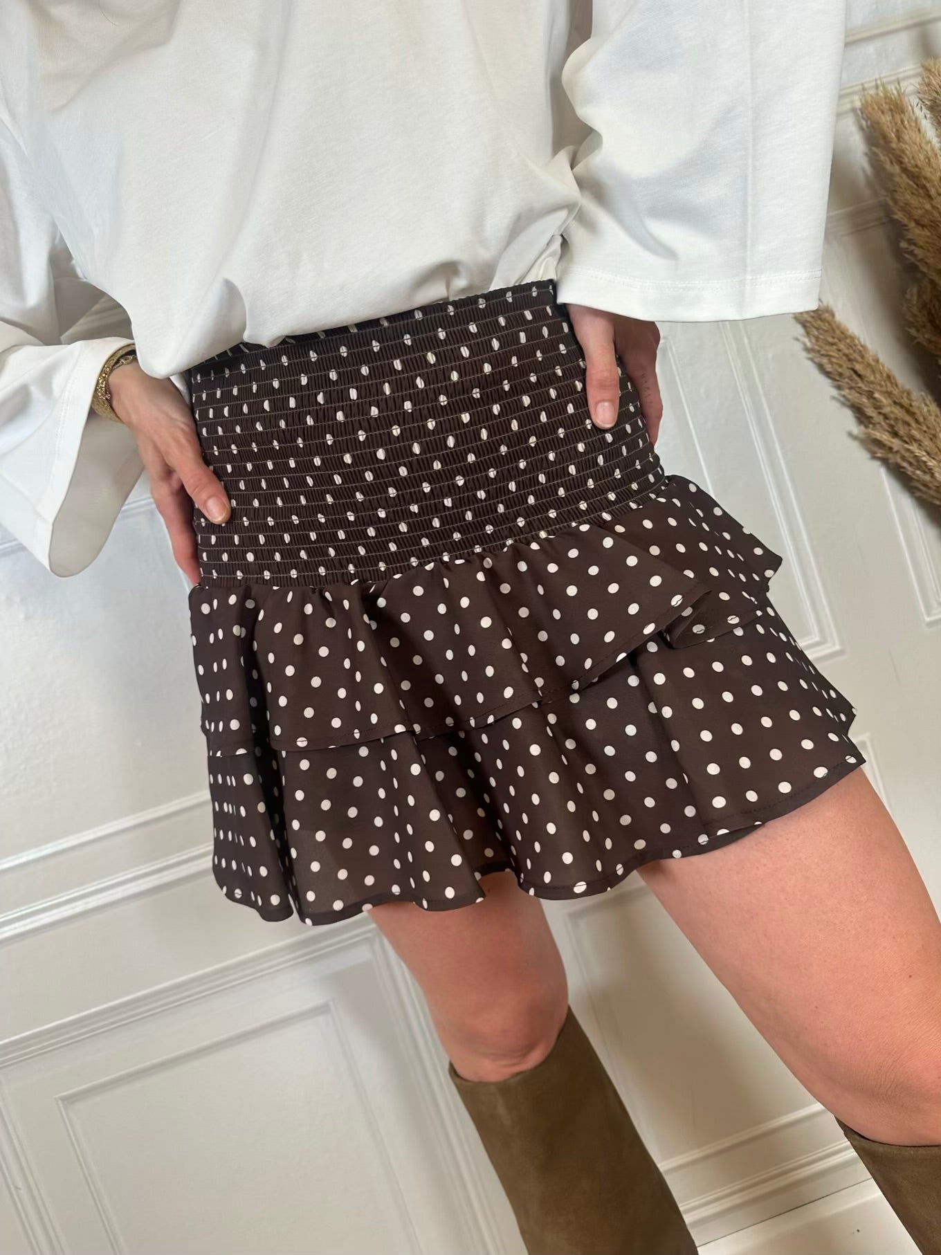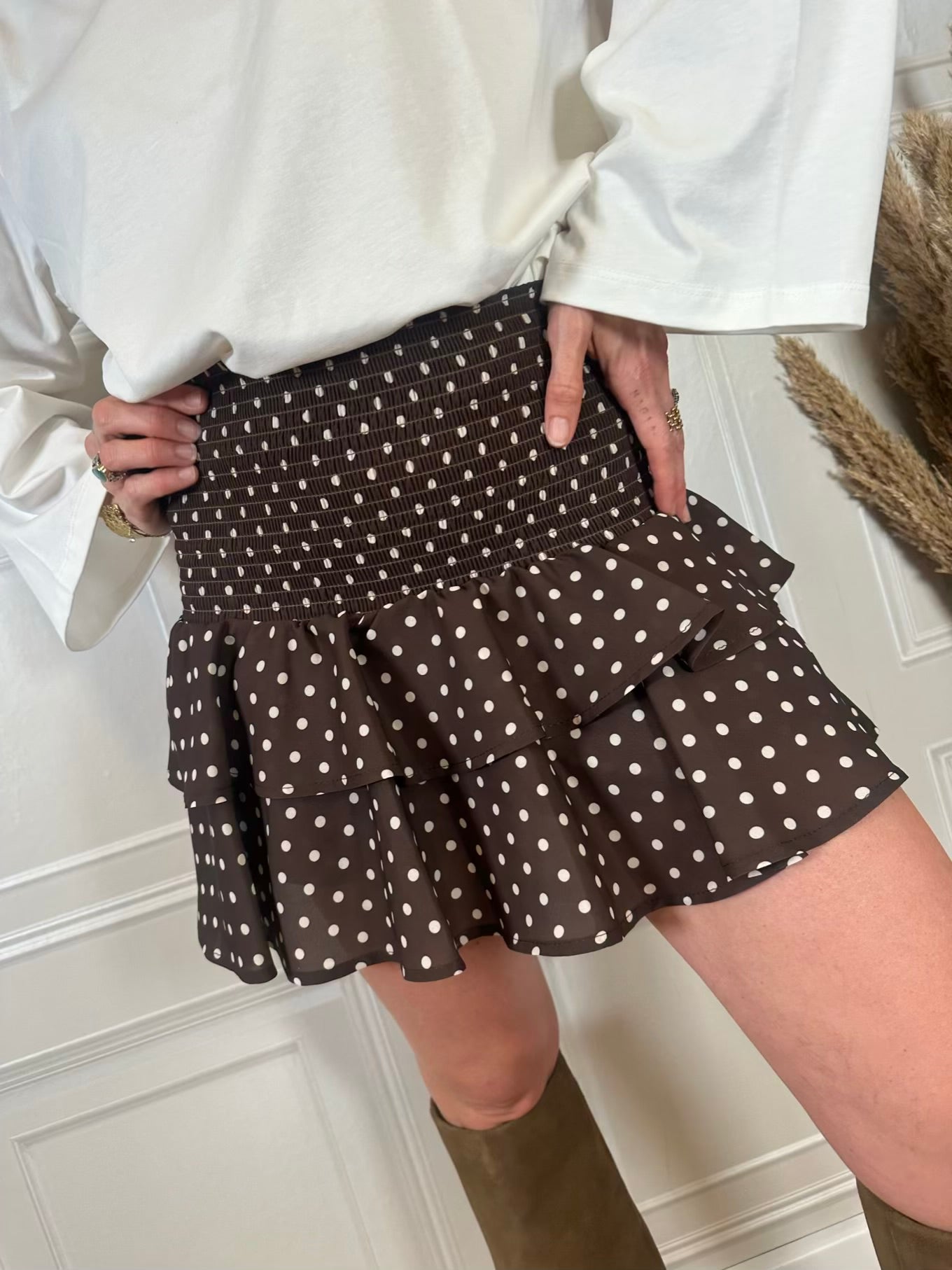 Gonna pantaloncino a pois, colore moro. Dettaglio voulant. Elastico in vita. In foto taglia S. Vestibilità elasticizzata.
