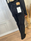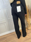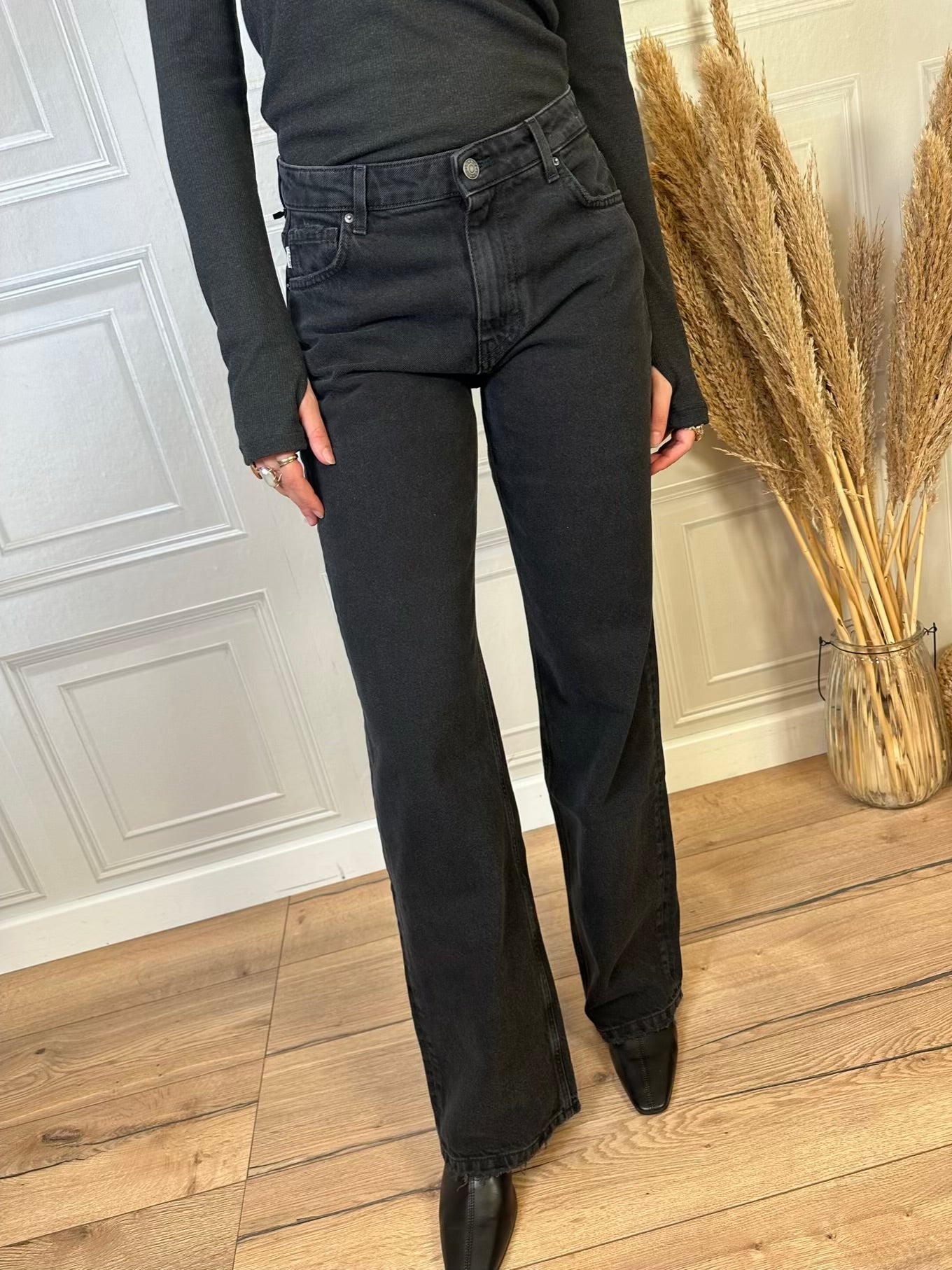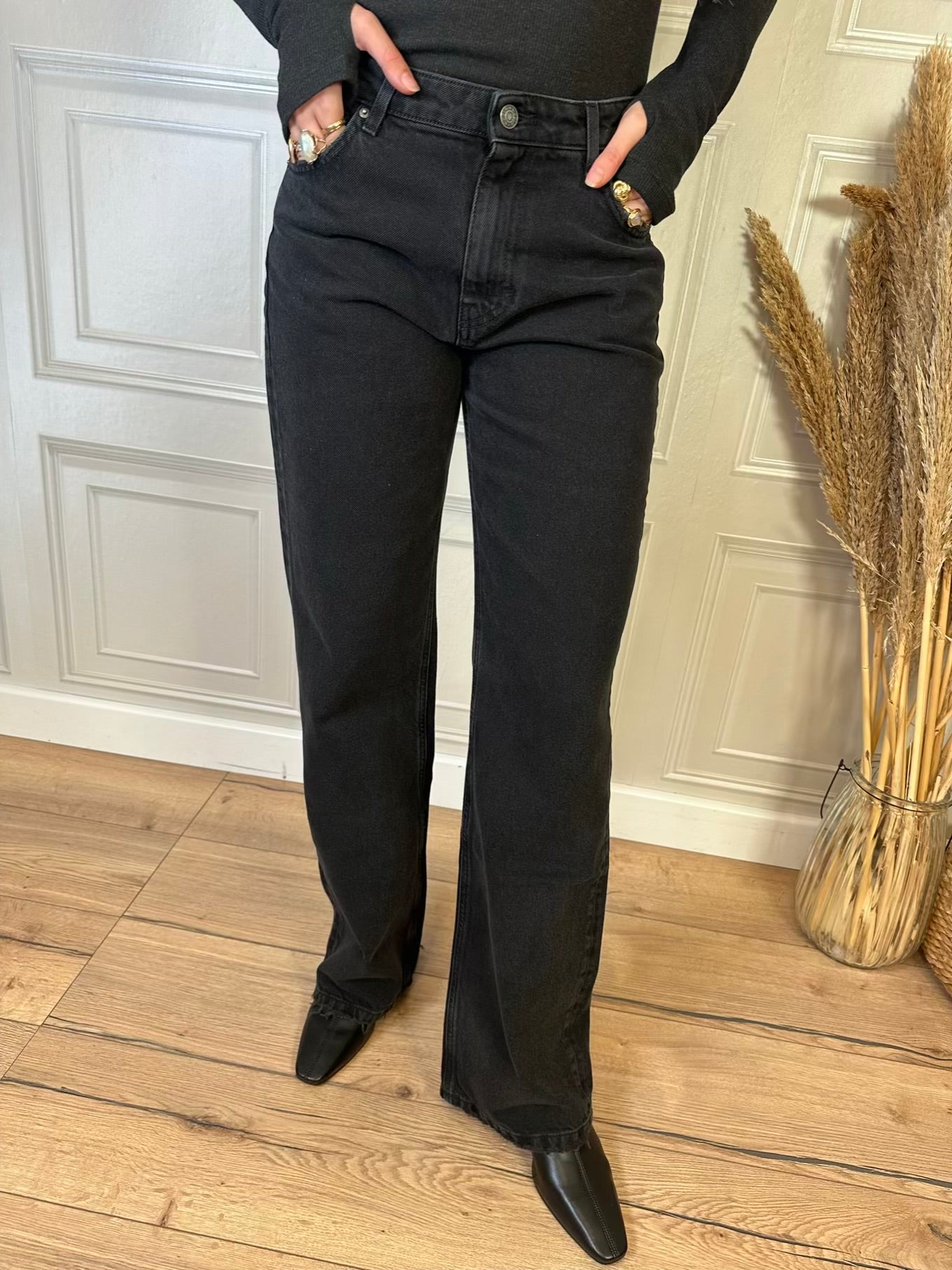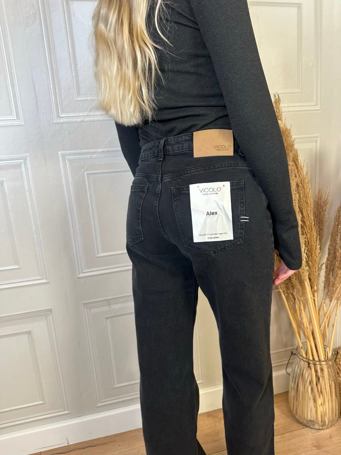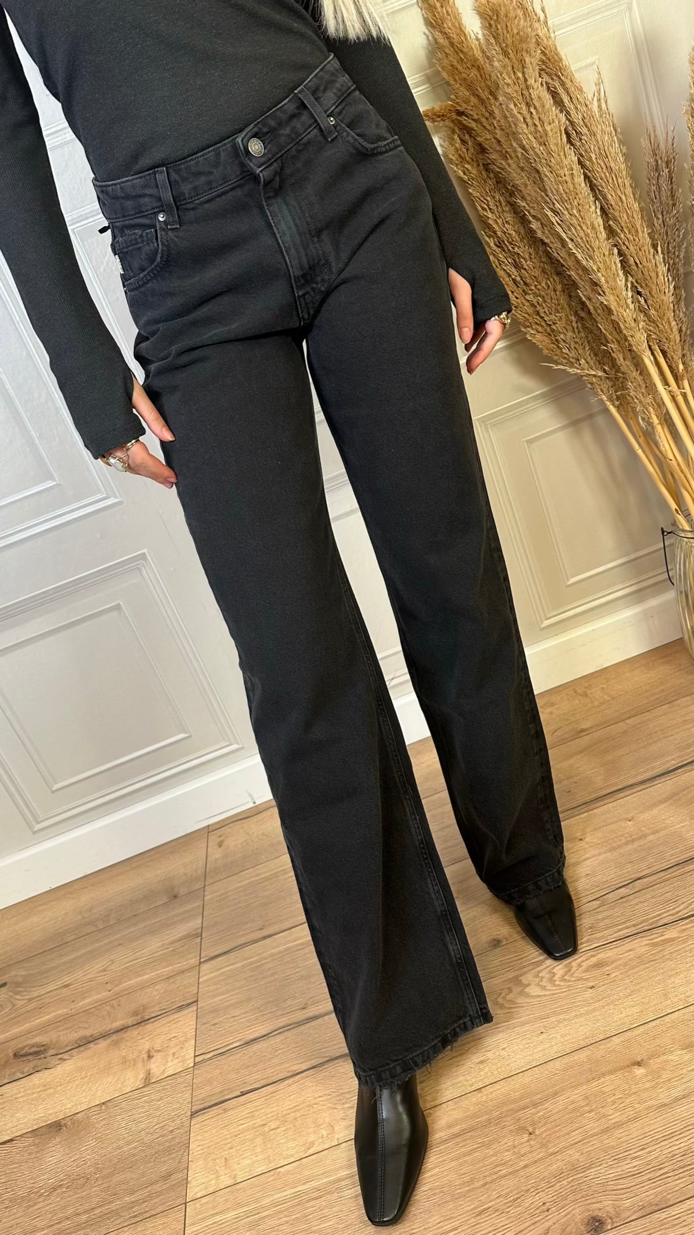 Jeans Alex Nero. Modello wide leg. Dotato di 5 tasche chiusura con cerniera e bottone. Vita media.