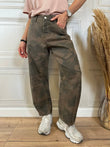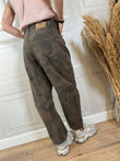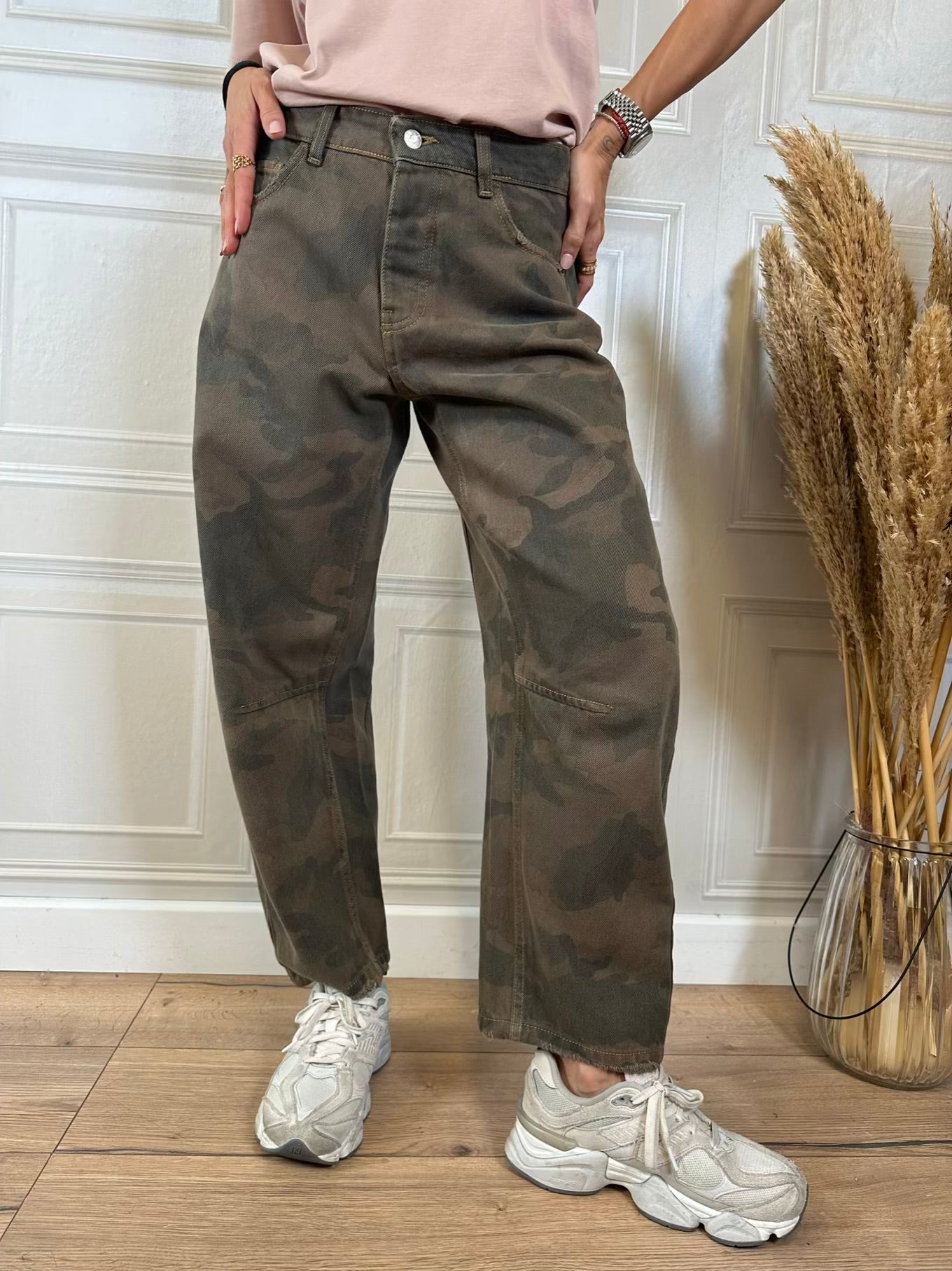 Jeans camouflage modello baloon fit cinque tasche. Chiusura frontale con zip e bottone. Pinces su ginocchio Vita media e gamba ampia. In foto taglia S, vestibilita’ regolare.