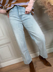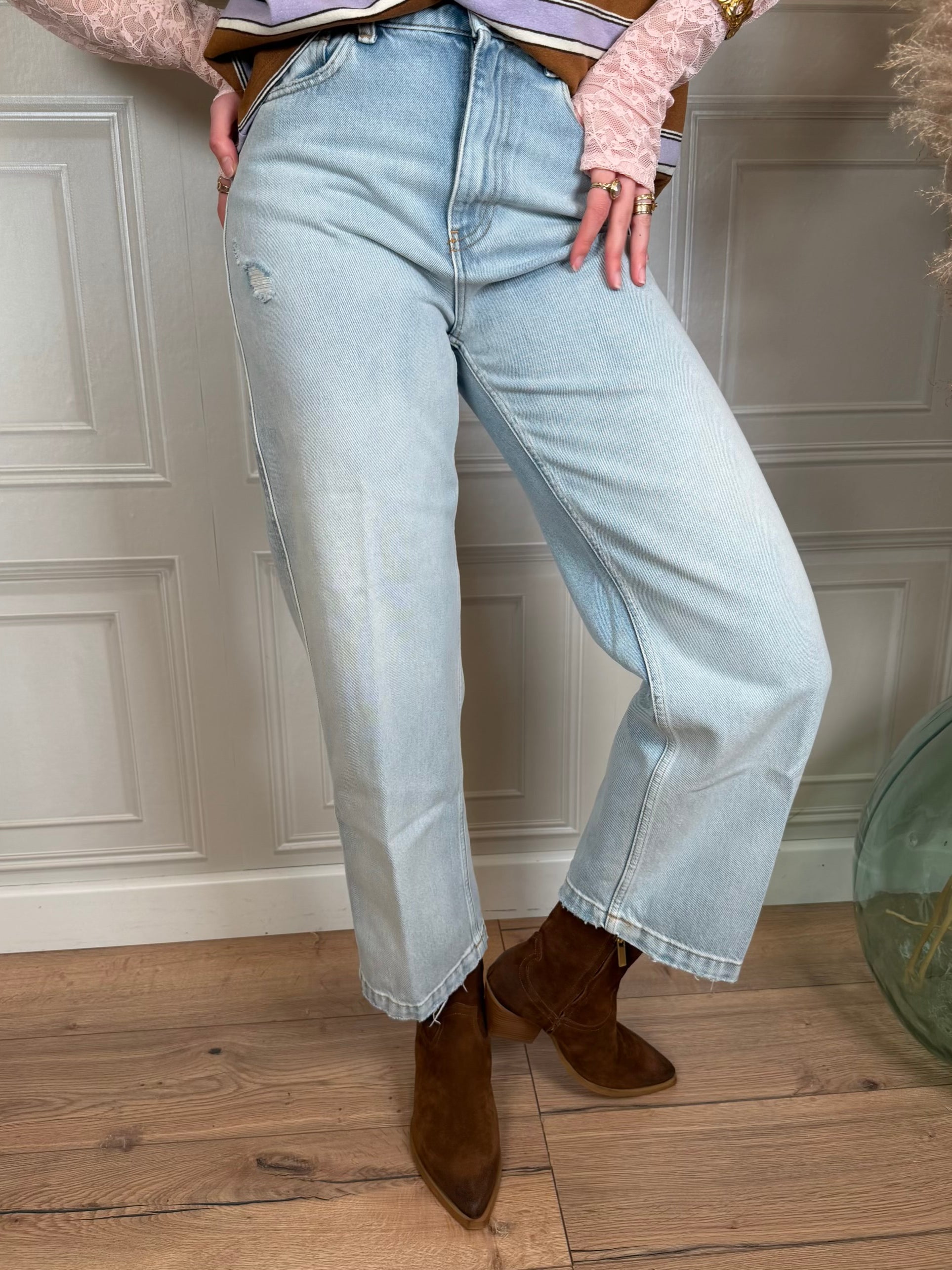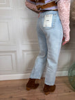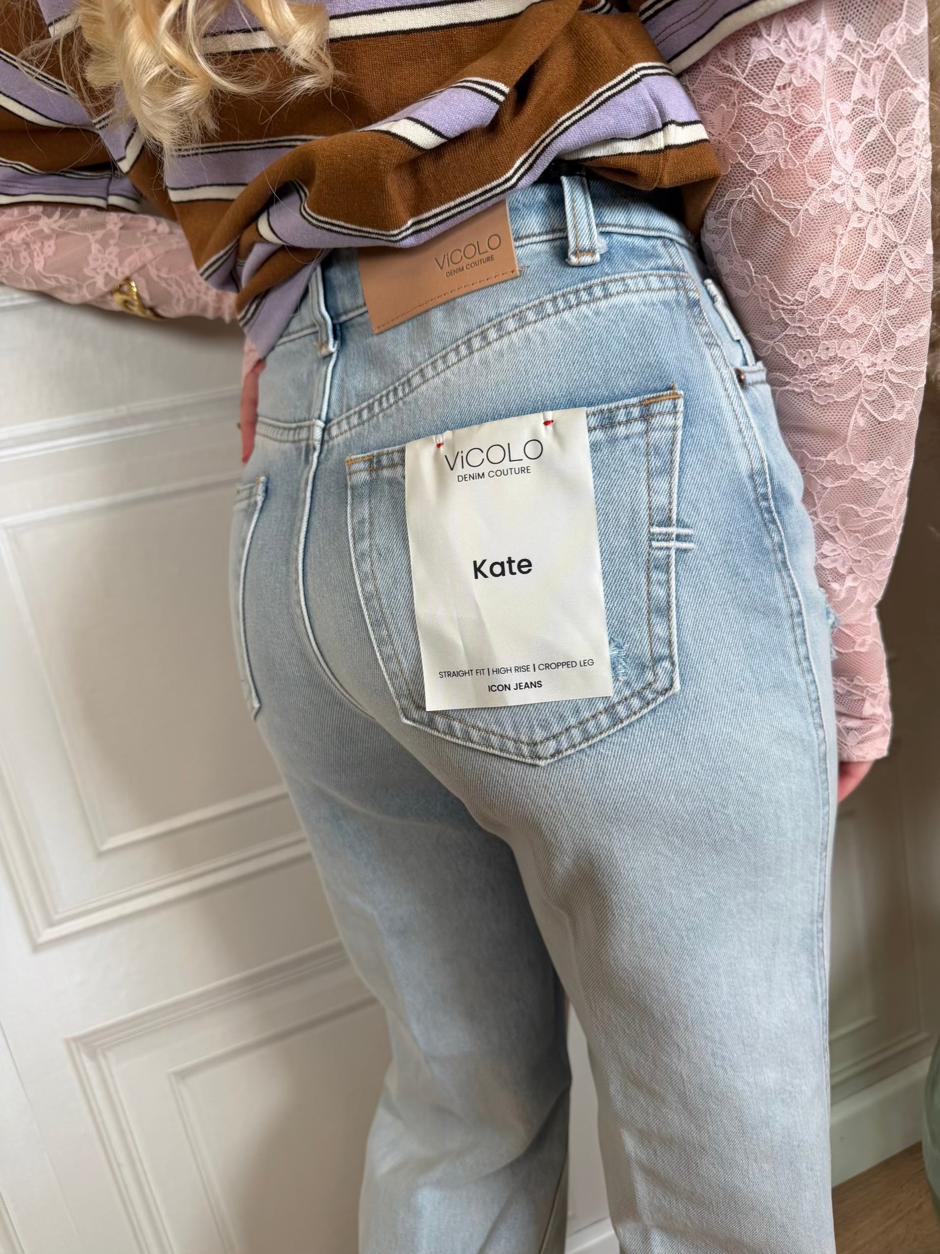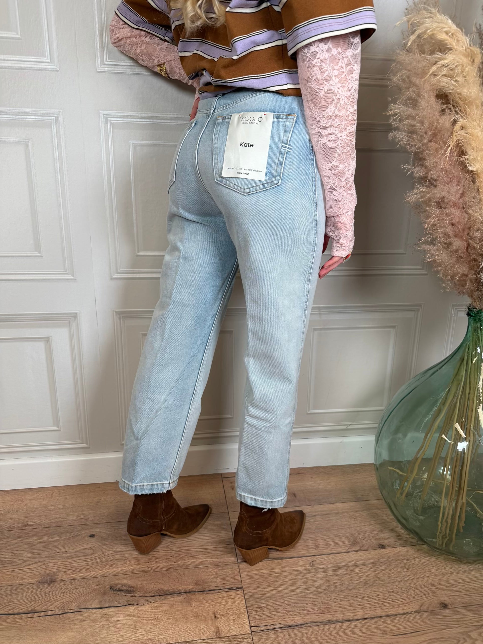 Jeans Kate denim chiaro con leggere abrasioni. Modello straight fit cropped leg, a vita alta. 5 tasche, chiusura frontale con zip e bottone.