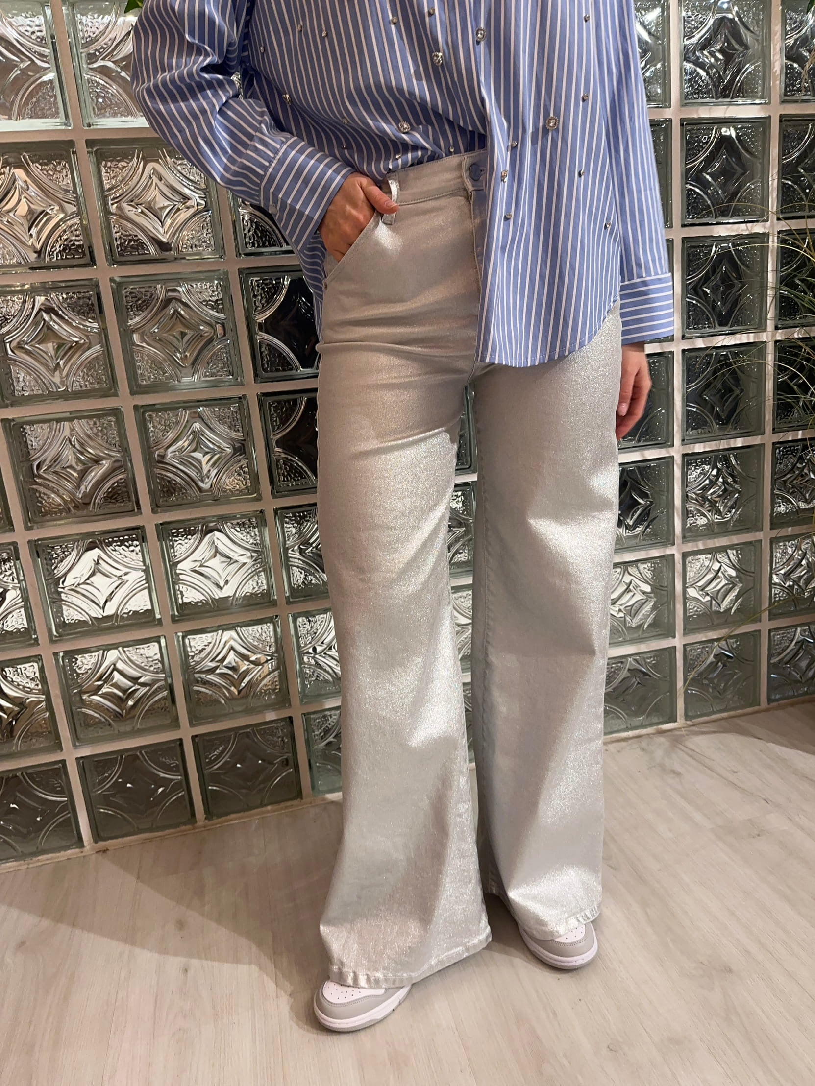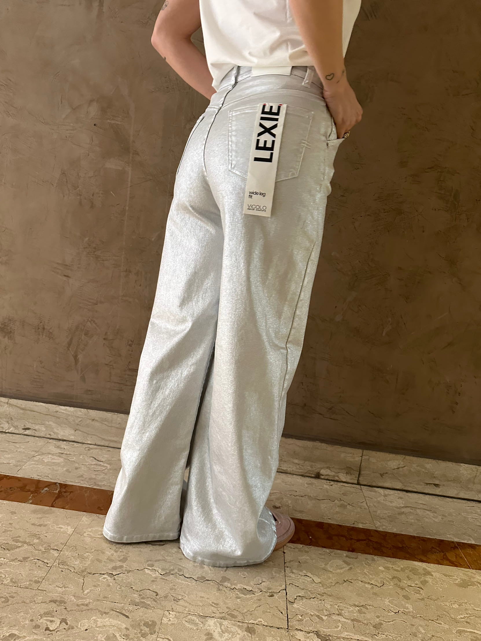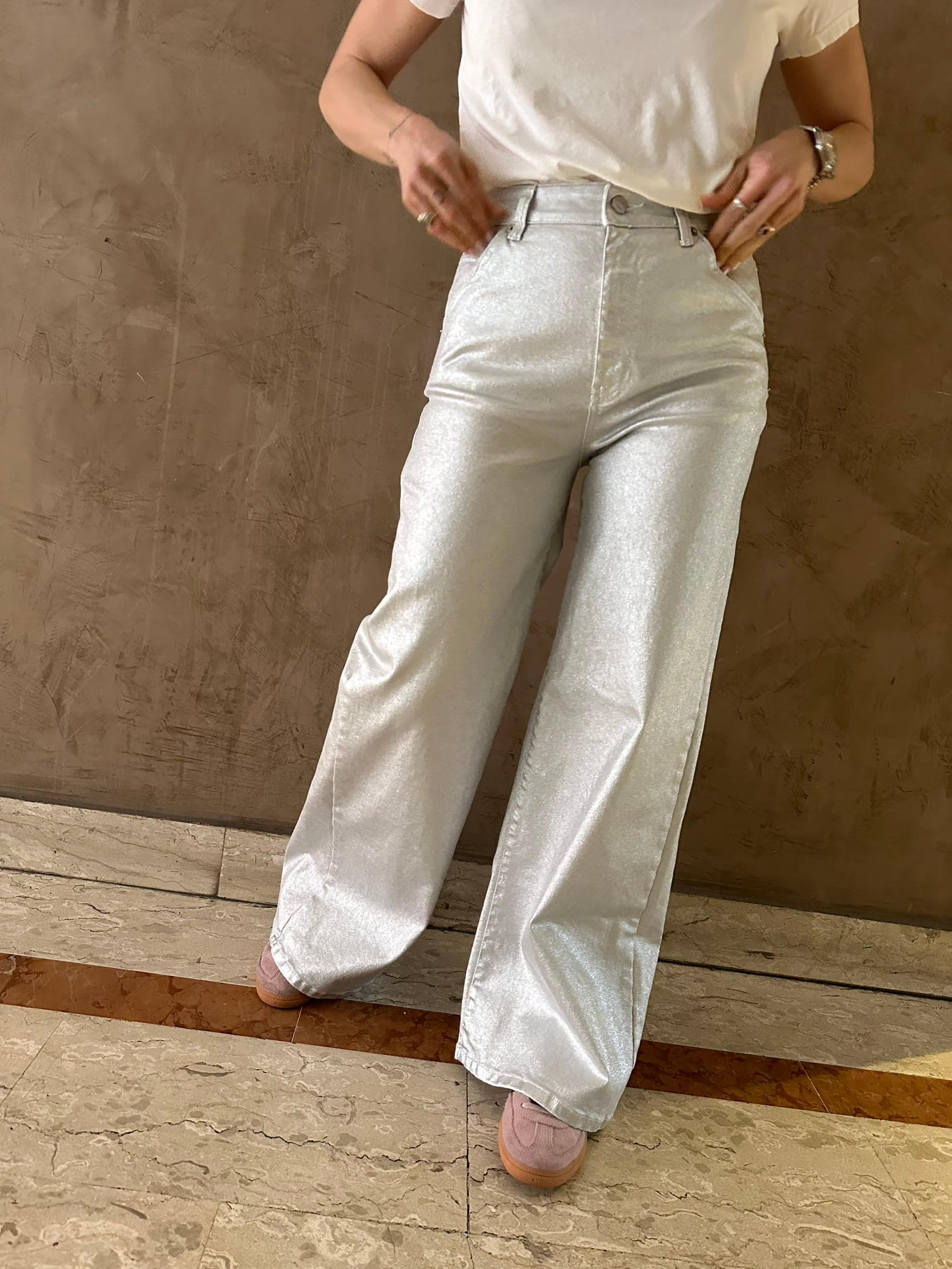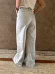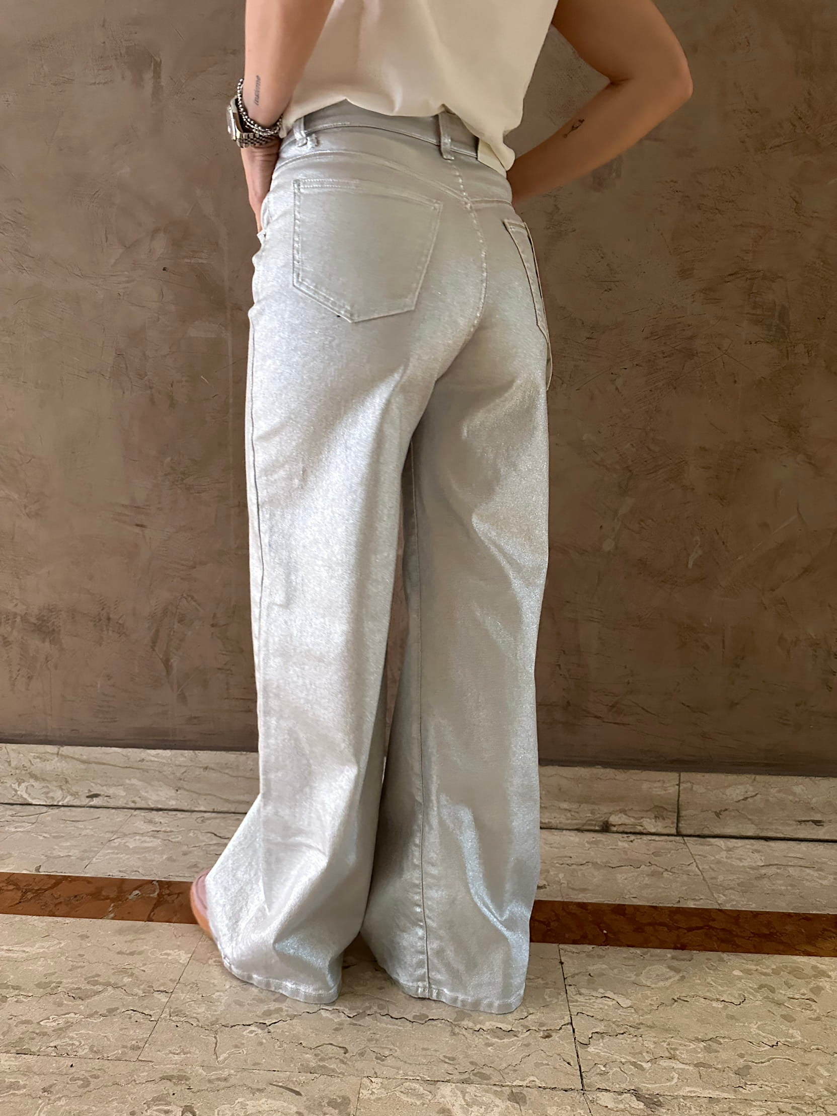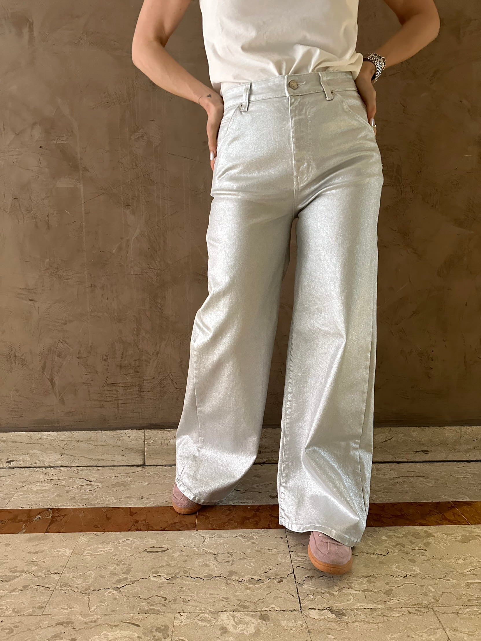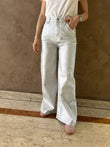 Modello wide leg 5 tasche a vita regolare. Gamba larga.