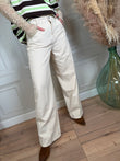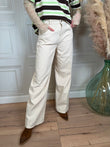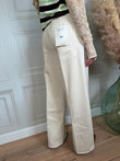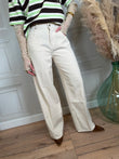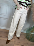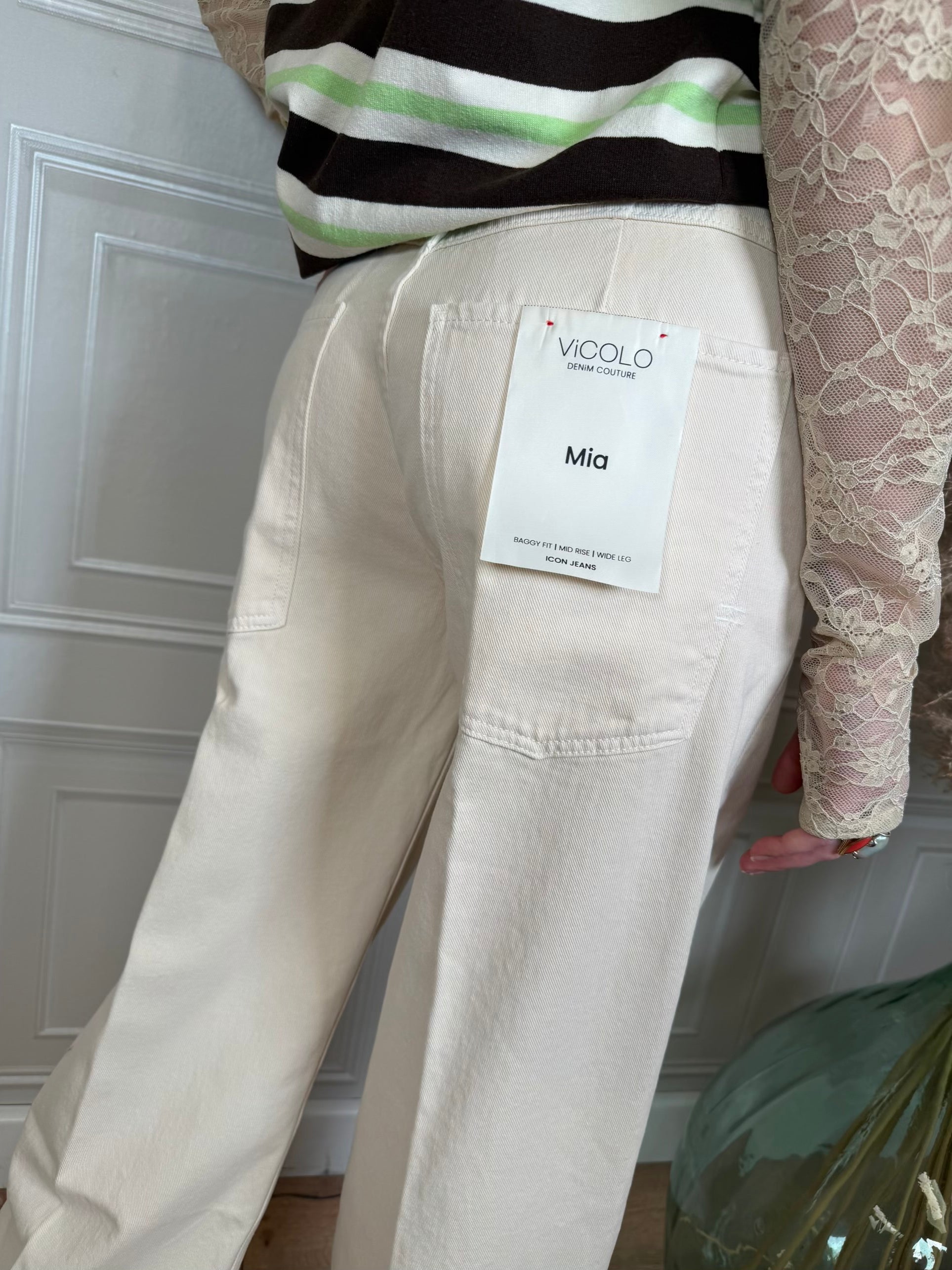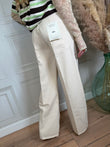 Jeans Mia color burro. modello cinque tasche. Chiusura frontale con zip e bottone in metallo. Vita alta e gamba ampia. In foto taglia XS, vestibilita’ leggermente morbida.