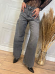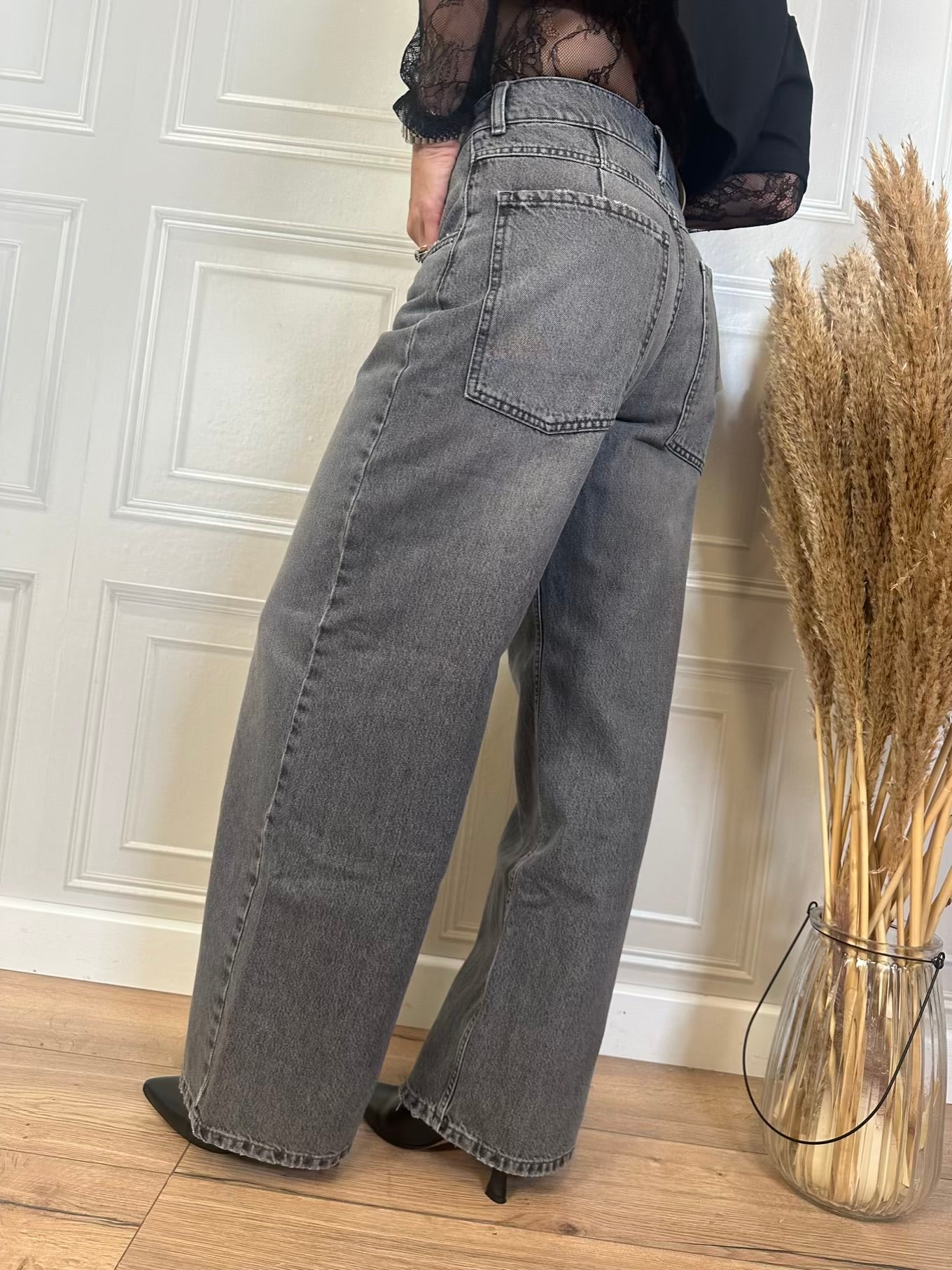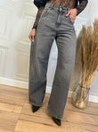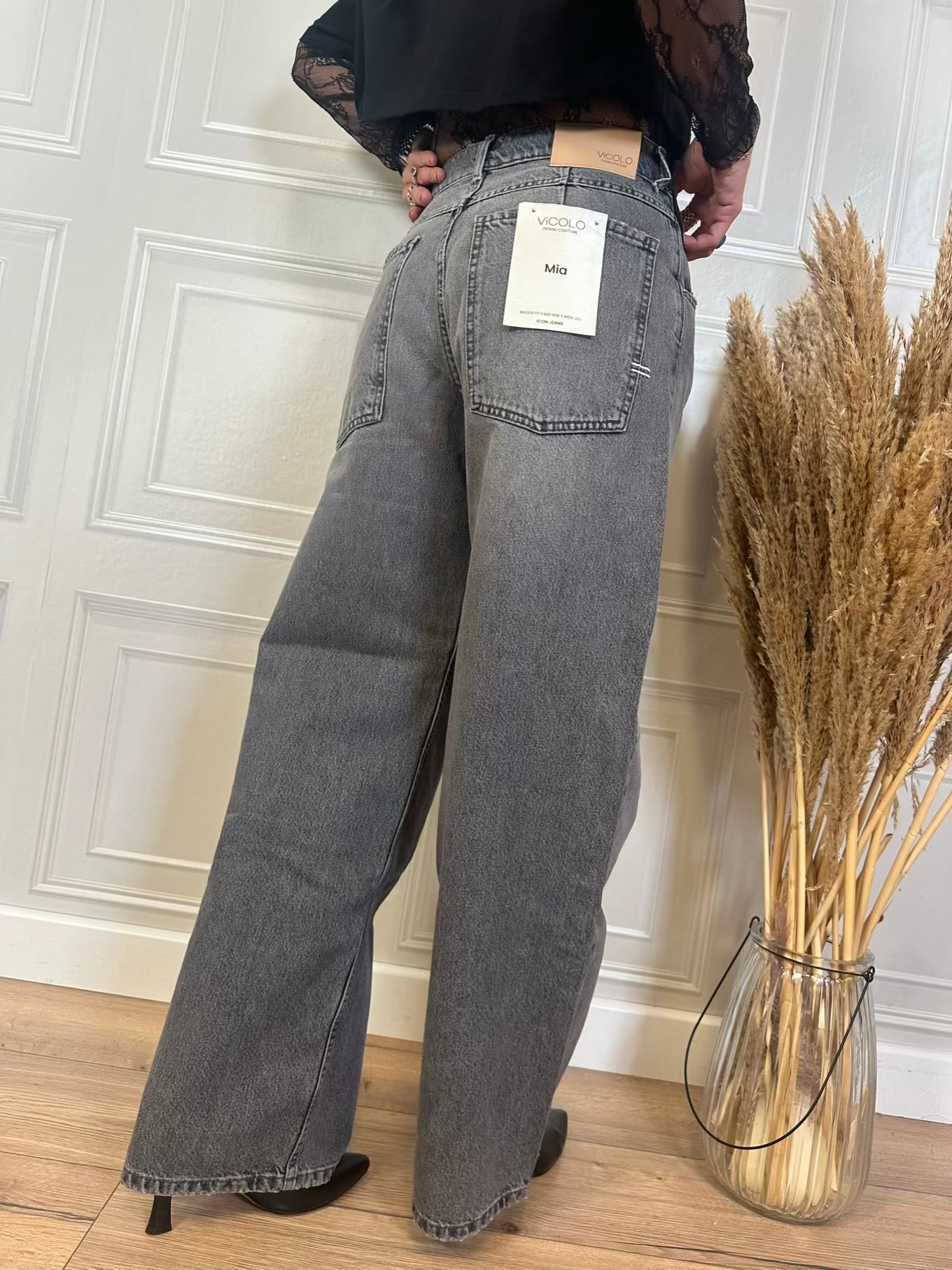 Jeans Mia modello baggy fit cinque tasche. Chiusura frontale con zip e bottone. Vita media e gamba ampia. In foto taglia XS, vestibilita’ morbida.