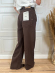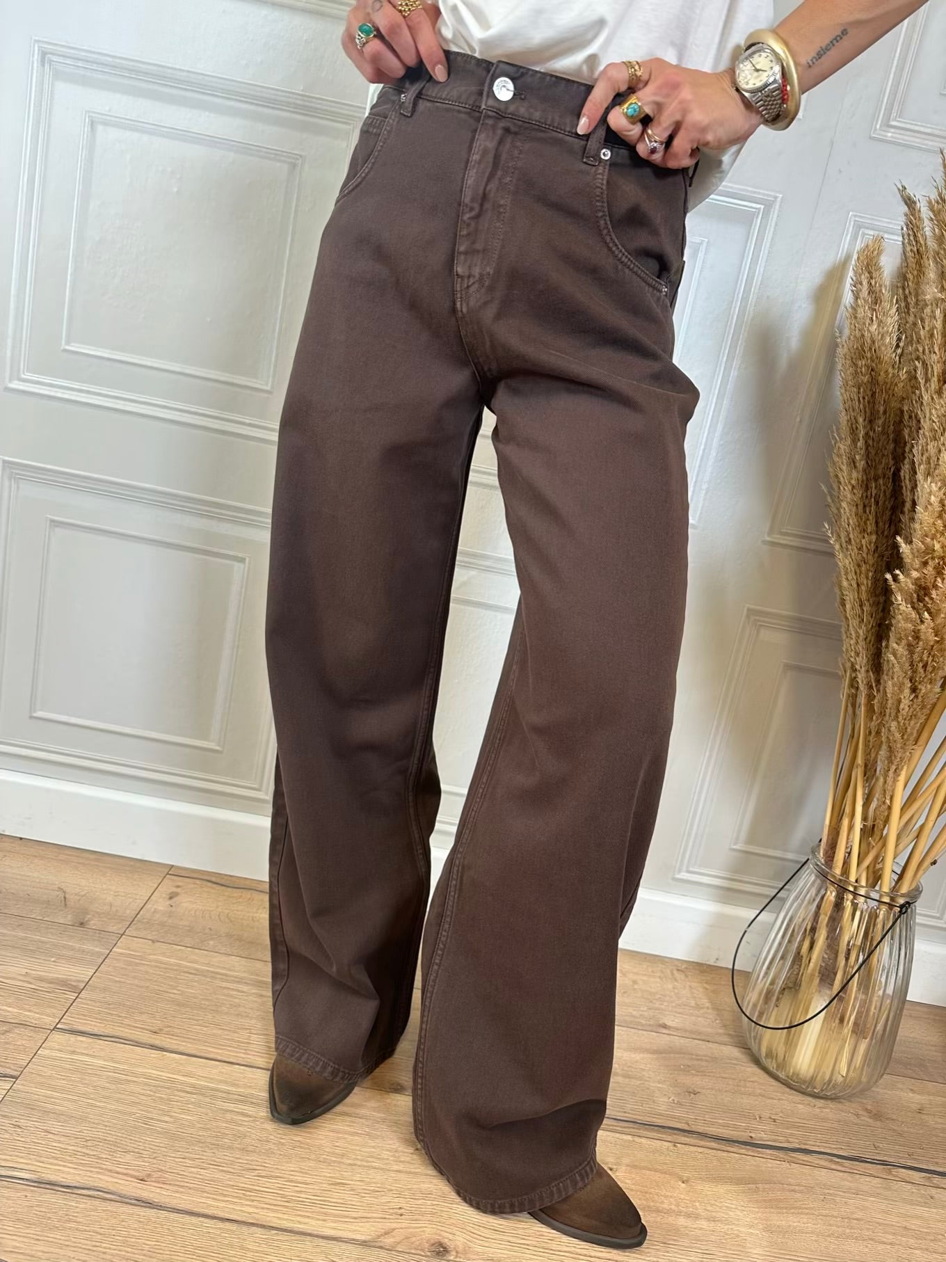 Jeans Mia modello baggy fit cinque tasche. Chiusura frontale con zip e bottone. Vita media e gamba ampia. In foto taglia XS, vestibilita’ morbida.