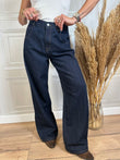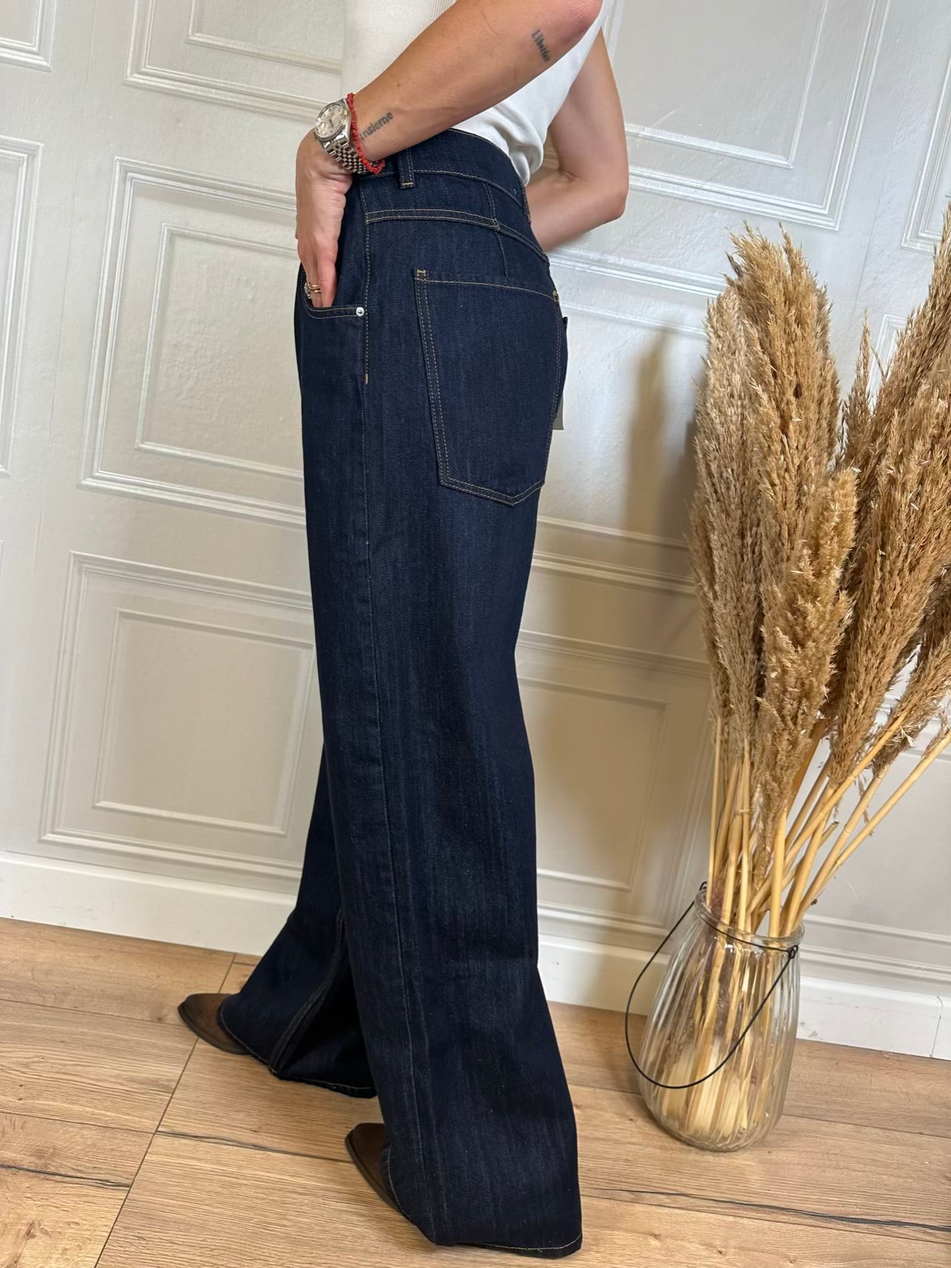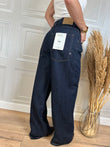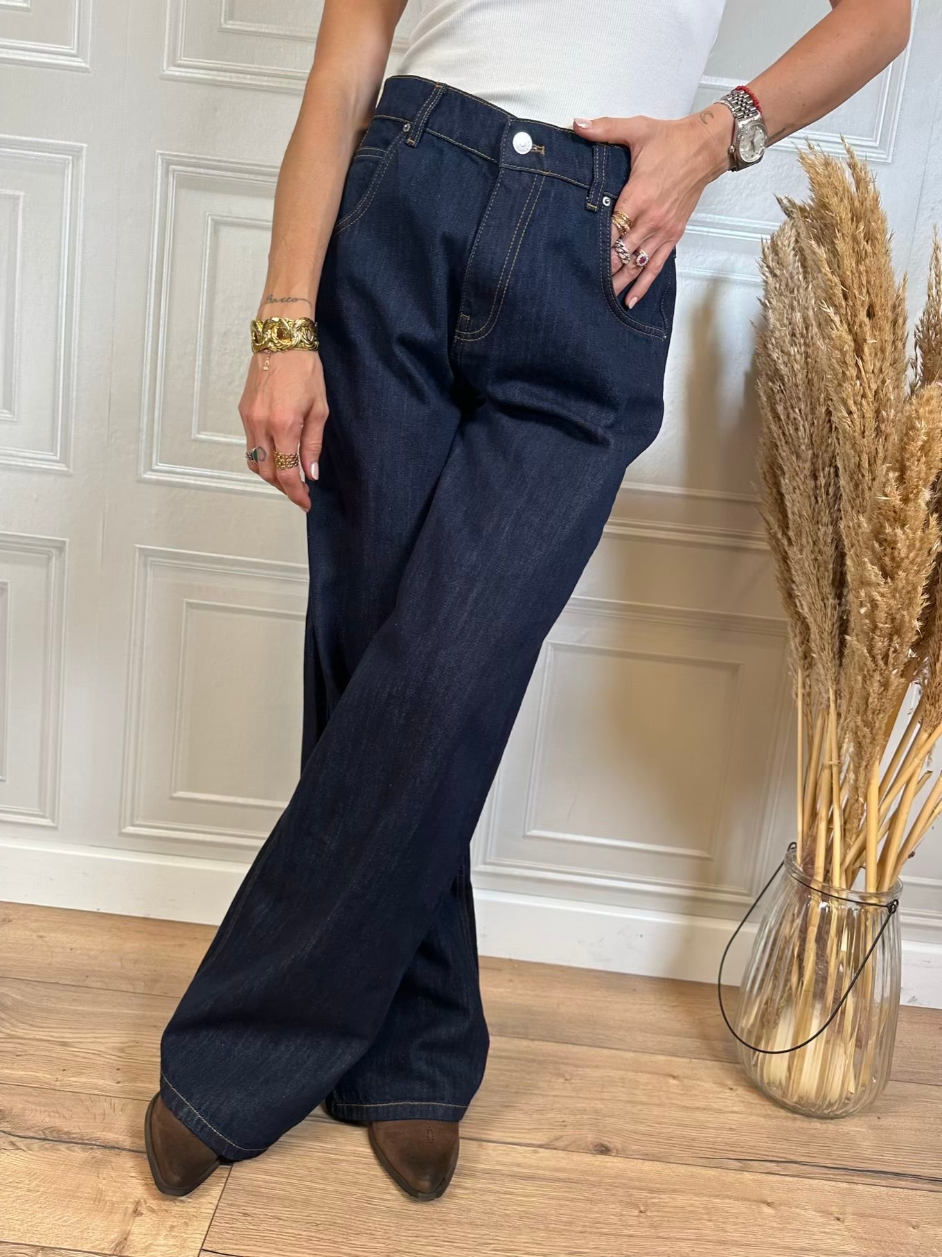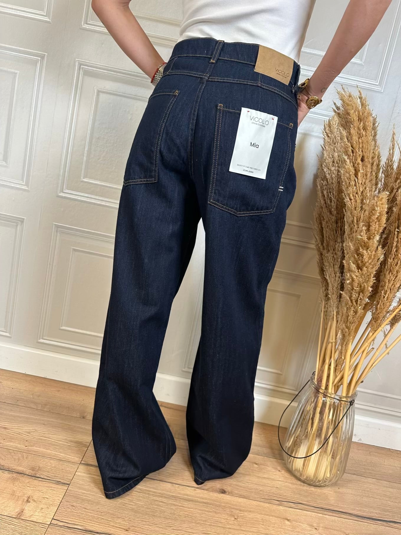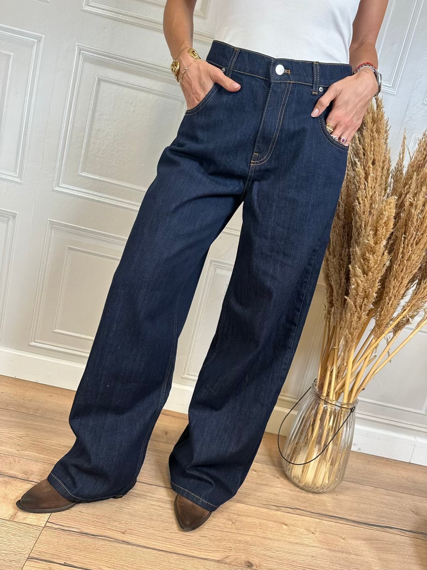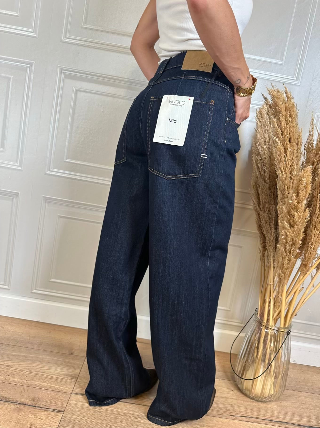 Jeans Mia modello baggy fit cinque tasche. Chiusura frontale con zip e bottone. Vita media e gamba ampia. In foto taglia XS, vestibilita’ morbida.
