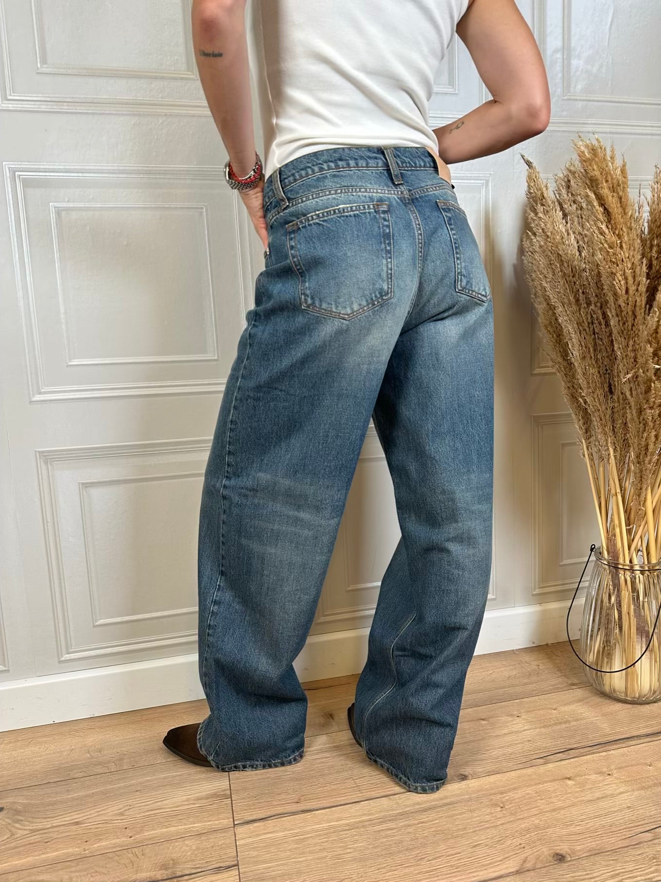 Jeans Xenobia modello cinque tasche. Chiusura frontale con zip e bottoni gioiello. Vita alta e gamba leggermente ampia. In foto taglia XS, vestibilita’ morbida.