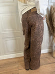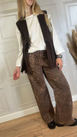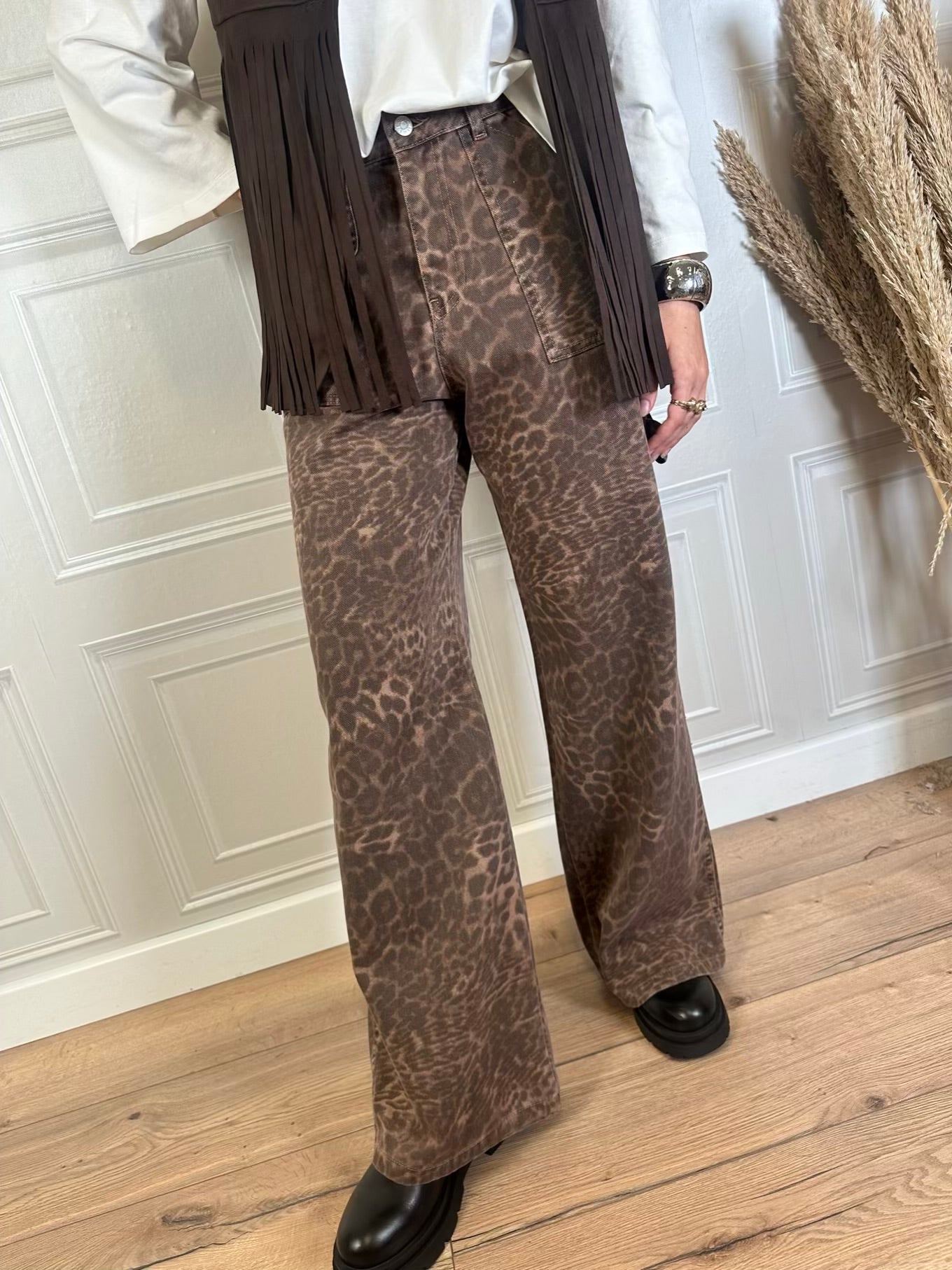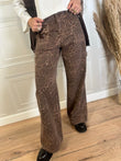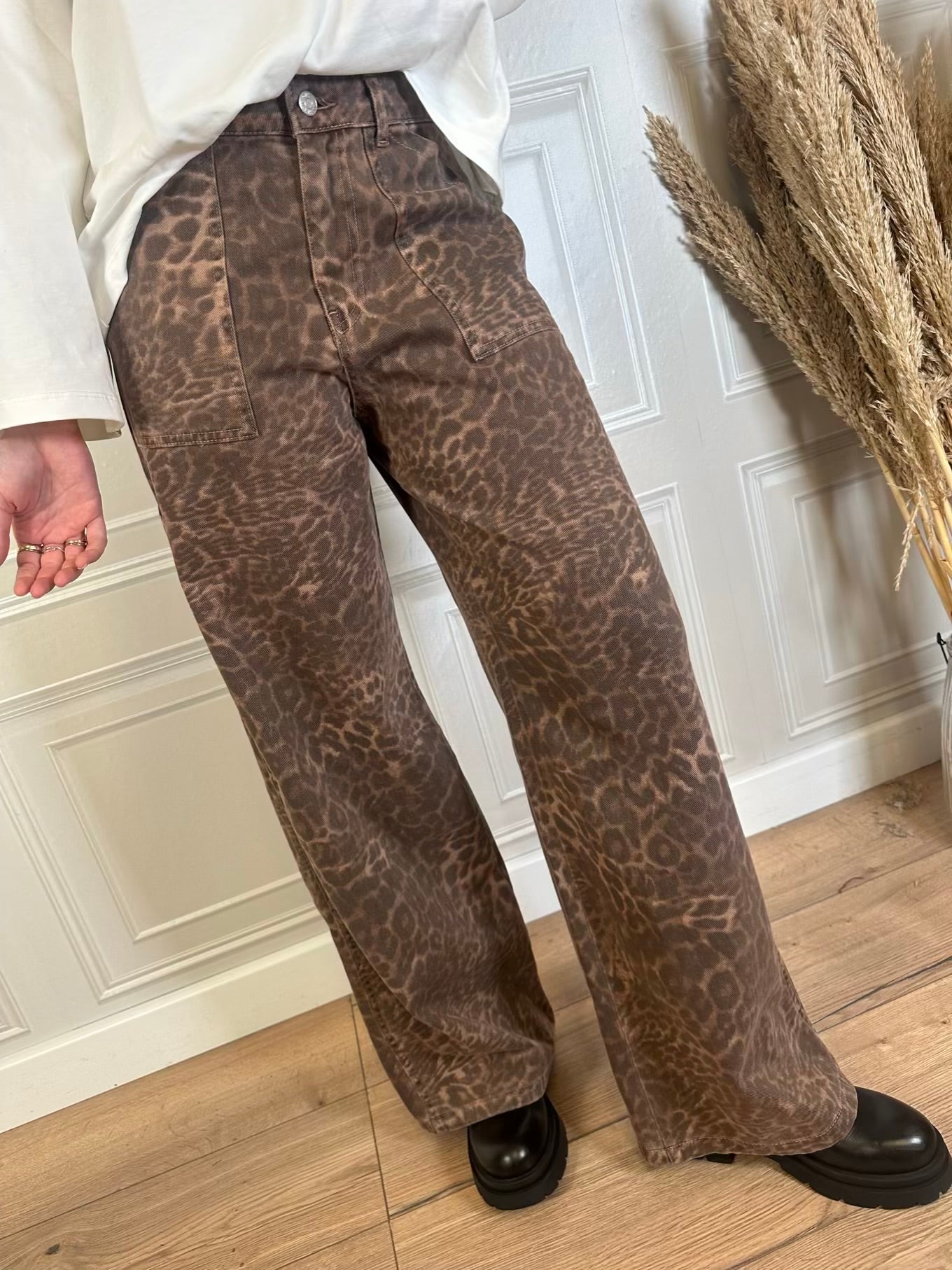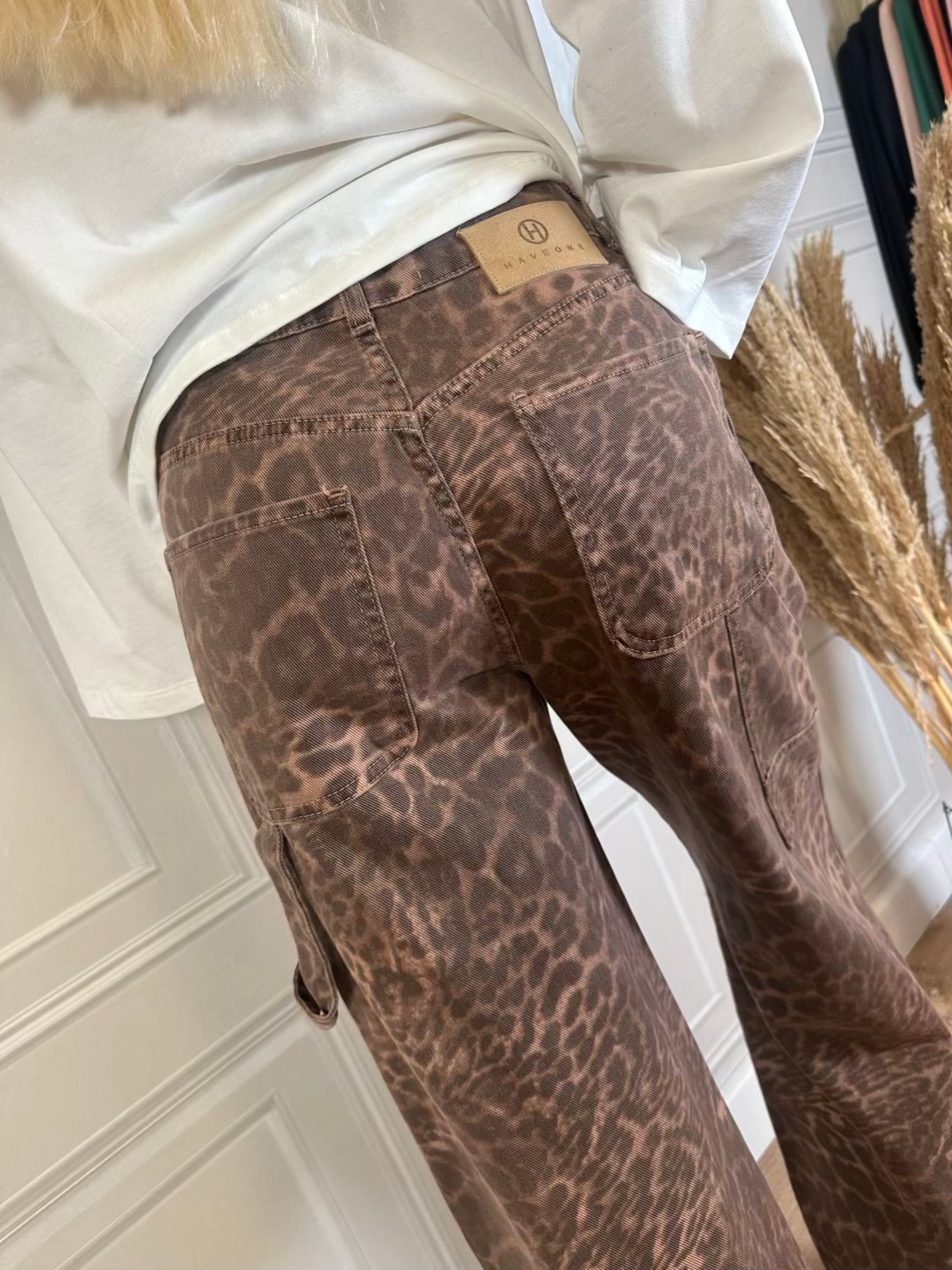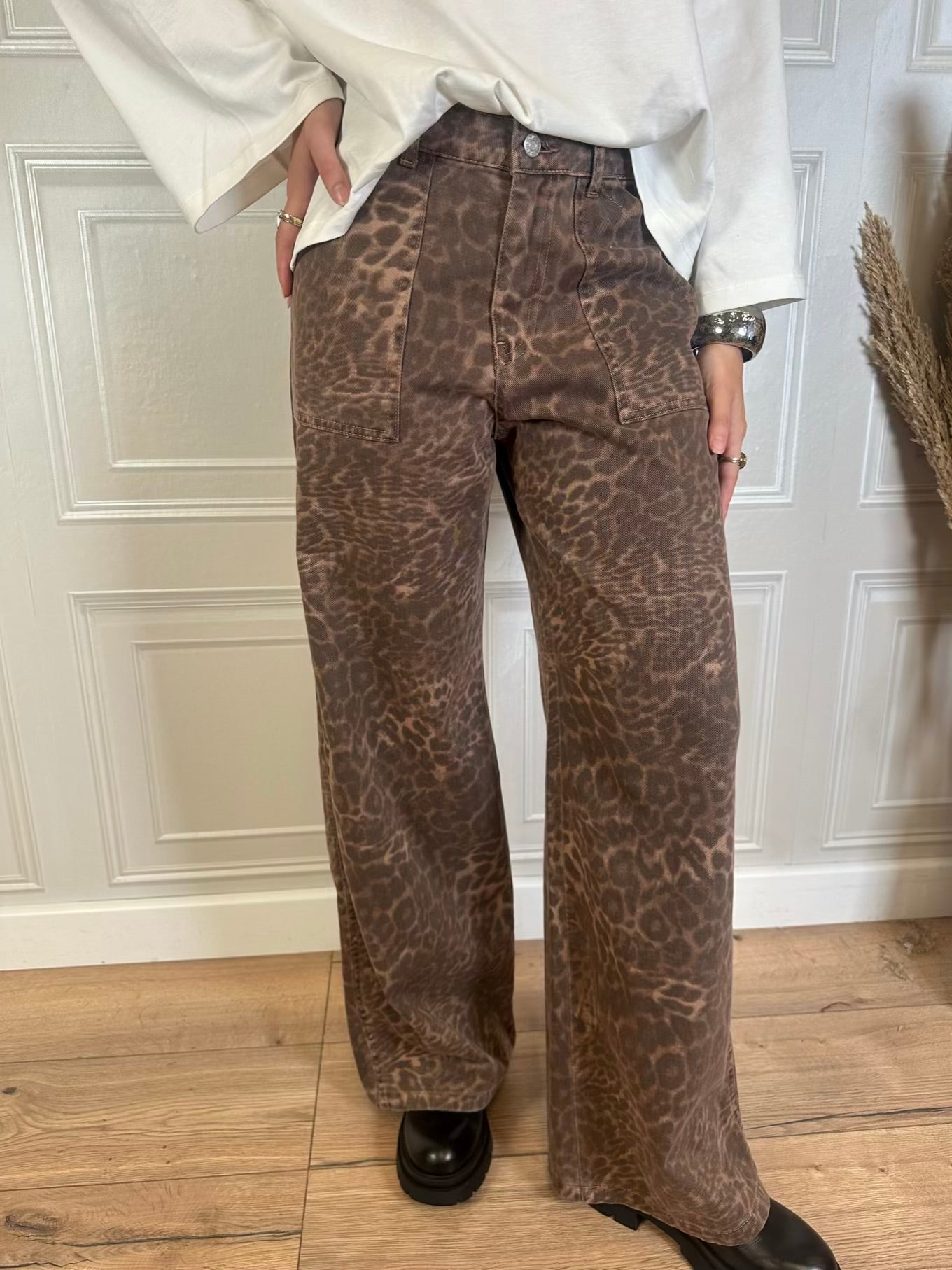 Jeans Mine maculato. Modello wide leg fit a media media, stile worder con maxi tasche e laccetto laterale.