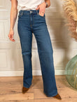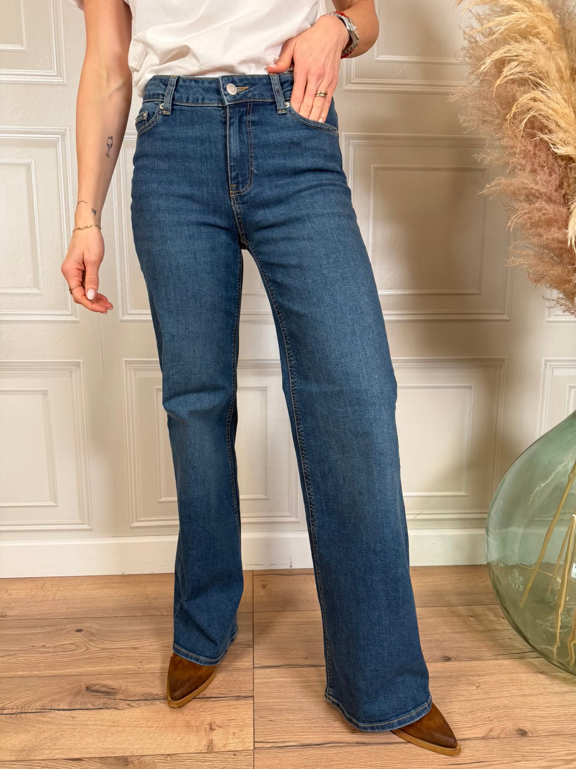 Jeans modello Rome, lavaggio denim. Modello flared leg, a vita media, regular fit.