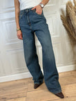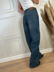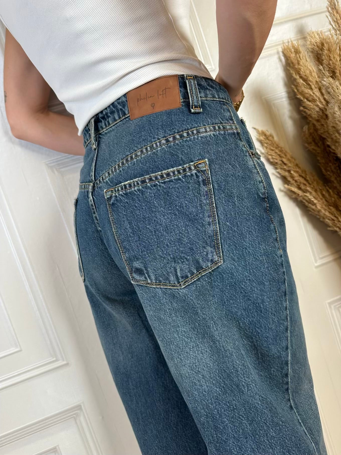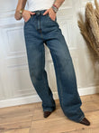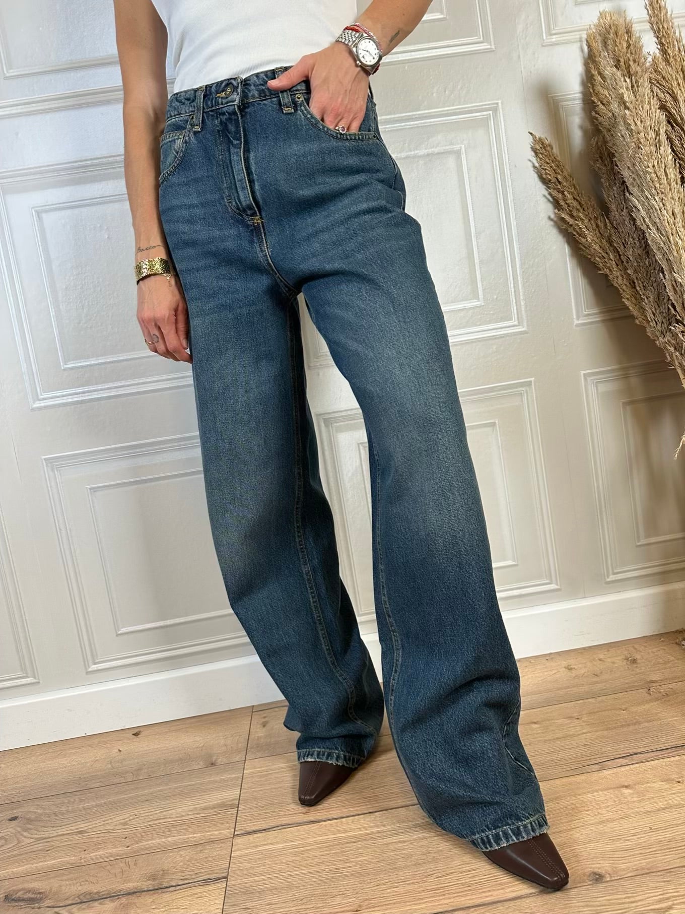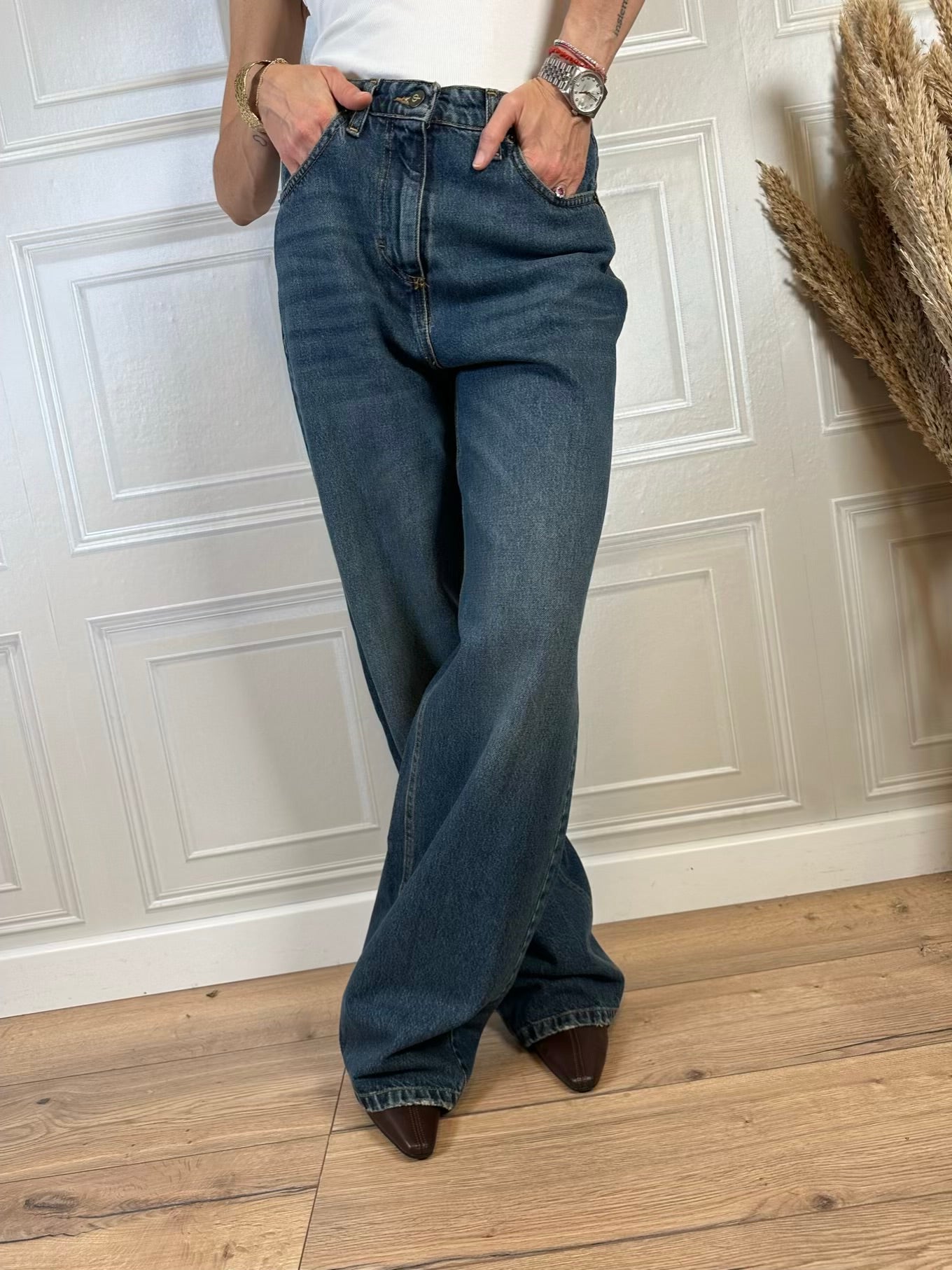 Jeans modello wide leg fit cinque tasche. Chiusura frontale con zip e bottone. Vita medio alta gamba ampia. In foto taglia S, vestibilita’ regolare .