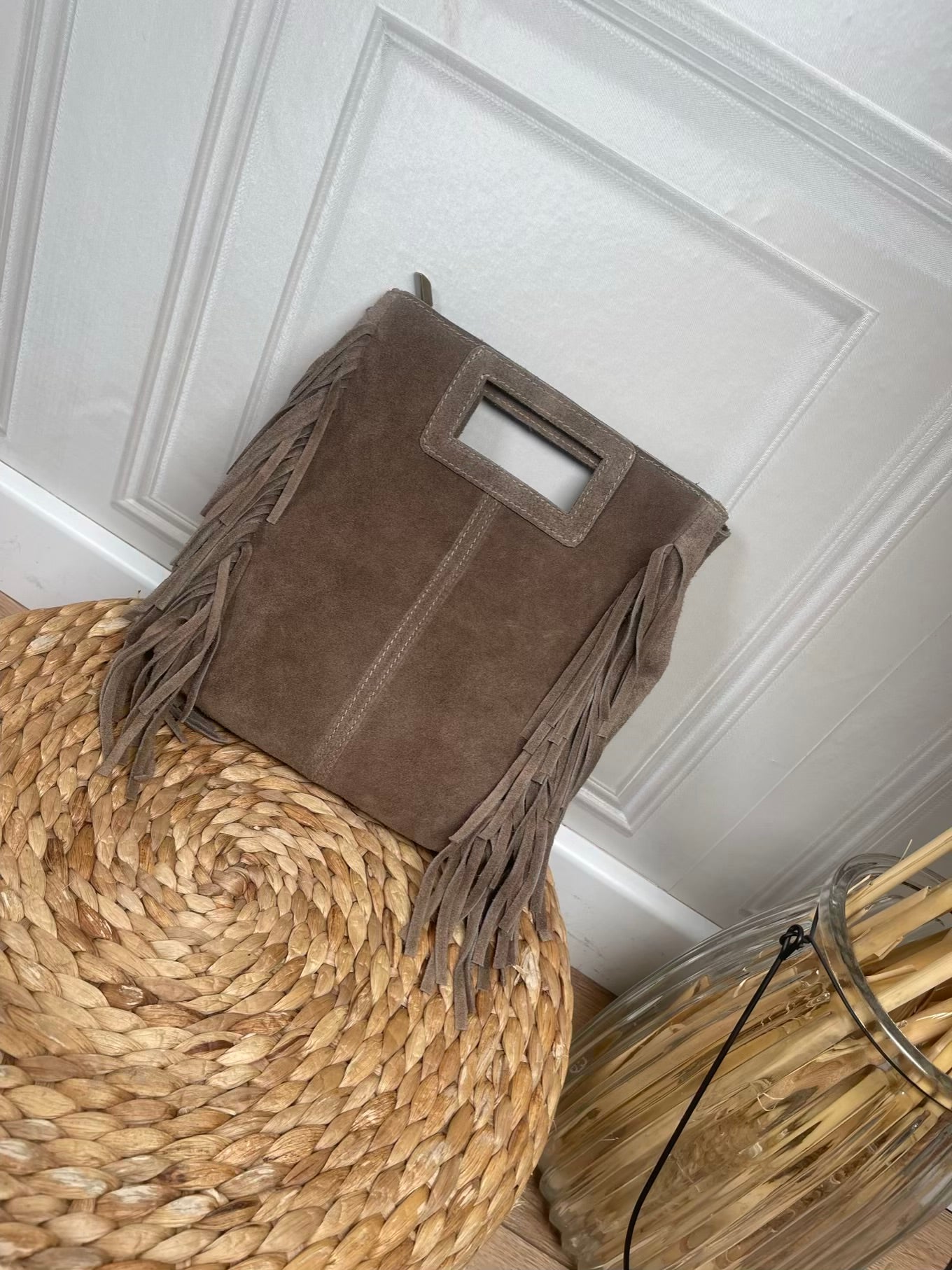 Borsa in pelle scamosciata con frange laterali. Modello quadrato con cut out per portarla a mano.