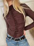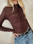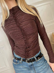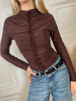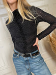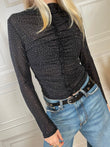 Maglia velata a manica lunga. Modello tempestato di strass con arricciatura.