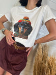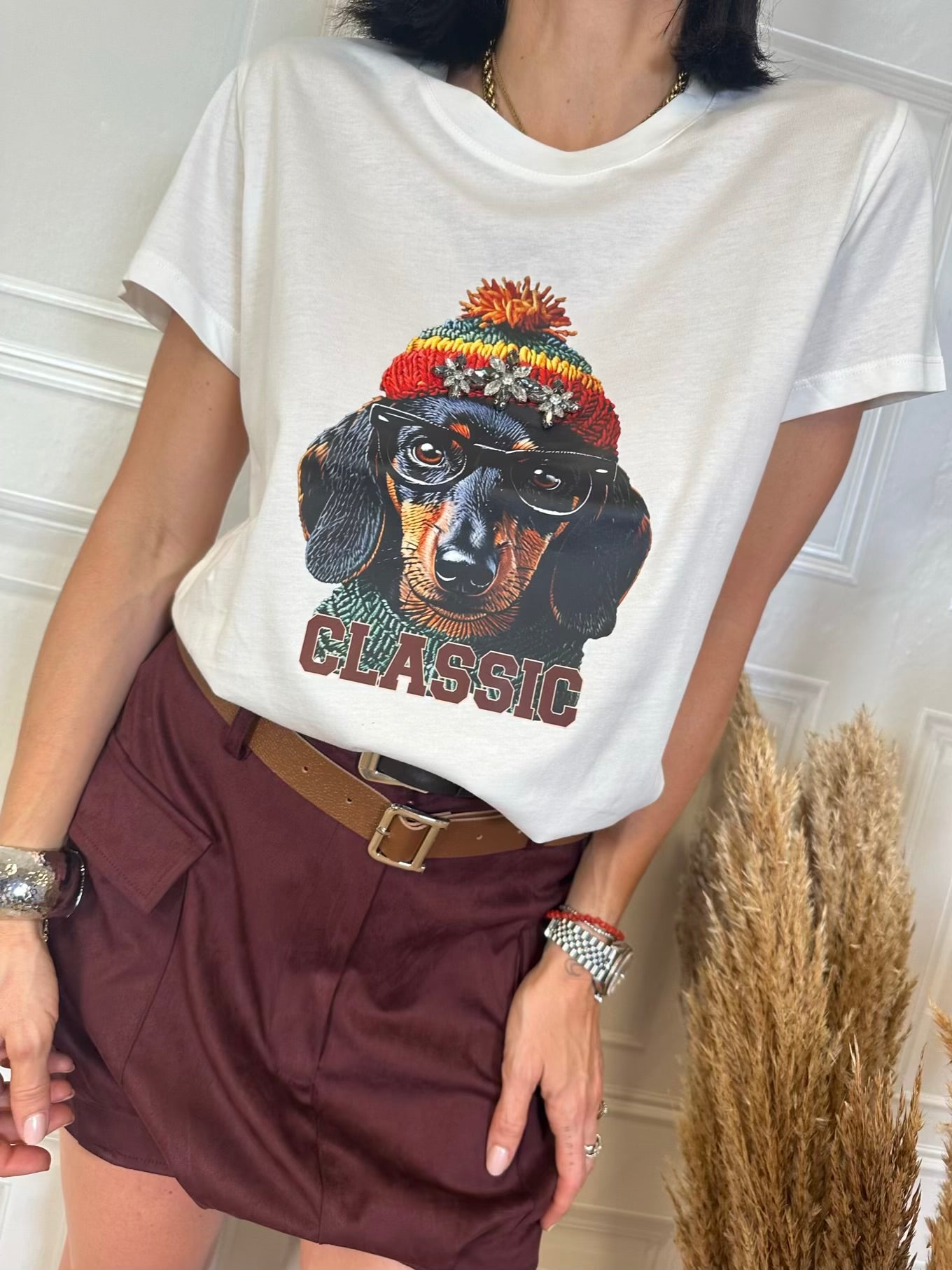 T-shirt con bassotto dal berretto in lana, dettaglio strass.