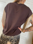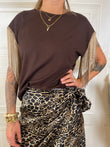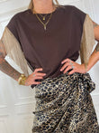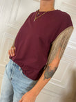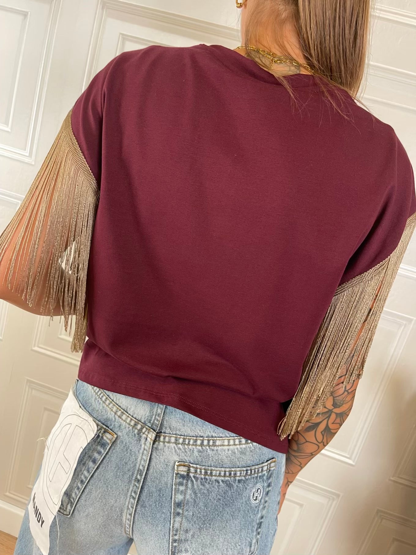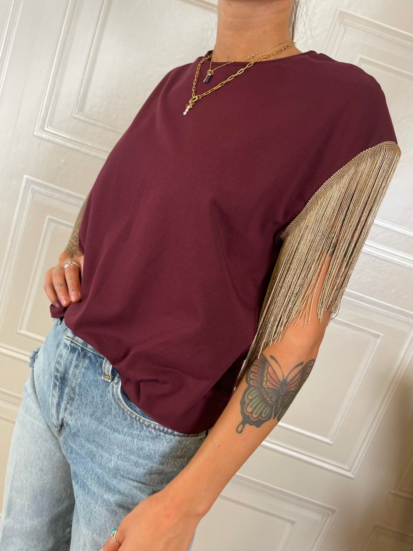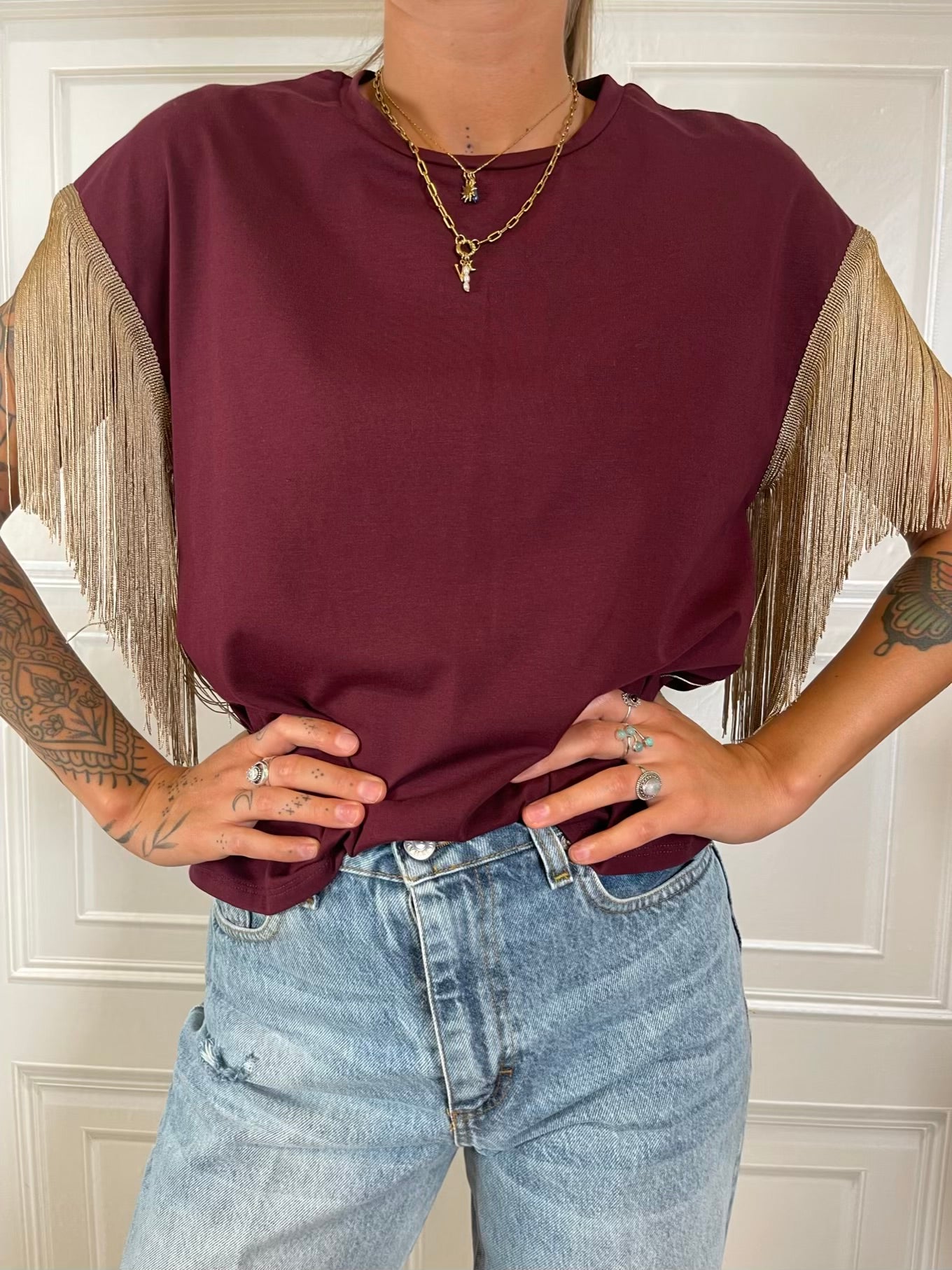 T-shirt girocollo a tinta unita, dettaglio di frange sulle spalle.