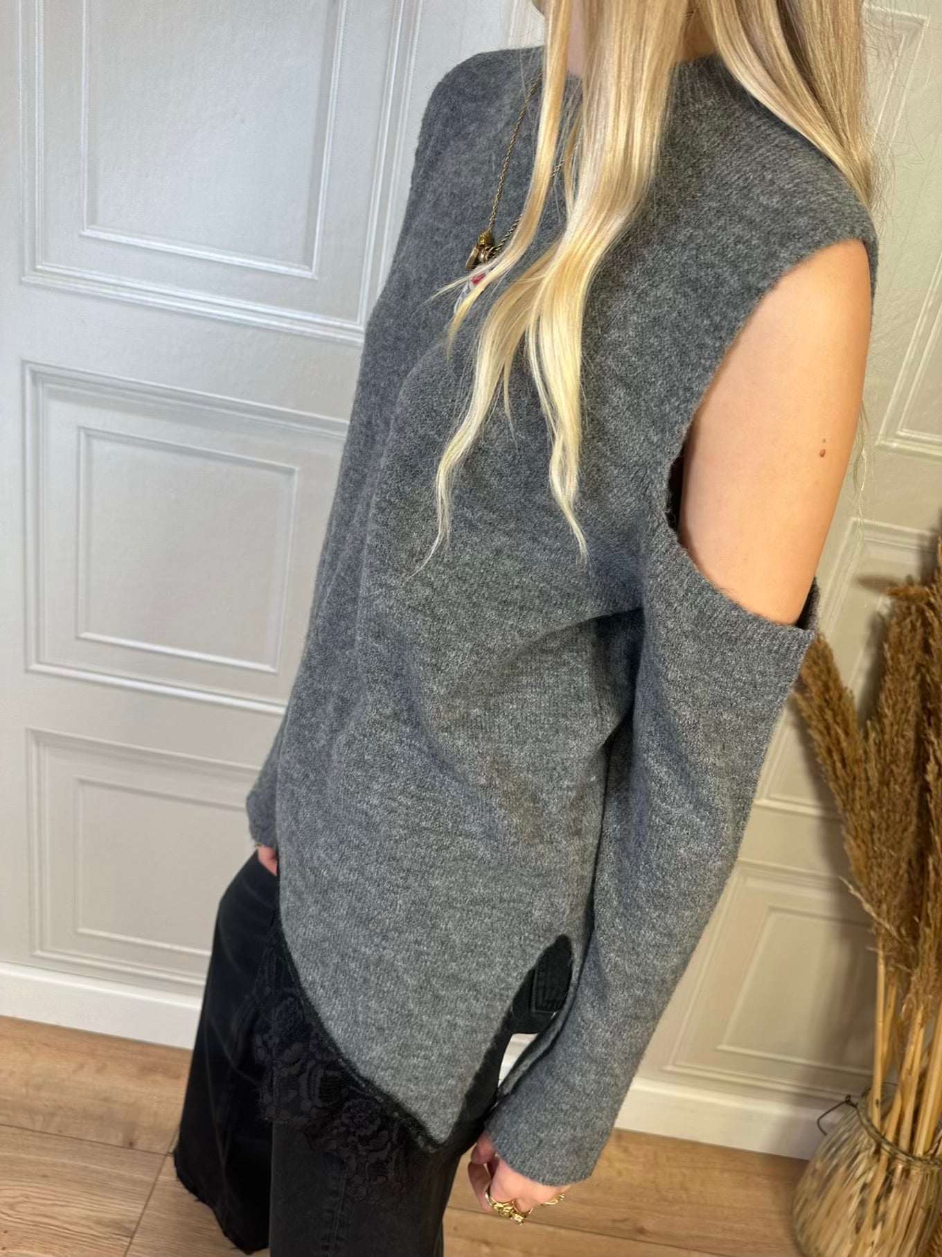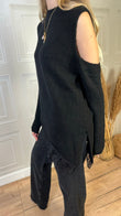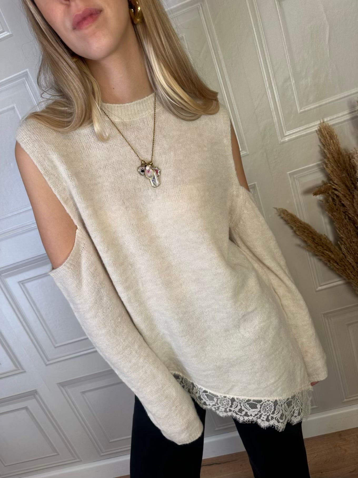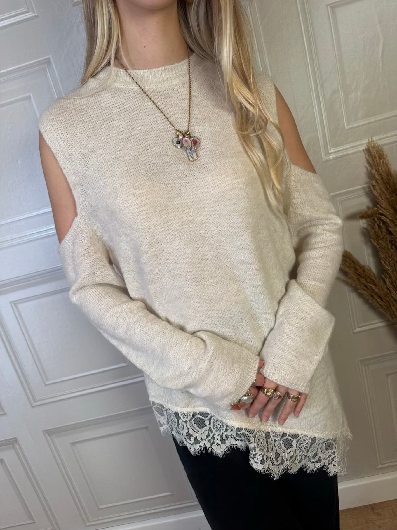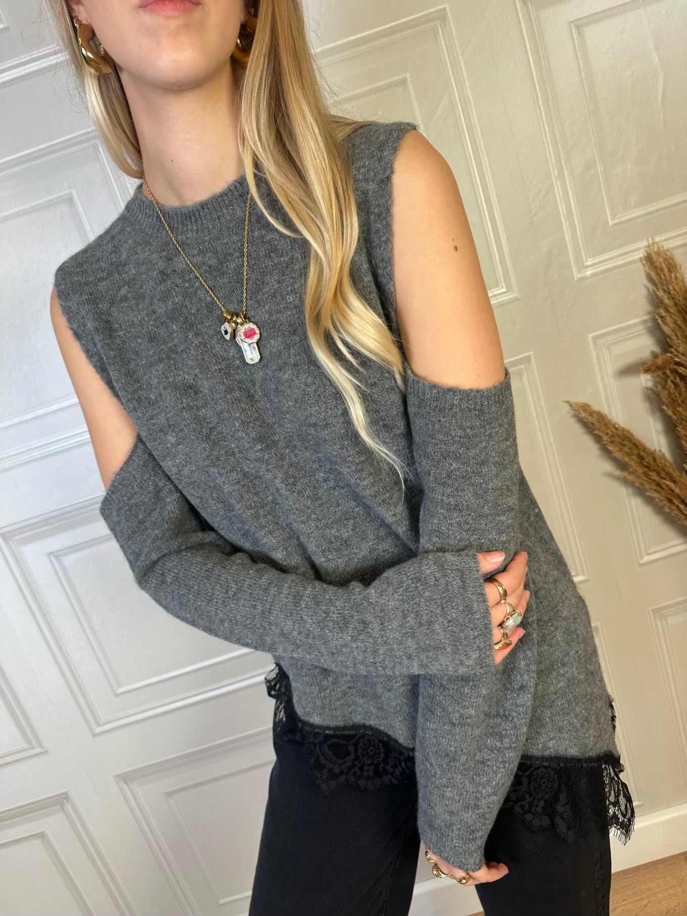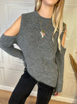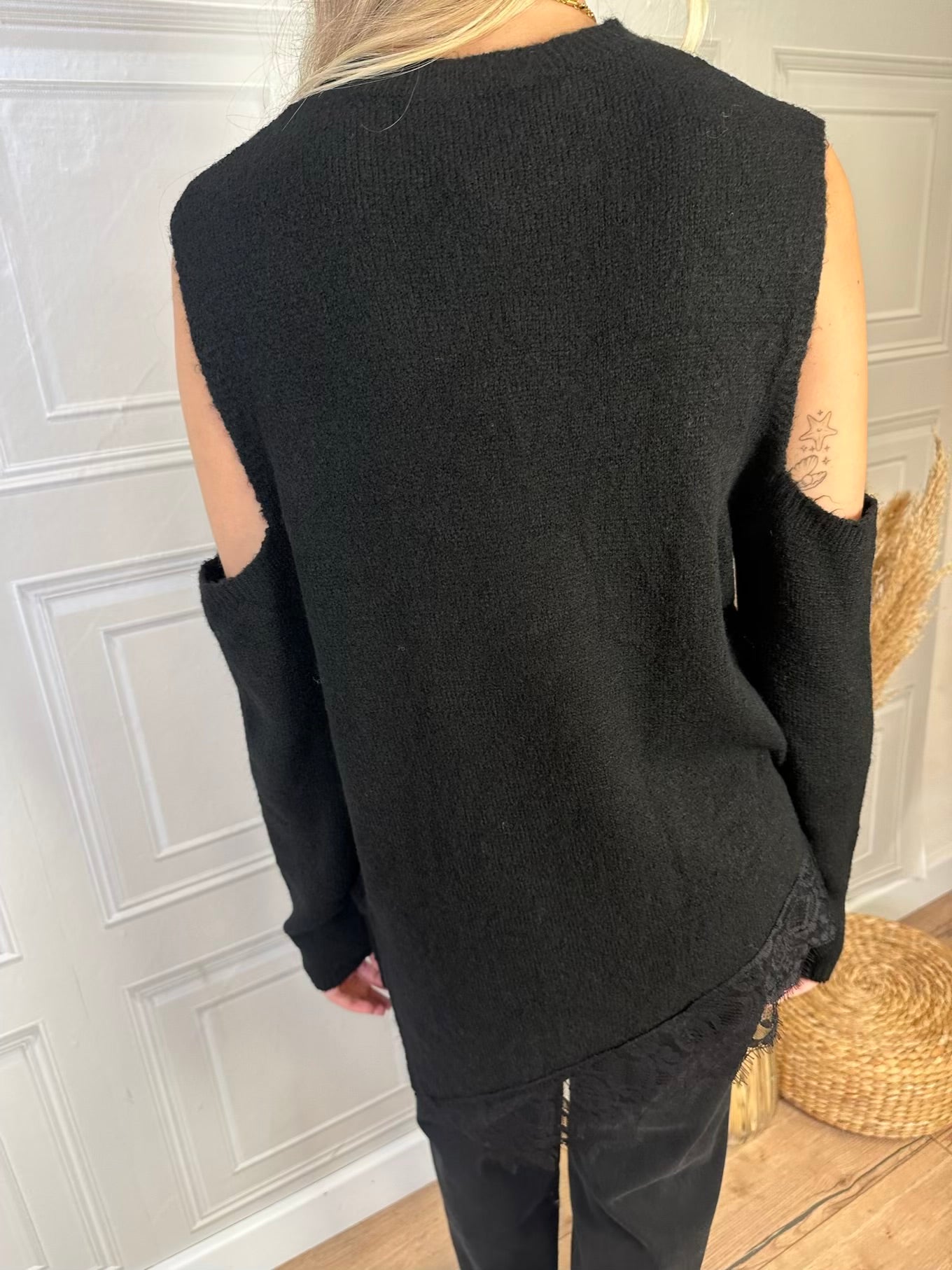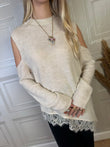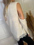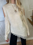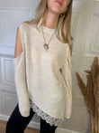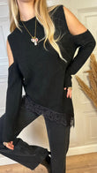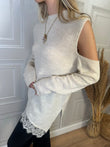 Maglia con spalle cut out, fondo asimmetrico con bordatura in pizzo e spacchi laterali. Taglia unica, vestibilità regolare.
