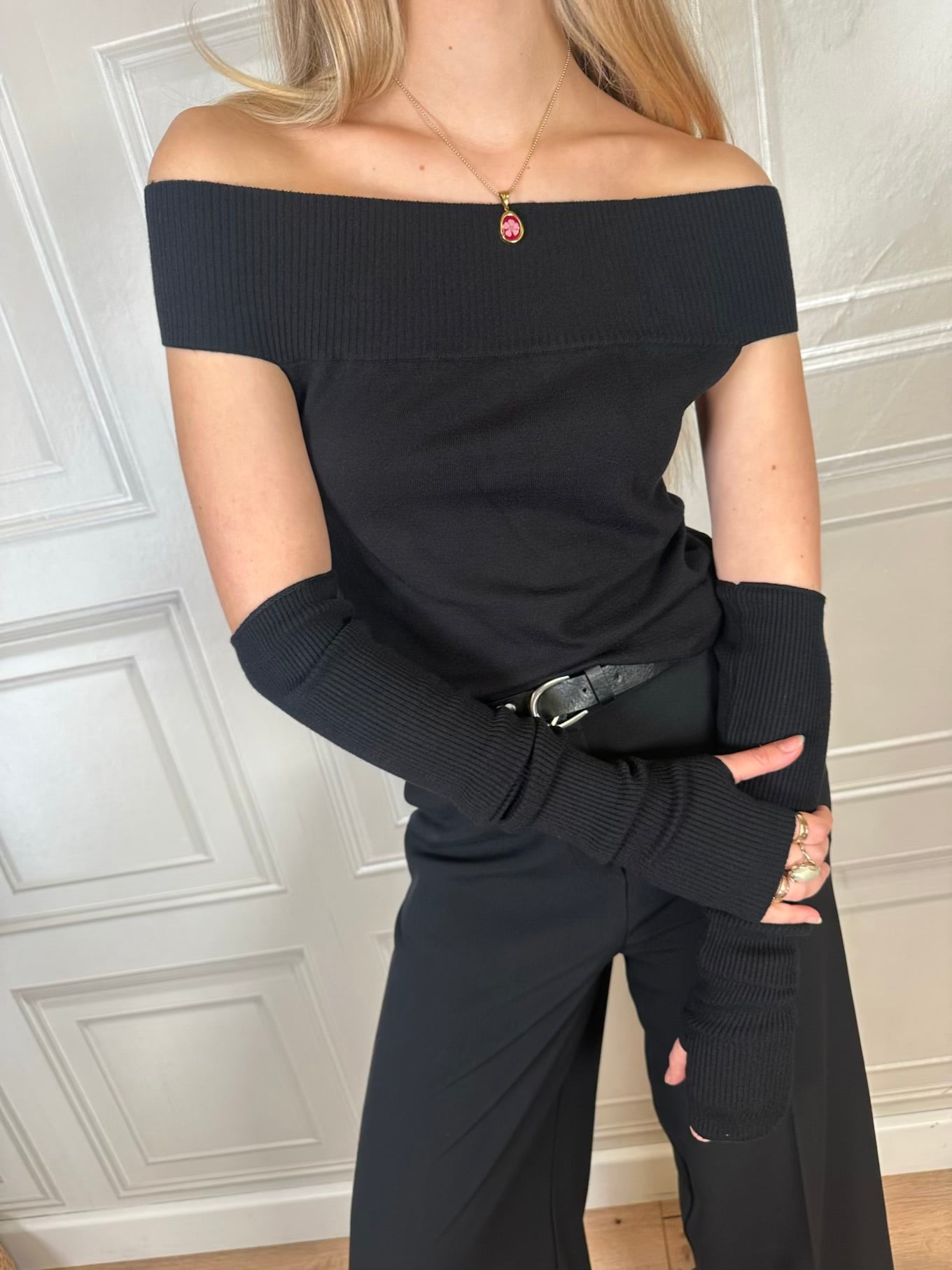 Maglia in caldo tessuto. Modello con scollo Carmen, dotato di manicotti.
